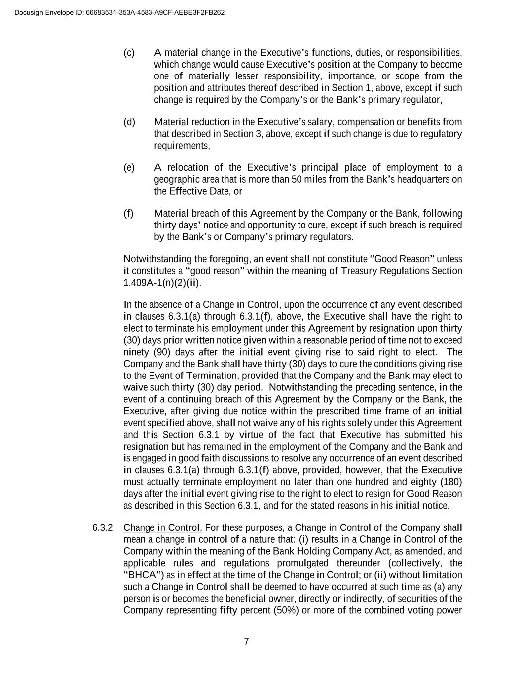 7 (c) A material change in the Executive’s functions, duties, or responsibilities, which change would cause Executive’s position at the Company to become one of materially lesser responsibility, importance, or scope from the position and attributes thereof described in Section 1, above, except if such change is required by the Company’s or the Bank’s primary regulator, (d) Material reduction in the Executive’s salary, compensation or benefits from that described in Section 3, above, except if such change is due to regulatory requirements, (e) A relocation of the Executive’s principal place of employment to a geographic area that is more than 50 miles from the Bank’s headquarters on the Effective Date, or (f) Material breach of this Agreement by the Company or the Bank, following thirty days’ notice and opportunity to cure, except if such breach is required by the Bank’s or Company’s primary regulators. Notwithstanding the foregoing, an event shall not constitute “Good Reason” unless it constitutes a “good reason” within the meaning of Treasury Regulations Section 1.409A-1(n)(2)(ii). In the absence of a Change in Control, upon the occurrence of any event described in clauses 6.3.1(a) through 6.3.1(f), above, the Executive shall have the right to elect to terminate his employment under this Agreement by resignation upon thirty (30) days prior written notice given within a reasonable period of time not to exceed ninety (90) days after the initial event giving rise to said right to elect. The Company and the Bank shall have thirty (30) days to cure the conditions giving rise to the Event of Termination, provided that the Company and the Bank may elect to waive such thirty (30) day period. Notwithstanding the preceding sentence, in the event of a continuing breach of this Agreement by the Company or the Bank, the Executive, after giving due notice within the prescribed time frame of an initial event specified above, shall not waive any of his rights solely under this Agreement and this Section 6.3.1 by virtue of the fact that Executive has submitted his resignation but has remained in the employment of the Company and the Bank and is engaged in good faith discussions to resolve any occurrence of an event described in clauses 6.3.1(a) through 6.3.1(f) above, provided, however, that the Executive must actually terminate employment no later than one hundred and eighty (180) days after the initial event giving rise to the right to elect to resign for Good Reason as described in this Section 6.3.1, and for the stated reasons in his initial notice. 6.3.2 Change in Control. For these purposes, a Change in Control of the Company shall mean a change in control of a nature that: (i) results in a Change in Control of the Company within the meaning of the Bank Holding Company Act, as amended, and applicable rules and regulations promulgated thereunder (collectively, the “BHCA”) as in effect at the time of the Change in Control; or (ii) without limitation such a Change in Control shall be deemed to have occurred at such time as (a) any person is or becomes the beneficial owner, directly or indirectly, of securities of the Company representing fifty percent (50%) or more of the combined voting power Docusign Envelope ID: 66683531-353A-4583-A9CF-AEBE3F2FB262