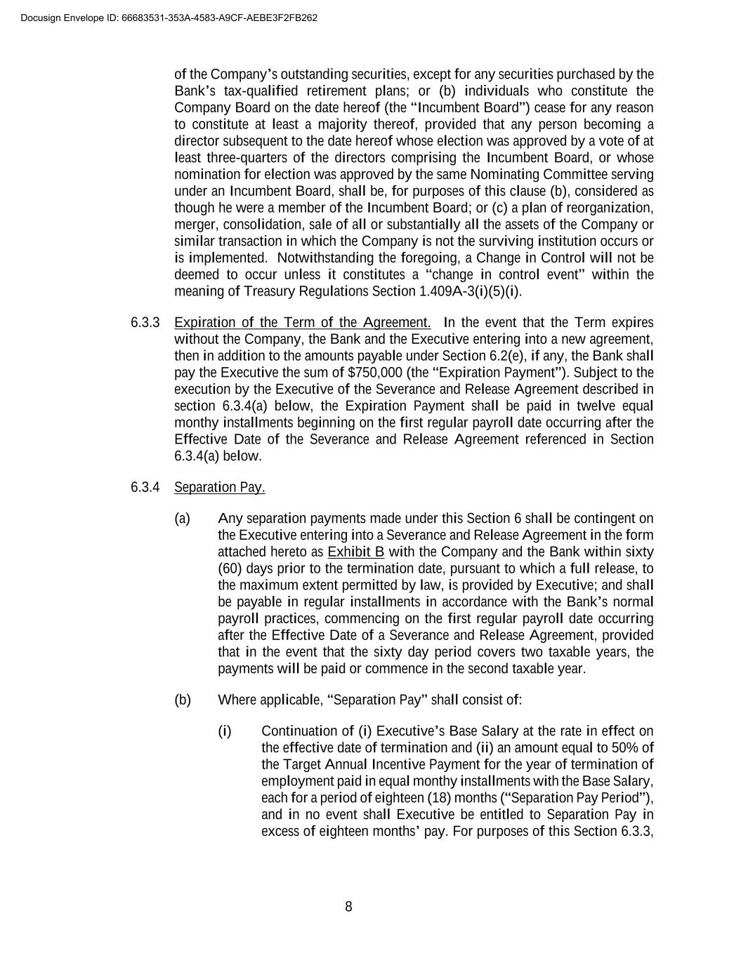 8 of the Company’s outstanding securities, except for any securities purchased by the Bank’s tax-qualified retirement plans; or (b) individuals who constitute the Company Board on the date hereof (the “Incumbent Board”) cease for any reason to constitute at least a majority thereof, provided that any person becoming a director subsequent to the date hereof whose election was approved by a vote of at least three-quarters of the directors comprising the Incumbent Board, or whose nomination for election was approved by the same Nominating Committee serving under an Incumbent Board, shall be, for purposes of this clause (b), considered as though he were a member of the Incumbent Board; or (c) a plan of reorganization, merger, consolidation, sale of all or substantially all the assets of the Company or similar transaction in which the Company is not the surviving institution occurs or is implemented. Notwithstanding the foregoing, a Change in Control will not be deemed to occur unless it constitutes a “change in control event” within the meaning of Treasury Regulations Section 1.409A-3(i)(5)(i). 6.3.3 Expiration of the Term of the Agreement. In the event that the Term expires without the Company, the Bank and the Executive entering into a new agreement, then in addition to the amounts payable under Section 6.2(e), if any, the Bank shall pay the Executive the sum of $750,000 (the “Expiration Payment”). Subject to the execution by the Executive of the Severance and Release Agreement described in section 6.3.4(a) below, the Expiration Payment shall be paid in twelve equal monthy installments beginning on the first regular payroll date occurring after the Effective Date of the Severance and Release Agreement referenced in Section 6.3.4(a) below. 6.3.4 Separation Pay. (a) Any separation payments made under this Section 6 shall be contingent on the Executive entering into a Severance and Release Agreement in the form attached hereto as Exhibit B with the Company and the Bank within sixty (60) days prior to the termination date, pursuant to which a full release, to the maximum extent permitted by law, is provided by Executive; and shall be payable in regular installments in accordance with the Bank’s normal payroll practices, commencing on the first regular payroll date occurring after the Effective Date of a Severance and Release Agreement, provided that in the event that the sixty day period covers two taxable years, the payments will be paid or commence in the second taxable year. (b) Where applicable, “Separation Pay” shall consist of: (i) Continuation of (i) Executive’s Base Salary at the rate in effect on the effective date of termination and (ii) an amount equal to 50% of the Target Annual Incentive Payment for the year of termination of employment paid in equal monthy installments with the Base Salary, each for a period of eighteen (18) months (“Separation Pay Period”), and in no event shall Executive be entitled to Separation Pay in excess of eighteen months’ pay. For purposes of this Section 6.3.3, Docusign Envelope ID: 66683531-353A-4583-A9CF-AEBE3F2FB262