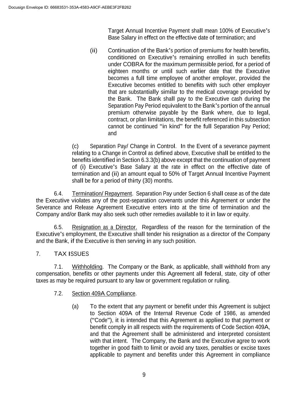 9 Target Annual Incentive Payment shall mean 100% of Executive’s Base Salary in effect on the effective date of termination; and (ii) Continuation of the Bank’s portion of premiums for health benefits, conditioned on Executive’s remaining enrolled in such benefits under COBRA for the maximum permissible period, for a period of eighteen months or until such earlier date that the Executive becomes a full time employee of another employer, provided the Executive becomes entitled to benefits with such other employer that are substantially similar to the medical coverage provided by the Bank. The Bank shall pay to the Executive cash during the Separation Pay Period equivalent to the Bank’s portion of the annual premium otherwise payable by the Bank where, due to legal, contract, or plan limitations, the benefit referenced in this subsection cannot be continued “in kind” for the full Separation Pay Period; and (c) Separation Pay/ Change in Control. In the Event of a severance payment relating to a Change in Control as defined above, Executive shall be entitled to the benefits identified in Section 6.3.3(b) above except that the continuation of payment of (i) Executive’s Base Salary at the rate in effect on the effective date of termination and (ii) an amount equal to 50% of Target Annual Incentive Payment shall be for a period of thirty (30) months. 6.4. Termination/ Repayment. Separation Pay under Section 6 shall cease as of the date the Executive violates any of the post-separation covenants under this Agreement or under the Severance and Release Agreement Executive enters into at the time of termination and the Company and/or Bank may also seek such other remedies available to it in law or equity. 6.5. Resignation as a Director. Regardless of the reason for the termination of the Executive’s employment, the Executive shall tender his resignation as a director of the Company and the Bank, if the Executive is then serving in any such position. 7. TAX ISSUES 7.1. Withholding. The Company or the Bank, as applicable, shall withhold from any compensation, benefits or other payments under this Agreement all federal, state, city of other taxes as may be required pursuant to any law or government regulation or ruling. 7.2. Section 409A Compliance. (a) To the extent that any payment or benefit under this Agreement is subject to Section 409A of the Internal Revenue Code of 1986, as amended (“Code”), it is intended that this Agreement as applied to that payment or benefit comply in all respects with the requirements of Code Section 409A, and that the Agreement shall be administered and interpreted consistent with that intent. The Company, the Bank and the Executive agree to work together in good faith to limit or avoid any taxes, penalties or excise taxes applicable to payment and benefits under this Agreement in compliance Docusign Envelope ID: 66683531-353A-4583-A9CF-AEBE3F2FB262