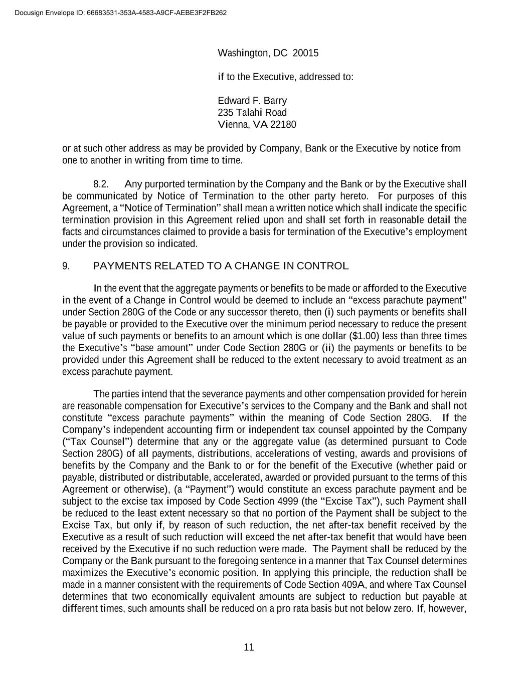 11 Washington, DC 20015 if to the Executive, addressed to: Edward F. Barry 235 Talahi Road Vienna, VA 22180 or at such other address as may be provided by Company, Bank or the Executive by notice from one to another in writing from time to time. 8.2. Any purported termination by the Company and the Bank or by the Executive shall be communicated by Notice of Termination to the other party hereto. For purposes of this Agreement, a “Notice of Termination” shall mean a written notice which shall indicate the specific termination provision in this Agreement relied upon and shall set forth in reasonable detail the facts and circumstances claimed to provide a basis for termination of the Executive’s employment under the provision so indicated. 9. PAYMENTS RELATED TO A CHANGE IN CONTROL In the event that the aggregate payments or benefits to be made or afforded to the Executive in the event of a Change in Control would be deemed to include an “excess parachute payment” under Section 280G of the Code or any successor thereto, then (i) such payments or benefits shall be payable or provided to the Executive over the minimum period necessary to reduce the present value of such payments or benefits to an amount which is one dollar ($1.00) less than three times the Executive’s “base amount” under Code Section 280G or (ii) the payments or benefits to be provided under this Agreement shall be reduced to the extent necessary to avoid treatment as an excess parachute payment. The parties intend that the severance payments and other compensation provided for herein are reasonable compensation for Executive’s services to the Company and the Bank and shall not constitute “excess parachute payments” within the meaning of Code Section 280G. If the Company’s independent accounting firm or independent tax counsel appointed by the Company (“Tax Counsel”) determine that any or the aggregate value (as determined pursuant to Code Section 280G) of all payments, distributions, accelerations of vesting, awards and provisions of benefits by the Company and the Bank to or for the benefit of the Executive (whether paid or payable, distributed or distributable, accelerated, awarded or provided pursuant to the terms of this Agreement or otherwise), (a “Payment”) would constitute an excess parachute payment and be subject to the excise tax imposed by Code Section 4999 (the “Excise Tax”), such Payment shall be reduced to the least extent necessary so that no portion of the Payment shall be subject to the Excise Tax, but only if, by reason of such reduction, the net after-tax benefit received by the Executive as a result of such reduction will exceed the net after-tax benefit that would have been received by the Executive if no such reduction were made. The Payment shall be reduced by the Company or the Bank pursuant to the foregoing sentence in a manner that Tax Counsel determines maximizes the Executive’s economic position. In applying this principle, the reduction shall be made in a manner consistent with the requirements of Code Section 409A, and where Tax Counsel determines that two economically equivalent amounts are subject to reduction but payable at different times, such amounts shall be reduced on a pro rata basis but not below zero. If, however, Docusign Envelope ID: 66683531-353A-4583-A9CF-AEBE3F2FB262