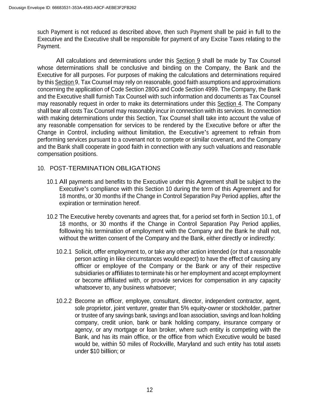 12 such Payment is not reduced as described above, then such Payment shall be paid in full to the Executive and the Executive shall be responsible for payment of any Excise Taxes relating to the Payment. All calculations and determinations under this Section 9 shall be made by Tax Counsel whose determinations shall be conclusive and binding on the Company, the Bank and the Executive for all purposes. For purposes of making the calculations and determinations required by this Section 9, Tax Counsel may rely on reasonable, good faith assumptions and approximations concerning the application of Code Section 280G and Code Section 4999. The Company, the Bank and the Executive shall furnish Tax Counsel with such information and documents as Tax Counsel may reasonably request in order to make its determinations under this Section 4. The Company shall bear all costs Tax Counsel may reasonably incur in connection with its services. In connection with making determinations under this Section, Tax Counsel shall take into account the value of any reasonable compensation for services to be rendered by the Executive before or after the Change in Control, including without limitation, the Executive’s agreement to refrain from performing services pursuant to a covenant not to compete or similar covenant, and the Company and the Bank shall cooperate in good faith in connection with any such valuations and reasonable compensation positions. 10. POST-TERMINATION OBLIGATIONS 10.1 All payments and benefits to the Executive under this Agreement shall be subject to the Executive’s compliance with this Section 10 during the term of this Agreement and for 18 months, or 30 months if the Change in Control Separation Pay Period applies, after the expiration or termination hereof. 10.2 The Executive hereby covenants and agrees that, for a period set forth in Section 10.1, of 18 months, or 30 months if the Change in Control Separation Pay Period applies, following his termination of employment with the Company and the Bank he shall not, without the written consent of the Company and the Bank, either directly or indirectly: 10.2.1 Solicit, offer employment to, or take any other action intended (or that a reasonable person acting in like circumstances would expect) to have the effect of causing any officer or employee of the Company or the Bank or any of their respective subsidiaries or affiliates to terminate his or her employment and accept employment or become affiliated with, or provide services for compensation in any capacity whatsoever to, any business whatsoever; 10.2.2 Become an officer, employee, consultant, director, independent contractor, agent, sole proprietor, joint venturer, greater than 5% equity-owner or stockholder, partner or trustee of any savings bank, savings and loan association, savings and loan holding company, credit union, bank or bank holding company, insurance company or agency, or any mortgage or loan broker, where such entity is competing with the Bank, and has its main office, or the office from which Executive would be based would be, within 50 miles of Rockville, Maryland and such entity has total assets under $10 billion; or Docusign Envelope ID: 66683531-353A-4583-A9CF-AEBE3F2FB262