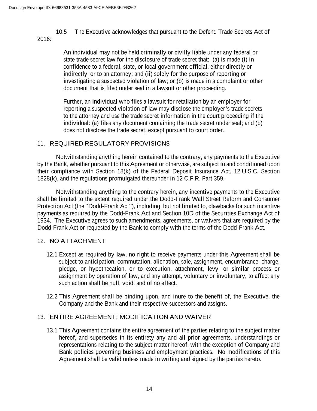 14 10.5 The Executive acknowledges that pursuant to the Defend Trade Secrets Act of 2016: An individual may not be held criminally or civilly liable under any federal or state trade secret law for the disclosure of trade secret that: (a) is made (i) in confidence to a federal, state, or local government official, either directly or indirectly, or to an attorney; and (ii) solely for the purpose of reporting or investigating a suspected violation of law; or (b) is made in a complaint or other document that is filed under seal in a lawsuit or other proceeding. Further, an individual who files a lawsuit for retaliation by an employer for reporting a suspected violation of law may disclose the employer’s trade secrets to the attorney and use the trade secret information in the court proceeding if the individual: (a) files any document containing the trade secret under seal; and (b) does not disclose the trade secret, except pursuant to court order. 11. REQUIRED REGULATORY PROVISIONS Notwithstanding anything herein contained to the contrary, any payments to the Executive by the Bank, whether pursuant to this Agreement or otherwise, are subject to and conditioned upon their compliance with Section 18(k) of the Federal Deposit Insurance Act, 12 U.S.C. Section 1828(k), and the regulations promulgated thereunder in 12 C.F.R. Part 359. Notwithstanding anything to the contrary herein, any incentive payments to the Executive shall be limited to the extent required under the Dodd-Frank Wall Street Reform and Consumer Protection Act (the “Dodd-Frank Act”), including, but not limited to, clawbacks for such incentive payments as required by the Dodd-Frank Act and Section 10D of the Securities Exchange Act of 1934. The Executive agrees to such amendments, agreements, or waivers that are required by the Dodd-Frank Act or requested by the Bank to comply with the terms of the Dodd-Frank Act. 12. NO ATTACHMENT 12.1 Except as required by law, no right to receive payments under this Agreement shall be subject to anticipation, commutation, alienation, sale, assignment, encumbrance, charge, pledge, or hypothecation, or to execution, attachment, levy, or similar process or assignment by operation of law, and any attempt, voluntary or involuntary, to affect any such action shall be null, void, and of no effect. 12.2 This Agreement shall be binding upon, and inure to the benefit of, the Executive, the Company and the Bank and their respective successors and assigns. 13. ENTIRE AGREEMENT; MODIFICATION AND WAIVER 13.1 This Agreement contains the entire agreement of the parties relating to the subject matter hereof, and supersedes in its entirety any and all prior agreements, understandings or representations relating to the subject matter hereof, with the exception of Company and Bank policies governing business and employment practices. No modifications of this Agreement shall be valid unless made in writing and signed by the parties hereto. Docusign Envelope ID: 66683531-353A-4583-A9CF-AEBE3F2FB262