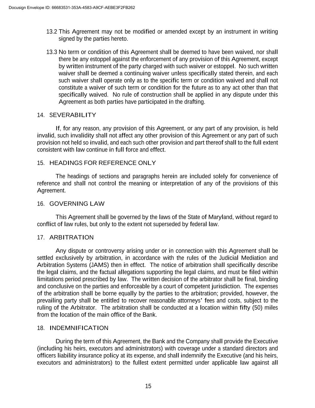 15 13.2 This Agreement may not be modified or amended except by an instrument in writing signed by the parties hereto. 13.3 No term or condition of this Agreement shall be deemed to have been waived, nor shall there be any estoppel against the enforcement of any provision of this Agreement, except by written instrument of the party charged with such waiver or estoppel. No such written waiver shall be deemed a continuing waiver unless specifically stated therein, and each such waiver shall operate only as to the specific term or condition waived and shall not constitute a waiver of such term or condition for the future as to any act other than that specifically waived. No rule of construction shall be applied in any dispute under this Agreement as both parties have participated in the drafting. 14. SEVERABILITY If, for any reason, any provision of this Agreement, or any part of any provision, is held invalid, such invalidity shall not affect any other provision of this Agreement or any part of such provision not held so invalid, and each such other provision and part thereof shall to the full extent consistent with law continue in full force and effect. 15. HEADINGS FOR REFERENCE ONLY The headings of sections and paragraphs herein are included solely for convenience of reference and shall not control the meaning or interpretation of any of the provisions of this Agreement. 16. GOVERNING LAW This Agreement shall be governed by the laws of the State of Maryland, without regard to conflict of law rules, but only to the extent not superseded by federal law. 17. ARBITRATION Any dispute or controversy arising under or in connection with this Agreement shall be settled exclusively by arbitration, in accordance with the rules of the Judicial Mediation and Arbitration Systems (JAMS) then in effect. The notice of arbitration shall specifically describe the legal claims, and the factual allegations supporting the legal claims, and must be filed within limitations period prescribed by law. The written decision of the arbitrator shall be final, binding and conclusive on the parties and enforceable by a court of competent jurisdiction. The expenses of the arbitration shall be borne equally by the parties to the arbitration; provided, however, the prevailing party shall be entitled to recover reasonable attorneys’ fees and costs, subject to the ruling of the Arbitrator. The arbitration shall be conducted at a location within fifty (50) miles from the location of the main office of the Bank. 18. INDEMNIFICATION During the term of this Agreement, the Bank and the Company shall provide the Executive (including his heirs, executors and administrators) with coverage under a standard directors and officers liability insurance policy at its expense, and shall indemnify the Executive (and his heirs, executors and administrators) to the fullest extent permitted under applicable law against all Docusign Envelope ID: 66683531-353A-4583-A9CF-AEBE3F2FB262