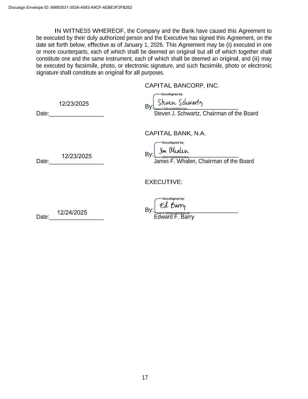 17 IN WITNESS WHEREOF, the Company and the Bank have caused this Agreement to be executed by their duly authorized person and the Executive has signed this Agreement, on the date set forth below, effective as of January 1, 2026. This Agreement may be (i) executed in one or more counterparts, each of which shall be deemed an original but all of which together shall constitute one and the same instrument, each of which shall be deemed an original, and (ii) may be executed by facsimile, photo, or electronic signature, and such facsimile, photo or electronic signature shall constitute an original for all purposes. CAPITAL BANCORP, INC. By:____________________________ Date:__________________ Steven J. Schwartz, Chairman of the Board CAPITAL BANK, N.A. By:____________________________ Date:__________________ James F. Whalen, Chairman of the Board EXECUTIVE: By:____________________________ Date:__________________ Edward F. Barry Docusign Envelope ID: 66683531-353A-4583-A9CF-AEBE3F2FB262 12/24/2025 12/23/2025 12/23/2025