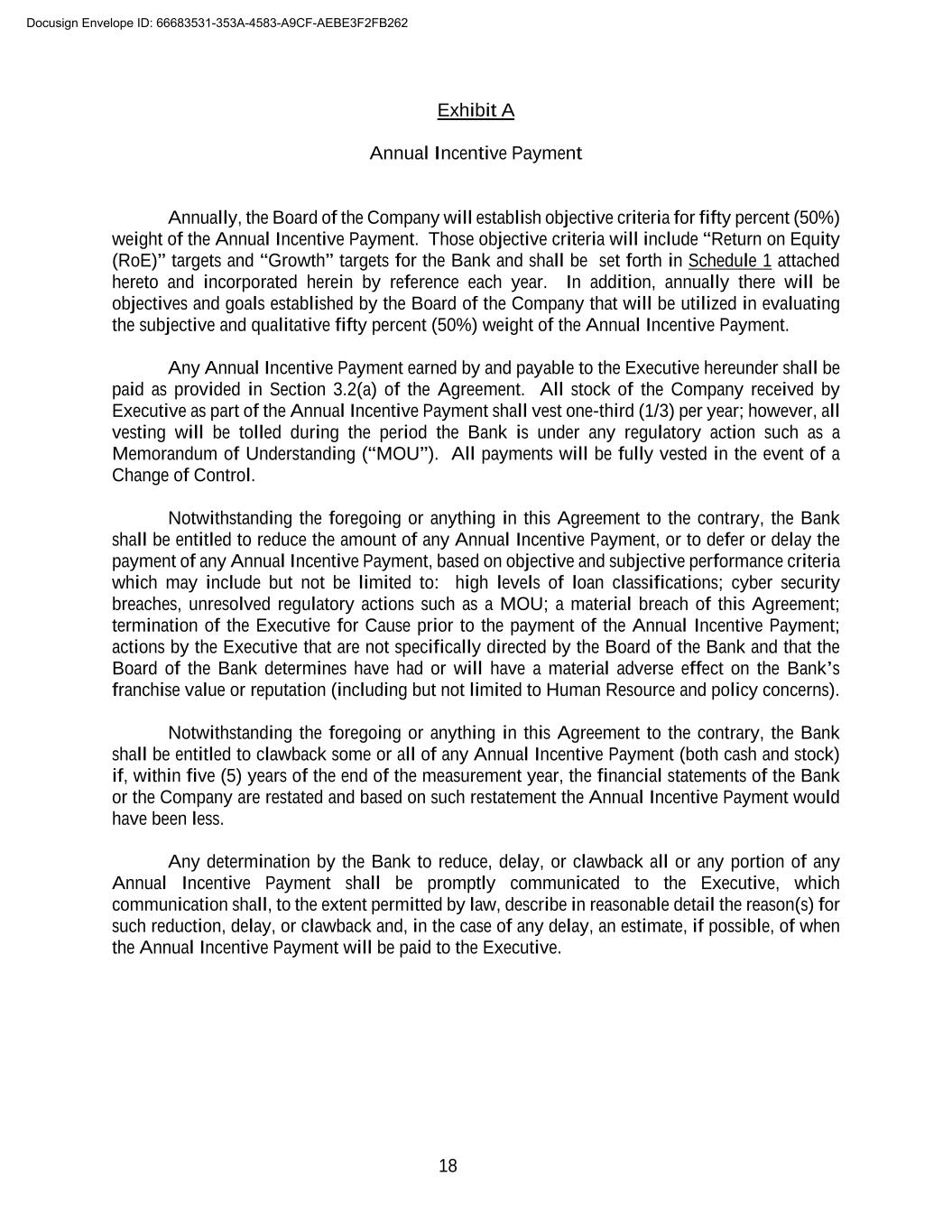 18 Exhibit A Annual Incentive Payment Annually, the Board of the Company will establish objective criteria for fifty percent (50%) weight of the Annual Incentive Payment. Those objective criteria will include “Return on Equity (RoE)” targets and “Growth” targets for the Bank and shall be set forth in Schedule 1 attached hereto and incorporated herein by reference each year. In addition, annually there will be objectives and goals established by the Board of the Company that will be utilized in evaluating the subjective and qualitative fifty percent (50%) weight of the Annual Incentive Payment. Any Annual Incentive Payment earned by and payable to the Executive hereunder shall be paid as provided in Section 3.2(a) of the Agreement. All stock of the Company received by Executive as part of the Annual Incentive Payment shall vest one-third (1/3) per year; however, all vesting will be tolled during the period the Bank is under any regulatory action such as a Memorandum of Understanding (“MOU”). All payments will be fully vested in the event of a Change of Control. Notwithstanding the foregoing or anything in this Agreement to the contrary, the Bank shall be entitled to reduce the amount of any Annual Incentive Payment, or to defer or delay the payment of any Annual Incentive Payment, based on objective and subjective performance criteria which may include but not be limited to: high levels of loan classifications; cyber security breaches, unresolved regulatory actions such as a MOU; a material breach of this Agreement; termination of the Executive for Cause prior to the payment of the Annual Incentive Payment; actions by the Executive that are not specifically directed by the Board of the Bank and that the Board of the Bank determines have had or will have a material adverse effect on the Bank’s franchise value or reputation (including but not limited to Human Resource and policy concerns). Notwithstanding the foregoing or anything in this Agreement to the contrary, the Bank shall be entitled to clawback some or all of any Annual Incentive Payment (both cash and stock) if, within five (5) years of the end of the measurement year, the financial statements of the Bank or the Company are restated and based on such restatement the Annual Incentive Payment would have been less. Any determination by the Bank to reduce, delay, or clawback all or any portion of any Annual Incentive Payment shall be promptly communicated to the Executive, which communication shall, to the extent permitted by law, describe in reasonable detail the reason(s) for such reduction, delay, or clawback and, in the case of any delay, an estimate, if possible, of when the Annual Incentive Payment will be paid to the Executive. Docusign Envelope ID: 66683531-353A-4583-A9CF-AEBE3F2FB262