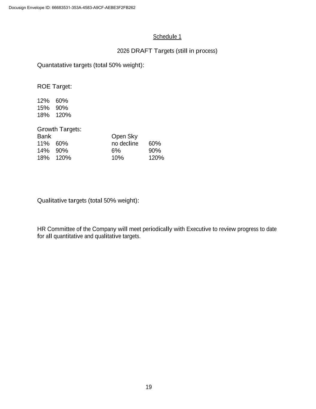 19 Schedule 1 2026 DRAFT Targets (still in process) Quantatative targets (total 50% weight): ROE Target: 12% 60% 15% 90% 18% 120% Growth Targets: Bank Open Sky 11% 60% no decline 60% 14% 90% 6% 90% 18% 120% 10% 120% Qualitative targets (total 50% weight): HR Committee of the Company will meet periodically with Executive to review progress to date for all quantitative and qualitative targets. Docusign Envelope ID: 66683531-353A-4583-A9CF-AEBE3F2FB262