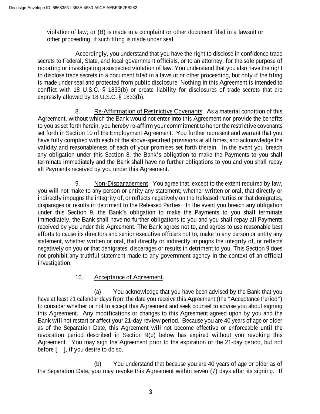 3 violation of law; or (B) is made in a complaint or other document filed in a lawsuit or other proceeding, if such filing is made under seal. Accordingly, you understand that you have the right to disclose in confidence trade secrets to Federal, State, and local government officials, or to an attorney, for the sole purpose of reporting or investigating a suspected violation of law. You understand that you also have the right to disclose trade secrets in a document filed in a lawsuit or other proceeding, but only if the filing is made under seal and protected from public disclosure. Nothing in this Agreement is intended to conflict with 18 U.S.C. § 1833(b) or create liability for disclosures of trade secrets that are expressly allowed by 18 U.S.C. § 1833(b). 8. Re-Affirmation of Restrictive Covenants. As a material condition of this Agreement, without which the Bank would not enter into this Agreement nor provide the benefits to you as set forth herein, you hereby re-affirm your commitment to honor the restrictive covenants set forth in Section 10 of the Employment Agreement. You further represent and warrant that you have fully complied with each of the above-specified provisions at all times, and acknowledge the validity and reasonableness of each of your promises set forth therein. In the event you breach any obligation under this Section 8, the Bank’s obligation to make the Payments to you shall terminate immediately and the Bank shall have no further obligations to you and you shall repay all Payments received by you under this Agreement. 9. Non-Disparagement. You agree that, except to the extent required by law, you will not make to any person or entity any statement, whether written or oral, that directly or indirectly impugns the integrity of, or reflects negatively on the Released Parties or that denigrates, disparages or results in detriment to the Released Parties. In the event you breach any obligation under this Section 9, the Bank’s obligation to make the Payments to you shall terminate immediately, the Bank shall have no further obligations to you and you shall repay all Payments received by you under this Agreement. The Bank agrees not to, and agrees to use reasonable best efforts to cause its directors and senior executive officers not to, make to any person or entity any statement, whether written or oral, that directly or indirectly impugns the integrity of, or reflects negatively on you or that denigrates, disparages or results in detriment to you. This Section 9 does not prohibit any truthful statement made to any government agency in the context of an official investigation. 10. Acceptance of Agreement. (a) You acknowledge that you have been advised by the Bank that you have at least 21 calendar days from the date you receive this Agreement (the “Acceptance Period”) to consider whether or not to accept this Agreement and seek counsel to advise you about signing this Agreement. Any modifications or changes to this Agreement agreed upon by you and the Bank will not restart or affect your 21-day review period. Because you are 40 years of age or older as of the Separation Date, this Agreement will not become effective or enforceable until the revocation period described in Section 9(b) below has expired without you revoking this Agreement. You may sign the Agreement prior to the expiration of the 21-day period, but not before [ ], if you desire to do so. (b) You understand that because you are 40 years of age or older as of the Separation Date, you may revoke this Agreement within seven (7) days after its signing. If Docusign Envelope ID: 66683531-353A-4583-A9CF-AEBE3F2FB262