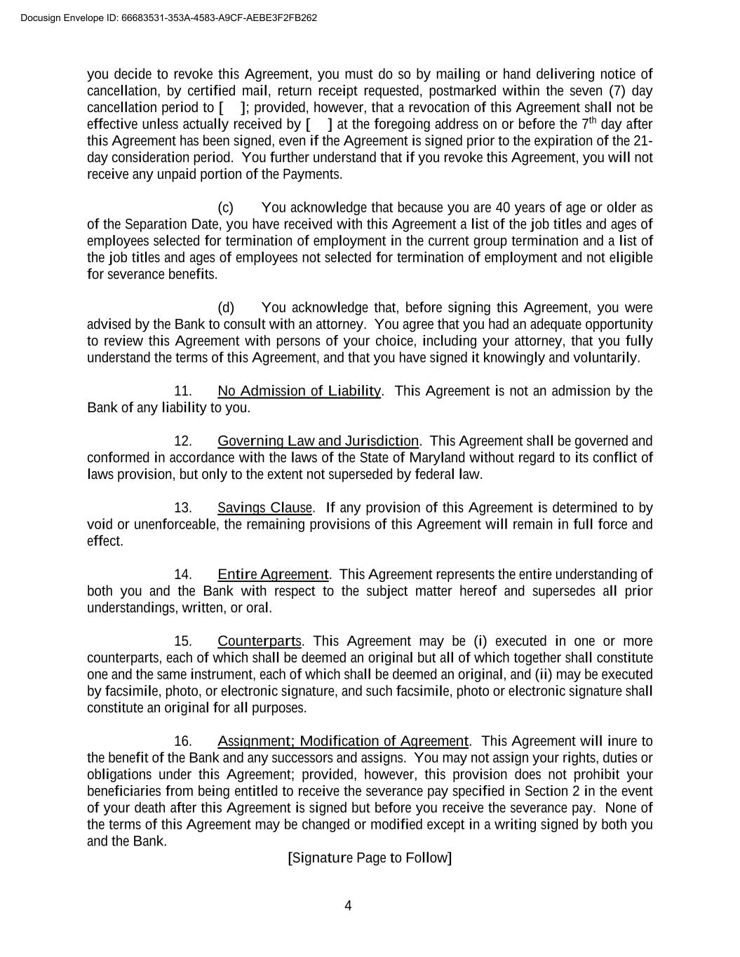 4 you decide to revoke this Agreement, you must do so by mailing or hand delivering notice of cancellation, by certified mail, return receipt requested, postmarked within the seven (7) day cancellation period to [ ]; provided, however, that a revocation of this Agreement shall not be effective unless actually received by [ ] at the foregoing address on or before the 7th day after this Agreement has been signed, even if the Agreement is signed prior to the expiration of the 21- day consideration period. You further understand that if you revoke this Agreement, you will not receive any unpaid portion of the Payments. (c) You acknowledge that because you are 40 years of age or older as of the Separation Date, you have received with this Agreement a list of the job titles and ages of employees selected for termination of employment in the current group termination and a list of the job titles and ages of employees not selected for termination of employment and not eligible for severance benefits. (d) You acknowledge that, before signing this Agreement, you were advised by the Bank to consult with an attorney. You agree that you had an adequate opportunity to review this Agreement with persons of your choice, including your attorney, that you fully understand the terms of this Agreement, and that you have signed it knowingly and voluntarily. 11. No Admission of Liability. This Agreement is not an admission by the Bank of any liability to you. 12. Governing Law and Jurisdiction. This Agreement shall be governed and conformed in accordance with the laws of the State of Maryland without regard to its conflict of laws provision, but only to the extent not superseded by federal law. 13. Savings Clause. If any provision of this Agreement is determined to by void or unenforceable, the remaining provisions of this Agreement will remain in full force and effect. 14. Entire Agreement. This Agreement represents the entire understanding of both you and the Bank with respect to the subject matter hereof and supersedes all prior understandings, written, or oral. 15. Counterparts. This Agreement may be (i) executed in one or more counterparts, each of which shall be deemed an original but all of which together shall constitute one and the same instrument, each of which shall be deemed an original, and (ii) may be executed by facsimile, photo, or electronic signature, and such facsimile, photo or electronic signature shall constitute an original for all purposes. 16. Assignment; Modification of Agreement. This Agreement will inure to the benefit of the Bank and any successors and assigns. You may not assign your rights, duties or obligations under this Agreement; provided, however, this provision does not prohibit your beneficiaries from being entitled to receive the severance pay specified in Section 2 in the event of your death after this Agreement is signed but before you receive the severance pay. None of the terms of this Agreement may be changed or modified except in a writing signed by both you and the Bank. [Signature Page to Follow] Docusign Envelope ID: 66683531-353A-4583-A9CF-AEBE3F2FB262