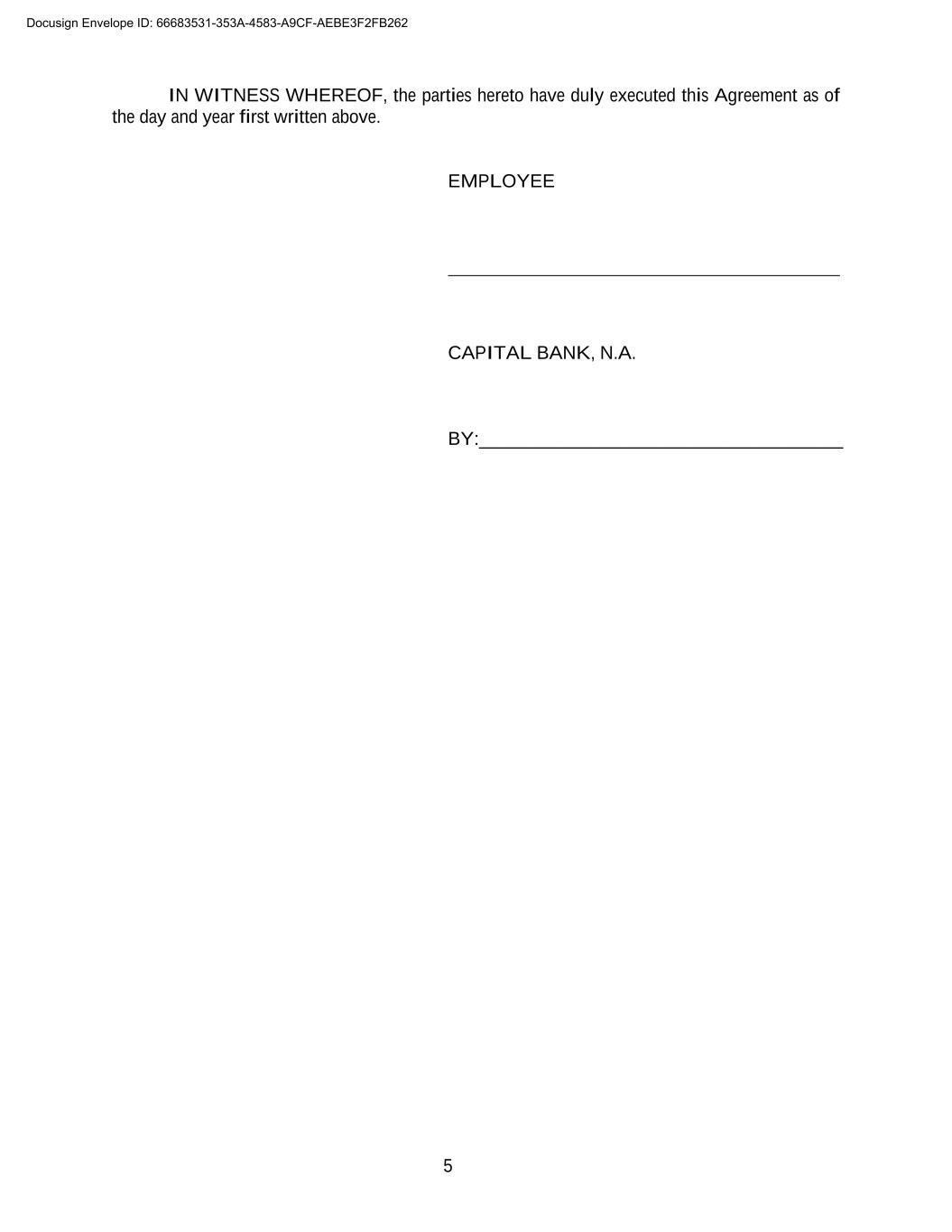5 IN WITNESS WHEREOF, the parties hereto have duly executed this Agreement as of the day and year first written above. EMPLOYEE CAPITAL BANK, N.A. BY:_______________________________________ Docusign Envelope ID: 66683531-353A-4583-A9CF-AEBE3F2FB262