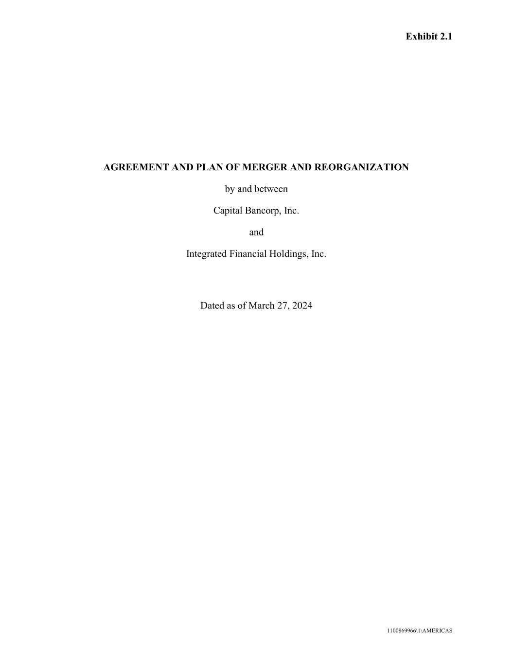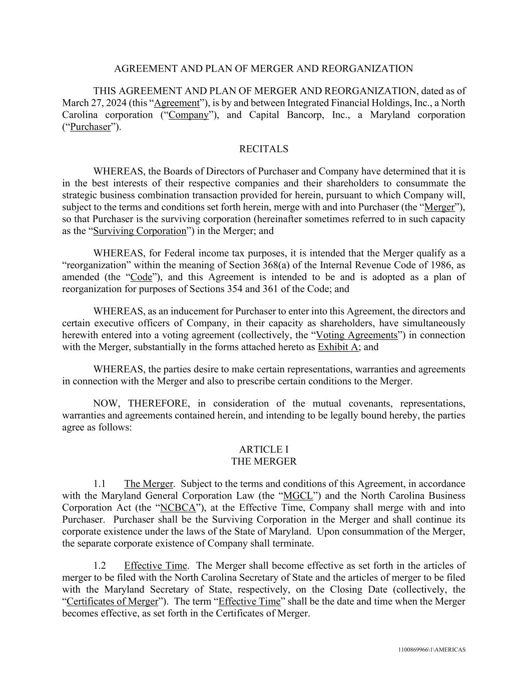 1100869966\1\AMERICAS AGREEMENT AND PLAN OF MERGER AND REORGANIZATION THIS AGREEMENT AND PLAN OF MERGER AND REORGANIZATION, dated as of March 27, 2024 (this “Agreement”), is by and between Integrated Financial Holdings, Inc., a North Carolina corporation (“Company”), and Capital Bancorp, Inc., a Maryland corporation (“Purchaser”). RECITALS WHEREAS, the Boards of Directors of Purchaser and Company have determined that it is in the best interests of their respective companies and their shareholders to consummate the strategic business combination transaction provided for herein, pursuant to which Company will, subject to the terms and conditions set forth herein, merge with and into Purchaser (the “Merger”), so that Purchaser is the surviving corporation (hereinafter sometimes referred to in such capacity as the “Surviving Corporation”) in the Merger; and WHEREAS, for Federal income tax purposes, it is intended that the Merger qualify as a “reorganization” within the meaning of Section 368(a) of the Internal Revenue Code of 1986, as amended (the “Code”), and this Agreement is intended to be and is adopted as a plan of reorganization for purposes of Sections 354 and 361 of the Code; and WHEREAS, as an inducement for Purchaser to enter into this Agreement, the directors and certain executive officers of Company, in their capacity as shareholders, have simultaneously herewith entered into a voting agreement (collectively, the “Voting Agreements”) in connection with the Merger, substantially in the forms attached hereto as Exhibit A; and WHEREAS, the parties desire to make certain representations, warranties and agreements in connection with the Merger and also to prescribe certain conditions to the Merger. NOW, THEREFORE, in consideration of the mutual covenants, representations, warranties and agreements contained herein, and intending to be legally bound hereby, the parties agree as follows: ARTICLE I THE MERGER 1.1 The Merger. Subject to the terms and conditions of this Agreement, in accordance with the Maryland General Corporation Law (the “MGCL”) and the North Carolina Business Corporation Act (the “NCBCA”), at the Effective Time, Company shall merge with and into Purchaser. Purchaser shall be the Surviving Corporation in the Merger and shall continue its corporate existence under the laws of the State of Maryland. Upon consummation of the Merger, the separate corporate existence of Company shall terminate. 1.2 Effective Time. The Merger shall become effective as set forth in the articles of merger to be filed with the North Carolina Secretary of State and the articles of merger to be filed with the Maryland Secretary of State, respectively, on the Closing Date (collectively, the “Certificates of Merger”). The term “Effective Time” shall be the date and time when the Merger becomes effective, as set forth in the Certificates of Merger.