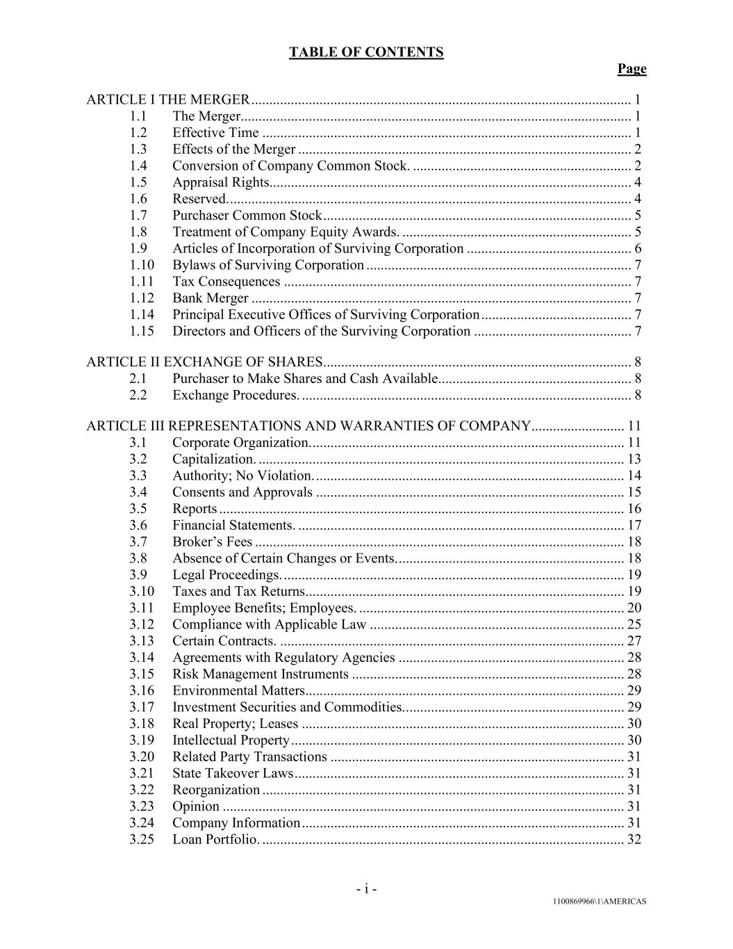 TABLE OF CONTENTS Page - i - 1100869966\1\AMERICAS ARTICLE I THE MERGER .......................................................................................................... 1 1.1 The Merger............................................................................................................. 1 1.2 Effective Time ....................................................................................................... 1 1.3 Effects of the Merger ............................................................................................. 2 1.4 Conversion of Company Common Stock. ............................................................. 2 1.5 Appraisal Rights..................................................................................................... 4 1.6 Reserved. ................................................................................................................ 4 1.7 Purchaser Common Stock ...................................................................................... 5 1.8 Treatment of Company Equity Awards. ................................................................ 5 1.9 Articles of Incorporation of Surviving Corporation .............................................. 6 1.10 Bylaws of Surviving Corporation .......................................................................... 7 1.11 Tax Consequences ................................................................................................. 7 1.12 Bank Merger .......................................................................................................... 7 1.14 Principal Executive Offices of Surviving Corporation .......................................... 7 1.15 Directors and Officers of the Surviving Corporation ............................................ 7 ARTICLE II EXCHANGE OF SHARES...................................................................................... 8 2.1 Purchaser to Make Shares and Cash Available...................................................... 8 2.2 Exchange Procedures. ............................................................................................ 8 ARTICLE III REPRESENTATIONS AND WARRANTIES OF COMPANY.......................... 11 3.1 Corporate Organization. ....................................................................................... 11 3.2 Capitalization. ...................................................................................................... 13 3.3 Authority; No Violation. ...................................................................................... 14 3.4 Consents and Approvals ...................................................................................... 15 3.5 Reports ................................................................................................................. 16 3.6 Financial Statements. ........................................................................................... 17 3.7 Broker’s Fees ....................................................................................................... 18 3.8 Absence of Certain Changes or Events. ............................................................... 18 3.9 Legal Proceedings. ............................................................................................... 19 3.10 Taxes and Tax Returns......................................................................................... 19 3.11 Employee Benefits; Employees. .......................................................................... 20 3.12 Compliance with Applicable Law ....................................................................... 25 3.13 Certain Contracts. ................................................................................................ 27 3.14 Agreements with Regulatory Agencies ............................................................... 28 3.15 Risk Management Instruments ............................................................................ 28 3.16 Environmental Matters......................................................................................... 29 3.17 Investment Securities and Commodities. ............................................................. 29 3.18 Real Property; Leases .......................................................................................... 30 3.19 Intellectual Property ............................................................................................. 30 3.20 Related Party Transactions .................................................................................. 31 3.21 State Takeover Laws ............................................................................................ 31 3.22 Reorganization ..................................................................................................... 31 3.23 Opinion ................................................................................................................ 31 3.24 Company Information .......................................................................................... 31 3.25 Loan Portfolio. ..................................................................................................... 32
