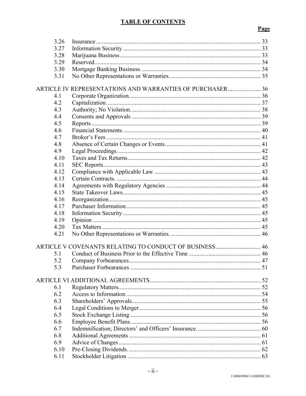 TABLE OF CONTENTS Page - ii - 1100869966\1\AMERICAS 3.26 Insurance .............................................................................................................. 33 3.27 Information Security ............................................................................................ 33 3.28 Marijuana Business .............................................................................................. 33 3.29 Reserved. .............................................................................................................. 34 3.30 Mortgage Banking Business. ............................................................................... 34 3.31 No Other Representations or Warranties. ............................................................ 35 ARTICLE IV REPRESENTATIONS AND WARRANTIES OF PURCHASER ...................... 36 4.1 Corporate Organization. ....................................................................................... 36 4.2 Capitalization. ...................................................................................................... 37 4.3 Authority; No Violation. ...................................................................................... 38 4.4 Consents and Approvals ...................................................................................... 39 4.5 Reports ................................................................................................................. 39 4.6 Financial Statements. ........................................................................................... 40 4.7 Broker’s Fees ....................................................................................................... 41 4.8 Absence of Certain Changes or Events ................................................................ 41 4.9 Legal Proceedings. ............................................................................................... 42 4.10 Taxes and Tax Returns......................................................................................... 42 4.11 SEC Reports ......................................................................................................... 43 4.12 Compliance with Applicable Law ....................................................................... 43 4.13 Certain Contracts. ................................................................................................ 44 4.14 Agreements with Regulatory Agencies ............................................................... 44 4.15 State Takeover Laws ............................................................................................ 45 4.16 Reorganization ..................................................................................................... 45 4.17 Purchaser Information .......................................................................................... 45 4.18 Information Security ............................................................................................ 45 4.19 Opinion ................................................................................................................ 45 4.20 Tax Matters .......................................................................................................... 45 4.21 No Other Representations or Warranties. ............................................................ 46 ARTICLE V COVENANTS RELATING TO CONDUCT OF BUSINESS .............................. 46 5.1 Conduct of Business Prior to the Effective Time ................................................ 46 5.2 Company Forbearances ........................................................................................ 47 5.3 Purchaser Forbearances ....................................................................................... 51 ARTICLE VI ADDITIONAL AGREEMENTS .......................................................................... 52 6.1 Regulatory Matters............................................................................................... 52 6.2 Access to Information. ......................................................................................... 54 6.3 Shareholders’ Approvals ...................................................................................... 55 6.4 Legal Conditions to Merger ................................................................................. 56 6.5 Stock Exchange Listing ....................................................................................... 56 6.6 Employee Benefit Plans. ...................................................................................... 56 6.7 Indemnification; Directors’ and Officers’ Insurance. .......................................... 60 6.8 Additional Agreements ........................................................................................ 61 6.9 Advice of Changes ............................................................................................... 61 6.10 Pre-Closing Dividends. ........................................................................................ 62 6.11 Stockholder Litigation ......................................................................................... 63