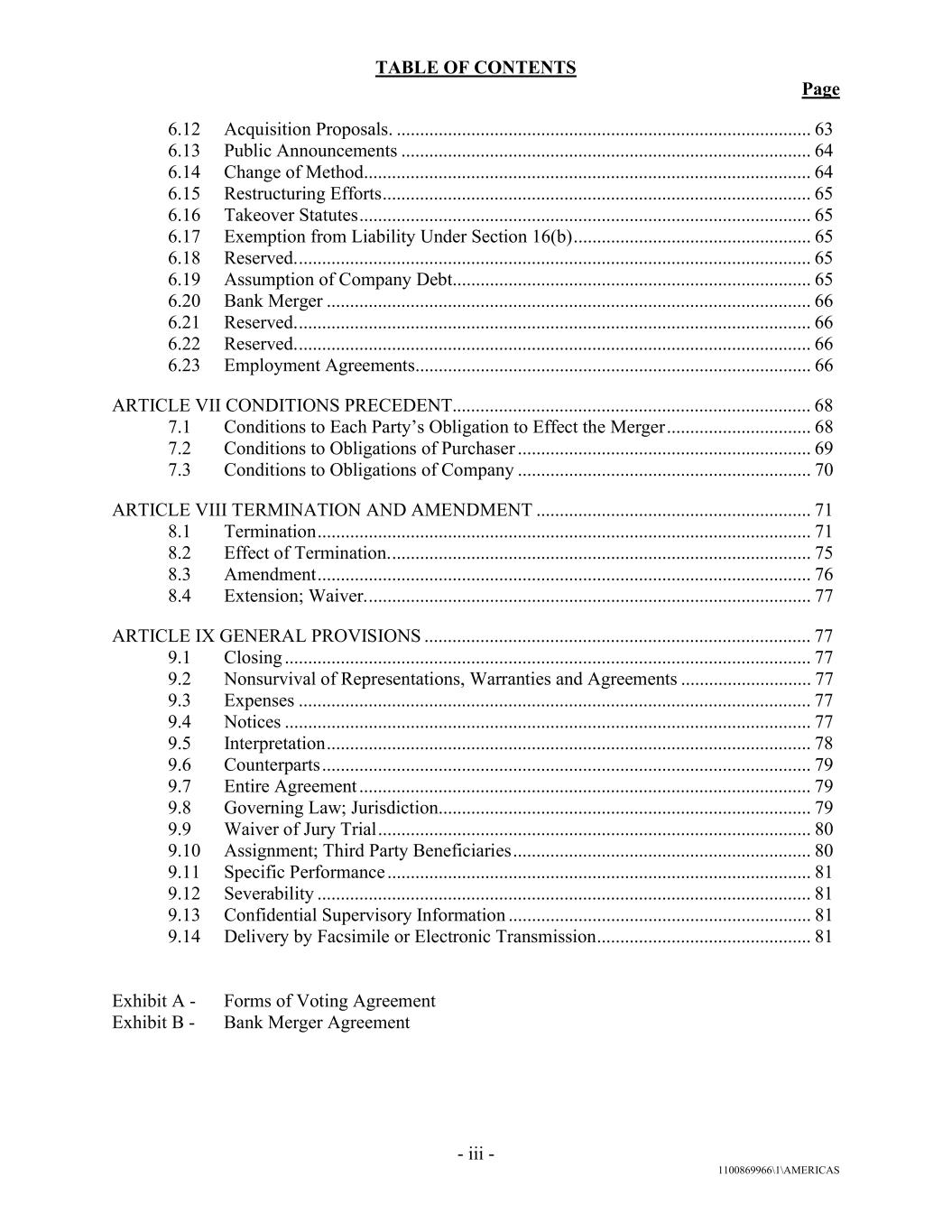 TABLE OF CONTENTS Page - iii - 1100869966\1\AMERICAS 6.12 Acquisition Proposals. ......................................................................................... 63 6.13 Public Announcements ........................................................................................ 64 6.14 Change of Method................................................................................................ 64 6.15 Restructuring Efforts ............................................................................................ 65 6.16 Takeover Statutes ................................................................................................. 65 6.17 Exemption from Liability Under Section 16(b) ................................................... 65 6.18 Reserved. .............................................................................................................. 65 6.19 Assumption of Company Debt............................................................................. 65 6.20 Bank Merger ........................................................................................................ 66 6.21 Reserved. .............................................................................................................. 66 6.22 Reserved. .............................................................................................................. 66 6.23 Employment Agreements..................................................................................... 66 ARTICLE VII CONDITIONS PRECEDENT............................................................................. 68 7.1 Conditions to Each Party’s Obligation to Effect the Merger ............................... 68 7.2 Conditions to Obligations of Purchaser ............................................................... 69 7.3 Conditions to Obligations of Company ............................................................... 70 ARTICLE VIII TERMINATION AND AMENDMENT ........................................................... 71 8.1 Termination .......................................................................................................... 71 8.2 Effect of Termination. .......................................................................................... 75 8.3 Amendment .......................................................................................................... 76 8.4 Extension; Waiver. ............................................................................................... 77 ARTICLE IX GENERAL PROVISIONS ................................................................................... 77 9.1 Closing ................................................................................................................. 77 9.2 Nonsurvival of Representations, Warranties and Agreements ............................ 77 9.3 Expenses .............................................................................................................. 77 9.4 Notices ................................................................................................................. 77 9.5 Interpretation ........................................................................................................ 78 9.6 Counterparts ......................................................................................................... 79 9.7 Entire Agreement ................................................................................................. 79 9.8 Governing Law; Jurisdiction................................................................................ 79 9.9 Waiver of Jury Trial ............................................................................................. 80 9.10 Assignment; Third Party Beneficiaries ................................................................ 80 9.11 Specific Performance ........................................................................................... 81 9.12 Severability .......................................................................................................... 81 9.13 Confidential Supervisory Information ................................................................. 81 9.14 Delivery by Facsimile or Electronic Transmission .............................................. 81 Exhibit A - Forms of Voting Agreement Exhibit B - Bank Merger Agreement
