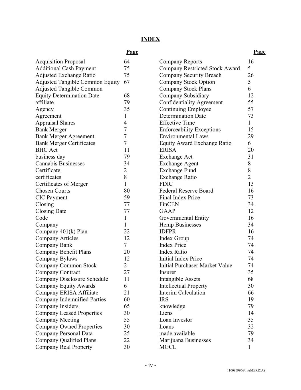 - iv - 1100869966\1\AMERICAS INDEX Page Page Acquisition Proposal 64 Additional Cash Payment 75 Adjusted Exchange Ratio 75 Adjusted Tangible Common Equity 67 Adjusted Tangible Common Equity Determination Date 68 affiliate 79 Agency 35 Agreement 1 Appraisal Shares 4 Bank Merger 7 Bank Merger Agreement 7 Bank Merger Certificates 7 BHC Act 11 business day 79 Cannabis Businesses 34 Certificate 2 certificates 8 Certificates of Merger 1 Chosen Courts 80 CIC Payment 59 Closing 77 Closing Date 77 Code 1 Company 1 Company 401(k) Plan 22 Company Articles 12 Company Bank 7 Company Benefit Plans 20 Company Bylaws 12 Company Common Stock 2 Company Contract 27 Company Disclosure Schedule 11 Company Equity Awards 6 Company ERISA Affiliate 21 Company Indemnified Parties 60 Company Insiders 65 Company Leased Properties 30 Company Meeting 55 Company Owned Properties 30 Company Personal Data 25 Company Qualified Plans 22 Company Real Property 30 Company Reports 16 Company Restricted Stock Award 5 Company Security Breach 26 Company Stock Option 5 Company Stock Plans 6 Company Subsidiary 12 Confidentiality Agreement 55 Continuing Employee 57 Determination Date 73 Effective Time 1 Enforceability Exceptions 15 Environmental Laws 29 Equity Award Exchange Ratio 6 ERISA 20 Exchange Act 31 Exchange Agent 8 Exchange Fund 8 Exchange Ratio 2 FDIC 13 Federal Reserve Board 16 Final Index Price 73 FinCEN 34 GAAP 12 Governmental Entity 16 Hemp Businesses 34 IDFPR 16 Index Group 74 Index Price 74 Index Ratio 74 Initial Index Price 74 Initial Purchaser Market Value 74 Insurer 35 Intangible Assets 68 Intellectual Property 30 Interim Calculation 66 IRS 19 knowledge 79 Liens 14 Loan Investor 35 Loans 32 made available 79 Marijuana Businesses 34 MGCL 1