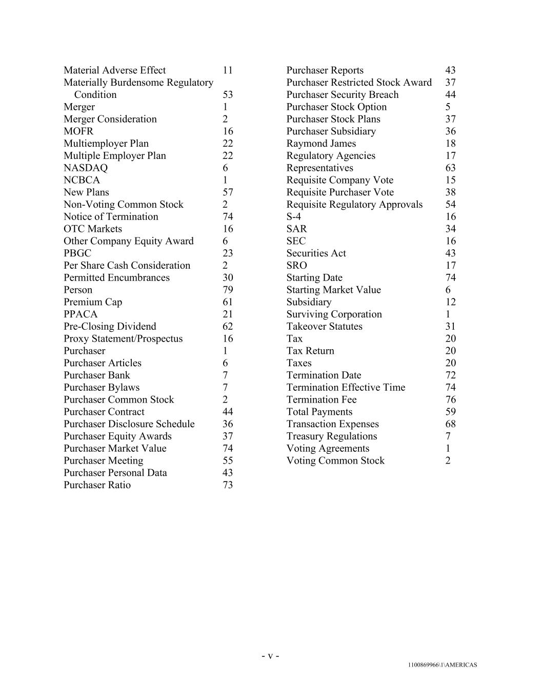 - v - 1100869966\1\AMERICAS Material Adverse Effect 11 Materially Burdensome Regulatory Condition 53 Merger 1 Merger Consideration 2 MOFR 16 Multiemployer Plan 22 Multiple Employer Plan 22 NASDAQ 6 NCBCA 1 New Plans 57 Non-Voting Common Stock 2 Notice of Termination 74 OTC Markets 16 Other Company Equity Award 6 PBGC 23 Per Share Cash Consideration 2 Permitted Encumbrances 30 Person 79 Premium Cap 61 PPACA 21 Pre-Closing Dividend 62 Proxy Statement/Prospectus 16 Purchaser 1 Purchaser Articles 6 Purchaser Bank 7 Purchaser Bylaws 7 Purchaser Common Stock 2 Purchaser Contract 44 Purchaser Disclosure Schedule 36 Purchaser Equity Awards 37 Purchaser Market Value 74 Purchaser Meeting 55 Purchaser Personal Data 43 Purchaser Ratio 73 Purchaser Reports 43 Purchaser Restricted Stock Award 37 Purchaser Security Breach 44 Purchaser Stock Option 5 Purchaser Stock Plans 37 Purchaser Subsidiary 36 Raymond James 18 Regulatory Agencies 17 Representatives 63 Requisite Company Vote 15 Requisite Purchaser Vote 38 Requisite Regulatory Approvals 54 S-4 16 SAR 34 SEC 16 Securities Act 43 SRO 17 Starting Date 74 Starting Market Value 6 Subsidiary 12 Surviving Corporation 1 Takeover Statutes 31 Tax 20 Tax Return 20 Taxes 20 Termination Date 72 Termination Effective Time 74 Termination Fee 76 Total Payments 59 Transaction Expenses 68 Treasury Regulations 7 Voting Agreements 1 Voting Common Stock 2