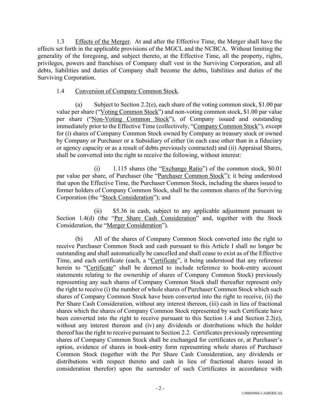 - 2 - 1100869966\1\AMERICAS 1.3 Effects of the Merger. At and after the Effective Time, the Merger shall have the effects set forth in the applicable provisions of the MGCL and the NCBCA. Without limiting the generality of the foregoing, and subject thereto, at the Effective Time, all the property, rights, privileges, powers and franchises of Company shall vest in the Surviving Corporation, and all debts, liabilities and duties of Company shall become the debts, liabilities and duties of the Surviving Corporation. 1.4 Conversion of Company Common Stock. (a) Subject to Section 2.2(e), each share of the voting common stock, $1.00 par value per share (“Voting Common Stock”) and non-voting common stock, $1.00 par value per share (“Non-Voting Common Stock”), of Company issued and outstanding immediately prior to the Effective Time (collectively, “Company Common Stock”), except for (i) shares of Company Common Stock owned by Company as treasury stock or owned by Company or Purchaser or a Subsidiary of either (in each case other than in a fiduciary or agency capacity or as a result of debts previously contracted) and (ii) Appraisal Shares, shall be converted into the right to receive the following, without interest: (i) 1.115 shares (the “Exchange Ratio”) of the common stock, $0.01 par value per share, of Purchaser (the “Purchaser Common Stock”); it being understood that upon the Effective Time, the Purchaser Common Stock, including the shares issued to former holders of Company Common Stock, shall be the common shares of the Surviving Corporation (the “Stock Consideration”); and (ii) $5.36 in cash, subject to any applicable adjustment pursuant to Section 1.4(d) (the “Per Share Cash Consideration” and, together with the Stock Consideration, the “Merger Consideration”). (b) All of the shares of Company Common Stock converted into the right to receive Purchaser Common Stock and cash pursuant to this Article I shall no longer be outstanding and shall automatically be cancelled and shall cease to exist as of the Effective Time, and each certificate (each, a “Certificate”, it being understood that any reference herein to “Certificate” shall be deemed to include reference to book-entry account statements relating to the ownership of shares of Company Common Stock) previously representing any such shares of Company Common Stock shall thereafter represent only the right to receive (i) the number of whole shares of Purchaser Common Stock which such shares of Company Common Stock have been converted into the right to receive, (ii) the Per Share Cash Consideration, without any interest thereon, (iii) cash in lieu of fractional shares which the shares of Company Common Stock represented by such Certificate have been converted into the right to receive pursuant to this Section 1.4 and Section 2.2(e), without any interest thereon and (iv) any dividends or distributions which the holder thereof has the right to receive pursuant to Section 2.2. Certificates previously representing shares of Company Common Stock shall be exchanged for certificates or, at Purchaser’s option, evidence of shares in book-entry form representing whole shares of Purchaser Common Stock (together with the Per Share Cash Consideration, any dividends or distributions with respect thereto and cash in lieu of fractional shares issued in consideration therefor) upon the surrender of such Certificates in accordance with