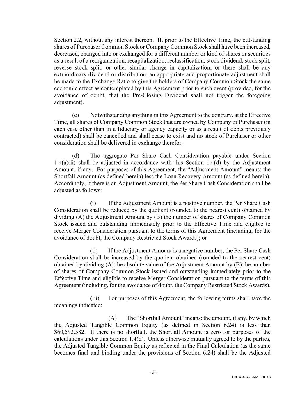 - 3 - 1100869966\1\AMERICAS Section 2.2, without any interest thereon. If, prior to the Effective Time, the outstanding shares of Purchaser Common Stock or Company Common Stock shall have been increased, decreased, changed into or exchanged for a different number or kind of shares or securities as a result of a reorganization, recapitalization, reclassification, stock dividend, stock split, reverse stock split, or other similar change in capitalization, or there shall be any extraordinary dividend or distribution, an appropriate and proportionate adjustment shall be made to the Exchange Ratio to give the holders of Company Common Stock the same economic effect as contemplated by this Agreement prior to such event (provided, for the avoidance of doubt, that the Pre-Closing Dividend shall not trigger the foregoing adjustment). (c) Notwithstanding anything in this Agreement to the contrary, at the Effective Time, all shares of Company Common Stock that are owned by Company or Purchaser (in each case other than in a fiduciary or agency capacity or as a result of debts previously contracted) shall be cancelled and shall cease to exist and no stock of Purchaser or other consideration shall be delivered in exchange therefor. (d) The aggregate Per Share Cash Consideration payable under Section 1.4(a)(ii) shall be adjusted in accordance with this Section 1.4(d) by the Adjustment Amount, if any. For purposes of this Agreement, the “Adjustment Amount” means: the Shortfall Amount (as defined herein) less the Loan Recovery Amount (as defined herein). Accordingly, if there is an Adjustment Amount, the Per Share Cash Consideration shall be adjusted as follows: (i) If the Adjustment Amount is a positive number, the Per Share Cash Consideration shall be reduced by the quotient (rounded to the nearest cent) obtained by dividing (A) the Adjustment Amount by (B) the number of shares of Company Common Stock issued and outstanding immediately prior to the Effective Time and eligible to receive Merger Consideration pursuant to the terms of this Agreement (including, for the avoidance of doubt, the Company Restricted Stock Awards); or (ii) If the Adjustment Amount is a negative number, the Per Share Cash Consideration shall be increased by the quotient obtained (rounded to the nearest cent) obtained by dividing (A) the absolute value of the Adjustment Amount by (B) the number of shares of Company Common Stock issued and outstanding immediately prior to the Effective Time and eligible to receive Merger Consideration pursuant to the terms of this Agreement (including, for the avoidance of doubt, the Company Restricted Stock Awards). (iii) For purposes of this Agreement, the following terms shall have the meanings indicated: (A) The “Shortfall Amount” means: the amount, if any, by which the Adjusted Tangible Common Equity (as defined in Section 6.24) is less than $60,593,582. If there is no shortfall, the Shortfall Amount is zero for purposes of the calculations under this Section 1.4(d). Unless otherwise mutually agreed to by the parties, the Adjusted Tangible Common Equity as reflected in the Final Calculation (as the same becomes final and binding under the provisions of Section 6.24) shall be the Adjusted
