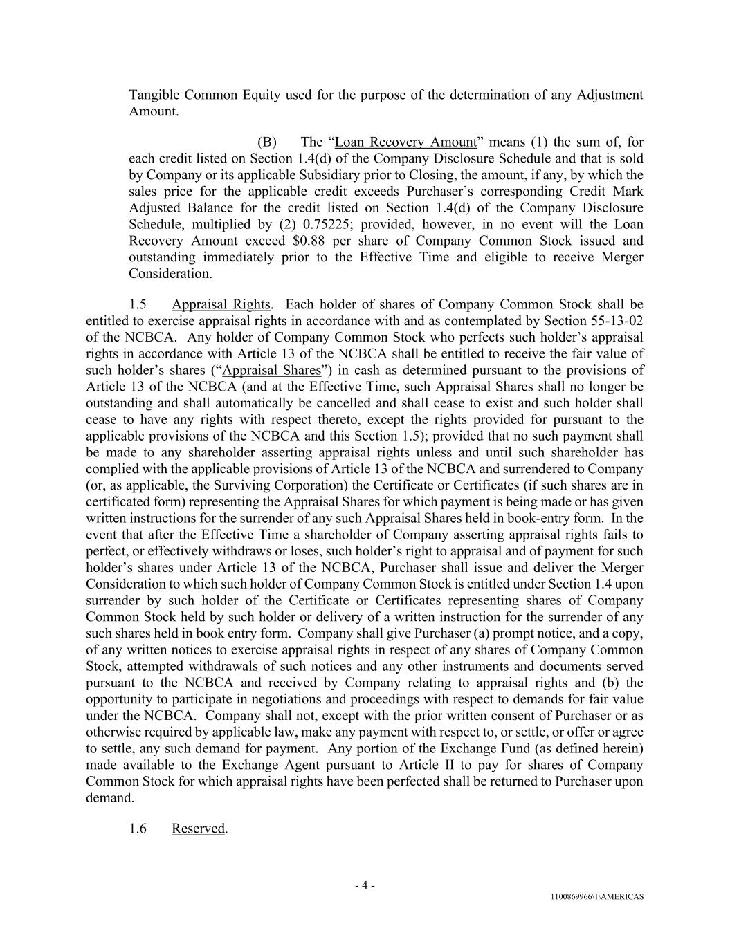 - 4 - 1100869966\1\AMERICAS Tangible Common Equity used for the purpose of the determination of any Adjustment Amount. (B) The “Loan Recovery Amount” means (1) the sum of, for each credit listed on Section 1.4(d) of the Company Disclosure Schedule and that is sold by Company or its applicable Subsidiary prior to Closing, the amount, if any, by which the sales price for the applicable credit exceeds Purchaser’s corresponding Credit Mark Adjusted Balance for the credit listed on Section 1.4(d) of the Company Disclosure Schedule, multiplied by (2) 0.75225; provided, however, in no event will the Loan Recovery Amount exceed $0.88 per share of Company Common Stock issued and outstanding immediately prior to the Effective Time and eligible to receive Merger Consideration. 1.5 Appraisal Rights. Each holder of shares of Company Common Stock shall be entitled to exercise appraisal rights in accordance with and as contemplated by Section 55-13-02 of the NCBCA. Any holder of Company Common Stock who perfects such holder’s appraisal rights in accordance with Article 13 of the NCBCA shall be entitled to receive the fair value of such holder’s shares (“Appraisal Shares”) in cash as determined pursuant to the provisions of Article 13 of the NCBCA (and at the Effective Time, such Appraisal Shares shall no longer be outstanding and shall automatically be cancelled and shall cease to exist and such holder shall cease to have any rights with respect thereto, except the rights provided for pursuant to the applicable provisions of the NCBCA and this Section 1.5); provided that no such payment shall be made to any shareholder asserting appraisal rights unless and until such shareholder has complied with the applicable provisions of Article 13 of the NCBCA and surrendered to Company (or, as applicable, the Surviving Corporation) the Certificate or Certificates (if such shares are in certificated form) representing the Appraisal Shares for which payment is being made or has given written instructions for the surrender of any such Appraisal Shares held in book-entry form. In the event that after the Effective Time a shareholder of Company asserting appraisal rights fails to perfect, or effectively withdraws or loses, such holder’s right to appraisal and of payment for such holder’s shares under Article 13 of the NCBCA, Purchaser shall issue and deliver the Merger Consideration to which such holder of Company Common Stock is entitled under Section 1.4 upon surrender by such holder of the Certificate or Certificates representing shares of Company Common Stock held by such holder or delivery of a written instruction for the surrender of any such shares held in book entry form. Company shall give Purchaser (a) prompt notice, and a copy, of any written notices to exercise appraisal rights in respect of any shares of Company Common Stock, attempted withdrawals of such notices and any other instruments and documents served pursuant to the NCBCA and received by Company relating to appraisal rights and (b) the opportunity to participate in negotiations and proceedings with respect to demands for fair value under the NCBCA. Company shall not, except with the prior written consent of Purchaser or as otherwise required by applicable law, make any payment with respect to, or settle, or offer or agree to settle, any such demand for payment. Any portion of the Exchange Fund (as defined herein) made available to the Exchange Agent pursuant to Article II to pay for shares of Company Common Stock for which appraisal rights have been perfected shall be returned to Purchaser upon demand. 1.6 Reserved.