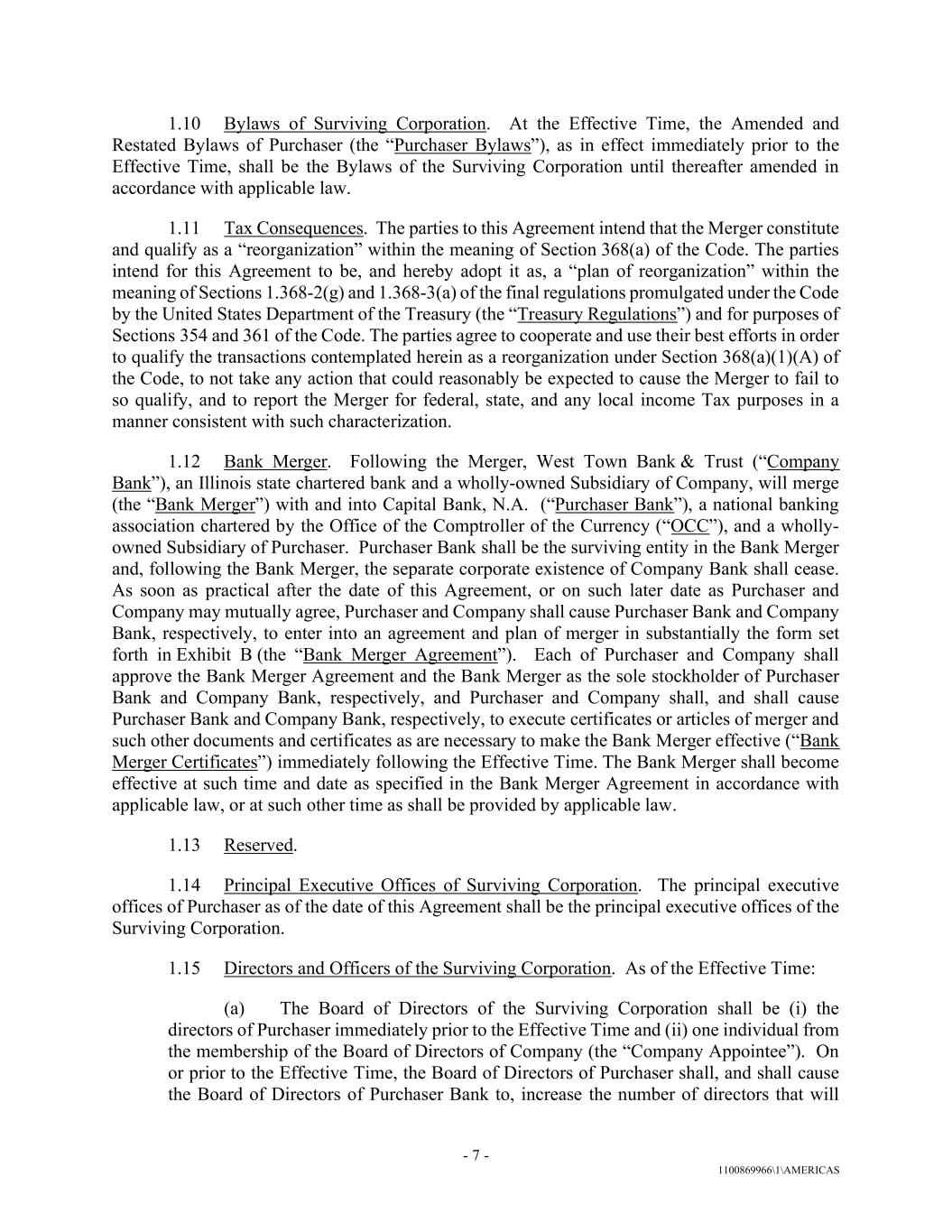 - 7 - 1100869966\1\AMERICAS 1.10 Bylaws of Surviving Corporation. At the Effective Time, the Amended and Restated Bylaws of Purchaser (the “Purchaser Bylaws”), as in effect immediately prior to the Effective Time, shall be the Bylaws of the Surviving Corporation until thereafter amended in accordance with applicable law. 1.11 Tax Consequences. The parties to this Agreement intend that the Merger constitute and qualify as a “reorganization” within the meaning of Section 368(a) of the Code. The parties intend for this Agreement to be, and hereby adopt it as, a “plan of reorganization” within the meaning of Sections 1.368-2(g) and 1.368-3(a) of the final regulations promulgated under the Code by the United States Department of the Treasury (the “Treasury Regulations”) and for purposes of Sections 354 and 361 of the Code. The parties agree to cooperate and use their best efforts in order to qualify the transactions contemplated herein as a reorganization under Section 368(a)(1)(A) of the Code, to not take any action that could reasonably be expected to cause the Merger to fail to so qualify, and to report the Merger for federal, state, and any local income Tax purposes in a manner consistent with such characterization. 1.12 Bank Merger. Following the Merger, West Town Bank & Trust (“Company Bank”), an Illinois state chartered bank and a wholly-owned Subsidiary of Company, will merge (the “Bank Merger”) with and into Capital Bank, N.A. (“Purchaser Bank”), a national banking association chartered by the Office of the Comptroller of the Currency (“OCC”), and a wholly- owned Subsidiary of Purchaser. Purchaser Bank shall be the surviving entity in the Bank Merger and, following the Bank Merger, the separate corporate existence of Company Bank shall cease. As soon as practical after the date of this Agreement, or on such later date as Purchaser and Company may mutually agree, Purchaser and Company shall cause Purchaser Bank and Company Bank, respectively, to enter into an agreement and plan of merger in substantially the form set forth in Exhibit B (the “Bank Merger Agreement”). Each of Purchaser and Company shall approve the Bank Merger Agreement and the Bank Merger as the sole stockholder of Purchaser Bank and Company Bank, respectively, and Purchaser and Company shall, and shall cause Purchaser Bank and Company Bank, respectively, to execute certificates or articles of merger and such other documents and certificates as are necessary to make the Bank Merger effective (“Bank Merger Certificates”) immediately following the Effective Time. The Bank Merger shall become effective at such time and date as specified in the Bank Merger Agreement in accordance with applicable law, or at such other time as shall be provided by applicable law. 1.13 Reserved. 1.14 Principal Executive Offices of Surviving Corporation. The principal executive offices of Purchaser as of the date of this Agreement shall be the principal executive offices of the Surviving Corporation. 1.15 Directors and Officers of the Surviving Corporation. As of the Effective Time: (a) The Board of Directors of the Surviving Corporation shall be (i) the directors of Purchaser immediately prior to the Effective Time and (ii) one individual from the membership of the Board of Directors of Company (the “Company Appointee”). On or prior to the Effective Time, the Board of Directors of Purchaser shall, and shall cause the Board of Directors of Purchaser Bank to, increase the number of directors that will