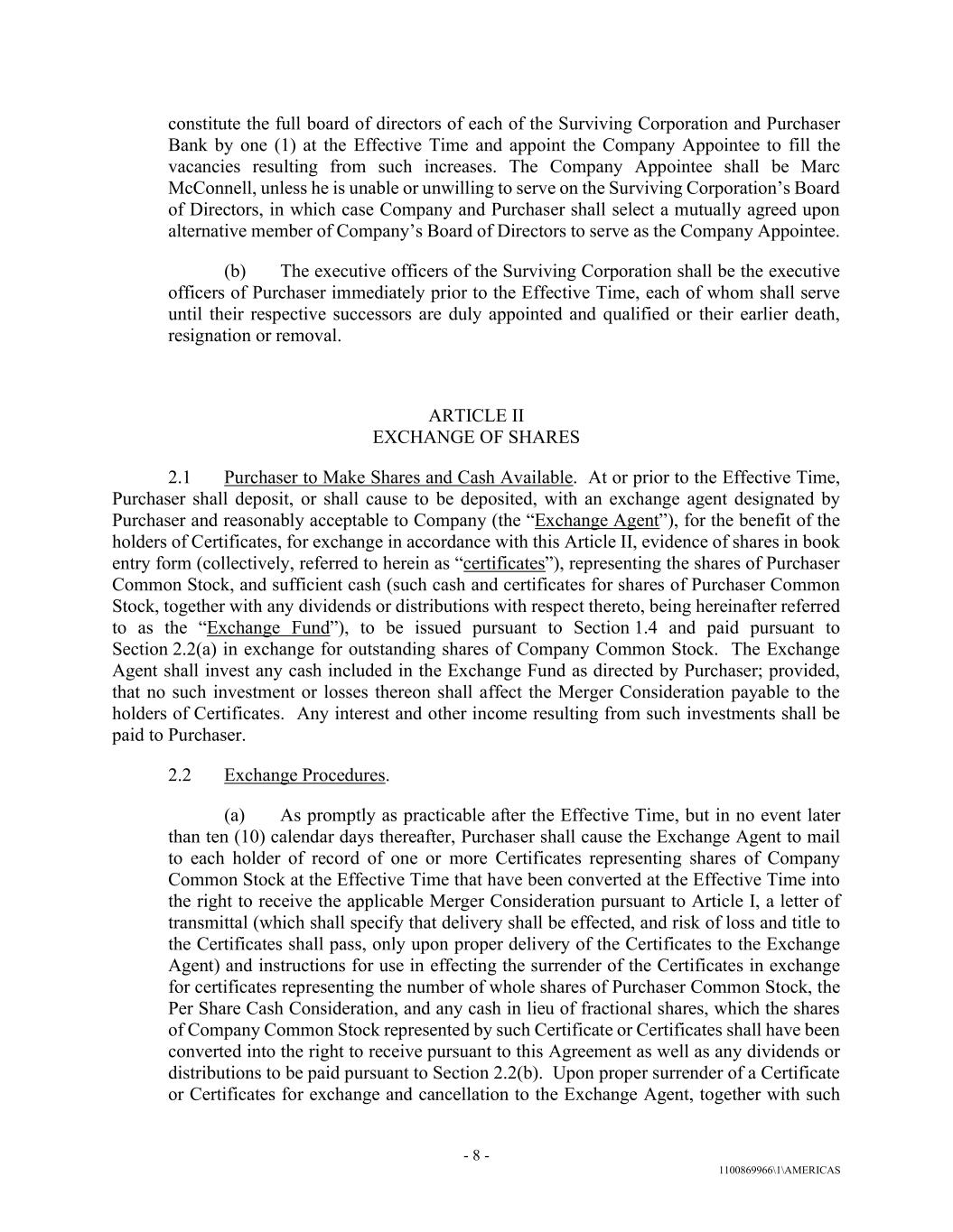 - 8 - 1100869966\1\AMERICAS constitute the full board of directors of each of the Surviving Corporation and Purchaser Bank by one (1) at the Effective Time and appoint the Company Appointee to fill the vacancies resulting from such increases. The Company Appointee shall be Marc McConnell, unless he is unable or unwilling to serve on the Surviving Corporation’s Board of Directors, in which case Company and Purchaser shall select a mutually agreed upon alternative member of Company’s Board of Directors to serve as the Company Appointee. (b) The executive officers of the Surviving Corporation shall be the executive officers of Purchaser immediately prior to the Effective Time, each of whom shall serve until their respective successors are duly appointed and qualified or their earlier death, resignation or removal. ARTICLE II EXCHANGE OF SHARES 2.1 Purchaser to Make Shares and Cash Available. At or prior to the Effective Time, Purchaser shall deposit, or shall cause to be deposited, with an exchange agent designated by Purchaser and reasonably acceptable to Company (the “Exchange Agent”), for the benefit of the holders of Certificates, for exchange in accordance with this Article II, evidence of shares in book entry form (collectively, referred to herein as “certificates”), representing the shares of Purchaser Common Stock, and sufficient cash (such cash and certificates for shares of Purchaser Common Stock, together with any dividends or distributions with respect thereto, being hereinafter referred to as the “Exchange Fund”), to be issued pursuant to Section 1.4 and paid pursuant to Section 2.2(a) in exchange for outstanding shares of Company Common Stock. The Exchange Agent shall invest any cash included in the Exchange Fund as directed by Purchaser; provided, that no such investment or losses thereon shall affect the Merger Consideration payable to the holders of Certificates. Any interest and other income resulting from such investments shall be paid to Purchaser. 2.2 Exchange Procedures. (a) As promptly as practicable after the Effective Time, but in no event later than ten (10) calendar days thereafter, Purchaser shall cause the Exchange Agent to mail to each holder of record of one or more Certificates representing shares of Company Common Stock at the Effective Time that have been converted at the Effective Time into the right to receive the applicable Merger Consideration pursuant to Article I, a letter of transmittal (which shall specify that delivery shall be effected, and risk of loss and title to the Certificates shall pass, only upon proper delivery of the Certificates to the Exchange Agent) and instructions for use in effecting the surrender of the Certificates in exchange for certificates representing the number of whole shares of Purchaser Common Stock, the Per Share Cash Consideration, and any cash in lieu of fractional shares, which the shares of Company Common Stock represented by such Certificate or Certificates shall have been converted into the right to receive pursuant to this Agreement as well as any dividends or distributions to be paid pursuant to Section 2.2(b). Upon proper surrender of a Certificate or Certificates for exchange and cancellation to the Exchange Agent, together with such