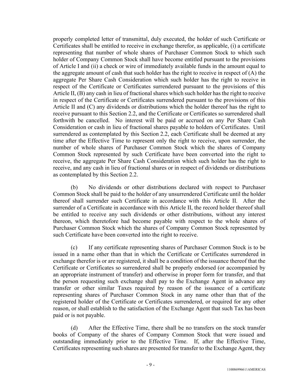 - 9 - 1100869966\1\AMERICAS properly completed letter of transmittal, duly executed, the holder of such Certificate or Certificates shall be entitled to receive in exchange therefor, as applicable, (i) a certificate representing that number of whole shares of Purchaser Common Stock to which such holder of Company Common Stock shall have become entitled pursuant to the provisions of Article I and (ii) a check or wire of immediately available funds in the amount equal to the aggregate amount of cash that such holder has the right to receive in respect of (A) the aggregate Per Share Cash Consideration which such holder has the right to receive in respect of the Certificate or Certificates surrendered pursuant to the provisions of this Article II, (B) any cash in lieu of fractional shares which such holder has the right to receive in respect of the Certificate or Certificates surrendered pursuant to the provisions of this Article II and (C) any dividends or distributions which the holder thereof has the right to receive pursuant to this Section 2.2, and the Certificate or Certificates so surrendered shall forthwith be cancelled. No interest will be paid or accrued on any Per Share Cash Consideration or cash in lieu of fractional shares payable to holders of Certificates. Until surrendered as contemplated by this Section 2.2, each Certificate shall be deemed at any time after the Effective Time to represent only the right to receive, upon surrender, the number of whole shares of Purchaser Common Stock which the shares of Company Common Stock represented by such Certificate have been converted into the right to receive, the aggregate Per Share Cash Consideration which such holder has the right to receive, and any cash in lieu of fractional shares or in respect of dividends or distributions as contemplated by this Section 2.2. (b) No dividends or other distributions declared with respect to Purchaser Common Stock shall be paid to the holder of any unsurrendered Certificate until the holder thereof shall surrender such Certificate in accordance with this Article II. After the surrender of a Certificate in accordance with this Article II, the record holder thereof shall be entitled to receive any such dividends or other distributions, without any interest thereon, which theretofore had become payable with respect to the whole shares of Purchaser Common Stock which the shares of Company Common Stock represented by such Certificate have been converted into the right to receive. (c) If any certificate representing shares of Purchaser Common Stock is to be issued in a name other than that in which the Certificate or Certificates surrendered in exchange therefor is or are registered, it shall be a condition of the issuance thereof that the Certificate or Certificates so surrendered shall be properly endorsed (or accompanied by an appropriate instrument of transfer) and otherwise in proper form for transfer, and that the person requesting such exchange shall pay to the Exchange Agent in advance any transfer or other similar Taxes required by reason of the issuance of a certificate representing shares of Purchaser Common Stock in any name other than that of the registered holder of the Certificate or Certificates surrendered, or required for any other reason, or shall establish to the satisfaction of the Exchange Agent that such Tax has been paid or is not payable. (d) After the Effective Time, there shall be no transfers on the stock transfer books of Company of the shares of Company Common Stock that were issued and outstanding immediately prior to the Effective Time. If, after the Effective Time, Certificates representing such shares are presented for transfer to the Exchange Agent, they