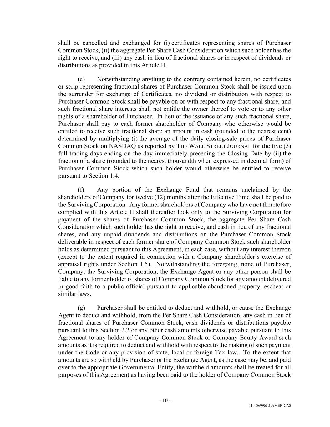 - 10 - 1100869966\1\AMERICAS shall be cancelled and exchanged for (i) certificates representing shares of Purchaser Common Stock, (ii) the aggregate Per Share Cash Consideration which such holder has the right to receive, and (iii) any cash in lieu of fractional shares or in respect of dividends or distributions as provided in this Article II. (e) Notwithstanding anything to the contrary contained herein, no certificates or scrip representing fractional shares of Purchaser Common Stock shall be issued upon the surrender for exchange of Certificates, no dividend or distribution with respect to Purchaser Common Stock shall be payable on or with respect to any fractional share, and such fractional share interests shall not entitle the owner thereof to vote or to any other rights of a shareholder of Purchaser. In lieu of the issuance of any such fractional share, Purchaser shall pay to each former shareholder of Company who otherwise would be entitled to receive such fractional share an amount in cash (rounded to the nearest cent) determined by multiplying (i) the average of the daily closing-sale prices of Purchaser Common Stock on NASDAQ as reported by THE WALL STREET JOURNAL for the five (5) full trading days ending on the day immediately preceding the Closing Date by (ii) the fraction of a share (rounded to the nearest thousandth when expressed in decimal form) of Purchaser Common Stock which such holder would otherwise be entitled to receive pursuant to Section 1.4. (f) Any portion of the Exchange Fund that remains unclaimed by the shareholders of Company for twelve (12) months after the Effective Time shall be paid to the Surviving Corporation. Any former shareholders of Company who have not theretofore complied with this Article II shall thereafter look only to the Surviving Corporation for payment of the shares of Purchaser Common Stock, the aggregate Per Share Cash Consideration which such holder has the right to receive, and cash in lieu of any fractional shares, and any unpaid dividends and distributions on the Purchaser Common Stock deliverable in respect of each former share of Company Common Stock such shareholder holds as determined pursuant to this Agreement, in each case, without any interest thereon (except to the extent required in connection with a Company shareholder’s exercise of appraisal rights under Section 1.5). Notwithstanding the foregoing, none of Purchaser, Company, the Surviving Corporation, the Exchange Agent or any other person shall be liable to any former holder of shares of Company Common Stock for any amount delivered in good faith to a public official pursuant to applicable abandoned property, escheat or similar laws. (g) Purchaser shall be entitled to deduct and withhold, or cause the Exchange Agent to deduct and withhold, from the Per Share Cash Consideration, any cash in lieu of fractional shares of Purchaser Common Stock, cash dividends or distributions payable pursuant to this Section 2.2 or any other cash amounts otherwise payable pursuant to this Agreement to any holder of Company Common Stock or Company Equity Award such amounts as it is required to deduct and withhold with respect to the making of such payment under the Code or any provision of state, local or foreign Tax law. To the extent that amounts are so withheld by Purchaser or the Exchange Agent, as the case may be, and paid over to the appropriate Governmental Entity, the withheld amounts shall be treated for all purposes of this Agreement as having been paid to the holder of Company Common Stock