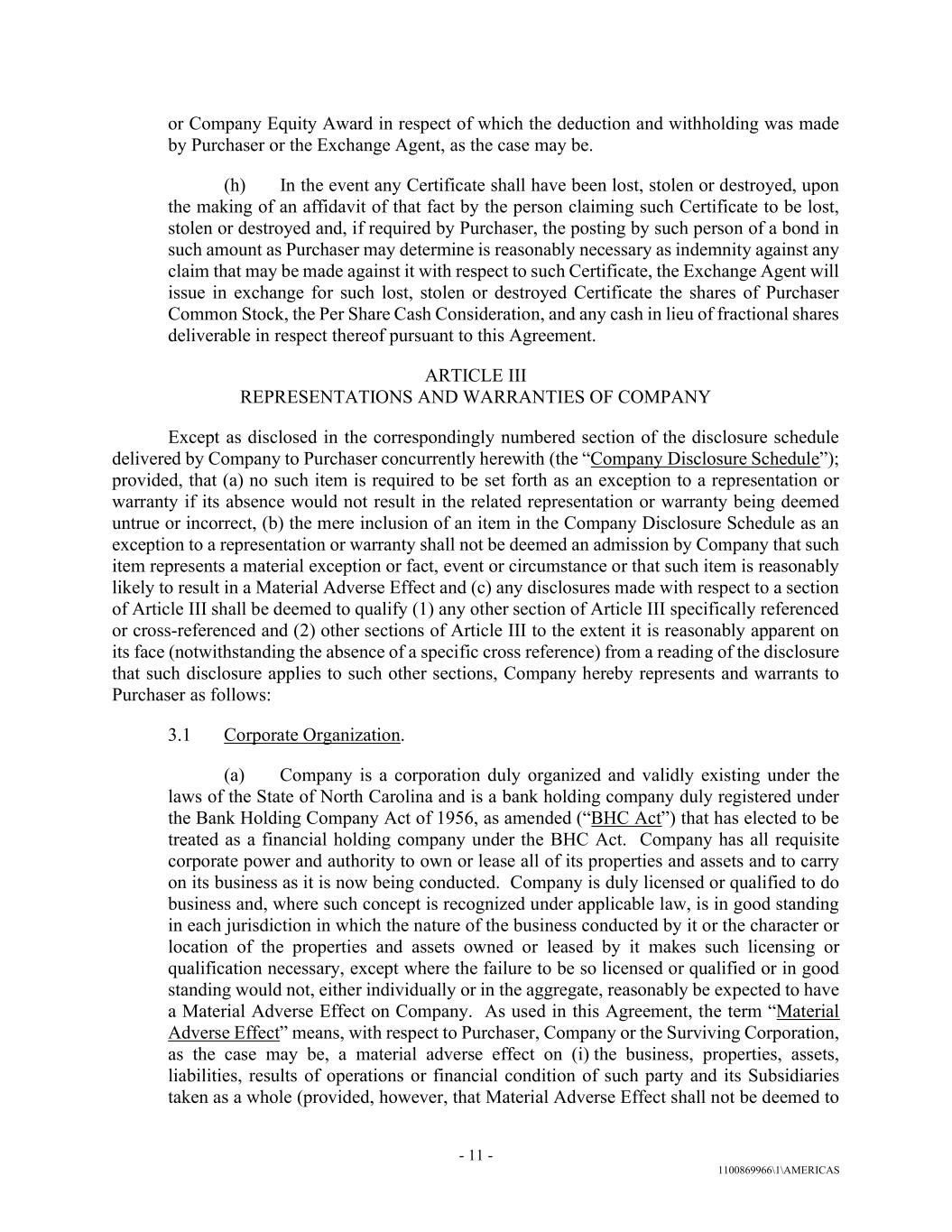 - 11 - 1100869966\1\AMERICAS or Company Equity Award in respect of which the deduction and withholding was made by Purchaser or the Exchange Agent, as the case may be. (h) In the event any Certificate shall have been lost, stolen or destroyed, upon the making of an affidavit of that fact by the person claiming such Certificate to be lost, stolen or destroyed and, if required by Purchaser, the posting by such person of a bond in such amount as Purchaser may determine is reasonably necessary as indemnity against any claim that may be made against it with respect to such Certificate, the Exchange Agent will issue in exchange for such lost, stolen or destroyed Certificate the shares of Purchaser Common Stock, the Per Share Cash Consideration, and any cash in lieu of fractional shares deliverable in respect thereof pursuant to this Agreement. ARTICLE III REPRESENTATIONS AND WARRANTIES OF COMPANY Except as disclosed in the correspondingly numbered section of the disclosure schedule delivered by Company to Purchaser concurrently herewith (the “Company Disclosure Schedule”); provided, that (a) no such item is required to be set forth as an exception to a representation or warranty if its absence would not result in the related representation or warranty being deemed untrue or incorrect, (b) the mere inclusion of an item in the Company Disclosure Schedule as an exception to a representation or warranty shall not be deemed an admission by Company that such item represents a material exception or fact, event or circumstance or that such item is reasonably likely to result in a Material Adverse Effect and (c) any disclosures made with respect to a section of Article III shall be deemed to qualify (1) any other section of Article III specifically referenced or cross-referenced and (2) other sections of Article III to the extent it is reasonably apparent on its face (notwithstanding the absence of a specific cross reference) from a reading of the disclosure that such disclosure applies to such other sections, Company hereby represents and warrants to Purchaser as follows: 3.1 Corporate Organization. (a) Company is a corporation duly organized and validly existing under the laws of the State of North Carolina and is a bank holding company duly registered under the Bank Holding Company Act of 1956, as amended (“BHC Act”) that has elected to be treated as a financial holding company under the BHC Act. Company has all requisite corporate power and authority to own or lease all of its properties and assets and to carry on its business as it is now being conducted. Company is duly licensed or qualified to do business and, where such concept is recognized under applicable law, is in good standing in each jurisdiction in which the nature of the business conducted by it or the character or location of the properties and assets owned or leased by it makes such licensing or qualification necessary, except where the failure to be so licensed or qualified or in good standing would not, either individually or in the aggregate, reasonably be expected to have a Material Adverse Effect on Company. As used in this Agreement, the term “Material Adverse Effect” means, with respect to Purchaser, Company or the Surviving Corporation, as the case may be, a material adverse effect on (i) the business, properties, assets, liabilities, results of operations or financial condition of such party and its Subsidiaries taken as a whole (provided, however, that Material Adverse Effect shall not be deemed to