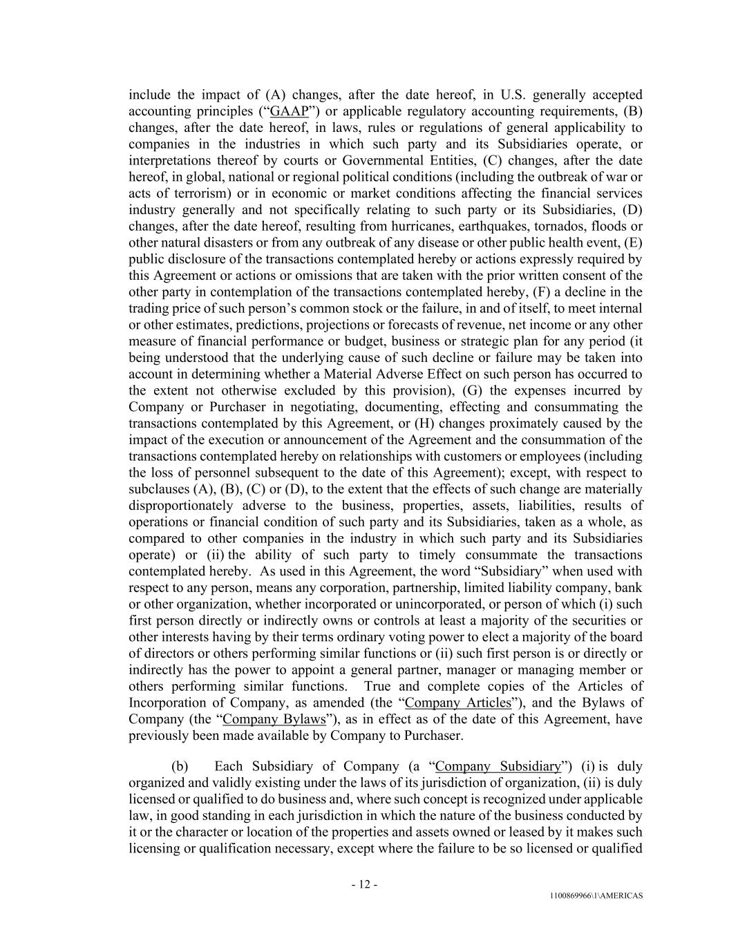 - 12 - 1100869966\1\AMERICAS include the impact of (A) changes, after the date hereof, in U.S. generally accepted accounting principles (“GAAP”) or applicable regulatory accounting requirements, (B) changes, after the date hereof, in laws, rules or regulations of general applicability to companies in the industries in which such party and its Subsidiaries operate, or interpretations thereof by courts or Governmental Entities, (C) changes, after the date hereof, in global, national or regional political conditions (including the outbreak of war or acts of terrorism) or in economic or market conditions affecting the financial services industry generally and not specifically relating to such party or its Subsidiaries, (D) changes, after the date hereof, resulting from hurricanes, earthquakes, tornados, floods or other natural disasters or from any outbreak of any disease or other public health event, (E) public disclosure of the transactions contemplated hereby or actions expressly required by this Agreement or actions or omissions that are taken with the prior written consent of the other party in contemplation of the transactions contemplated hereby, (F) a decline in the trading price of such person’s common stock or the failure, in and of itself, to meet internal or other estimates, predictions, projections or forecasts of revenue, net income or any other measure of financial performance or budget, business or strategic plan for any period (it being understood that the underlying cause of such decline or failure may be taken into account in determining whether a Material Adverse Effect on such person has occurred to the extent not otherwise excluded by this provision), (G) the expenses incurred by Company or Purchaser in negotiating, documenting, effecting and consummating the transactions contemplated by this Agreement, or (H) changes proximately caused by the impact of the execution or announcement of the Agreement and the consummation of the transactions contemplated hereby on relationships with customers or employees (including the loss of personnel subsequent to the date of this Agreement); except, with respect to subclauses (A), (B), (C) or (D), to the extent that the effects of such change are materially disproportionately adverse to the business, properties, assets, liabilities, results of operations or financial condition of such party and its Subsidiaries, taken as a whole, as compared to other companies in the industry in which such party and its Subsidiaries operate) or (ii) the ability of such party to timely consummate the transactions contemplated hereby. As used in this Agreement, the word “Subsidiary” when used with respect to any person, means any corporation, partnership, limited liability company, bank or other organization, whether incorporated or unincorporated, or person of which (i) such first person directly or indirectly owns or controls at least a majority of the securities or other interests having by their terms ordinary voting power to elect a majority of the board of directors or others performing similar functions or (ii) such first person is or directly or indirectly has the power to appoint a general partner, manager or managing member or others performing similar functions. True and complete copies of the Articles of Incorporation of Company, as amended (the “Company Articles”), and the Bylaws of Company (the “Company Bylaws”), as in effect as of the date of this Agreement, have previously been made available by Company to Purchaser. (b) Each Subsidiary of Company (a “Company Subsidiary”) (i) is duly organized and validly existing under the laws of its jurisdiction of organization, (ii) is duly licensed or qualified to do business and, where such concept is recognized under applicable law, in good standing in each jurisdiction in which the nature of the business conducted by it or the character or location of the properties and assets owned or leased by it makes such licensing or qualification necessary, except where the failure to be so licensed or qualified