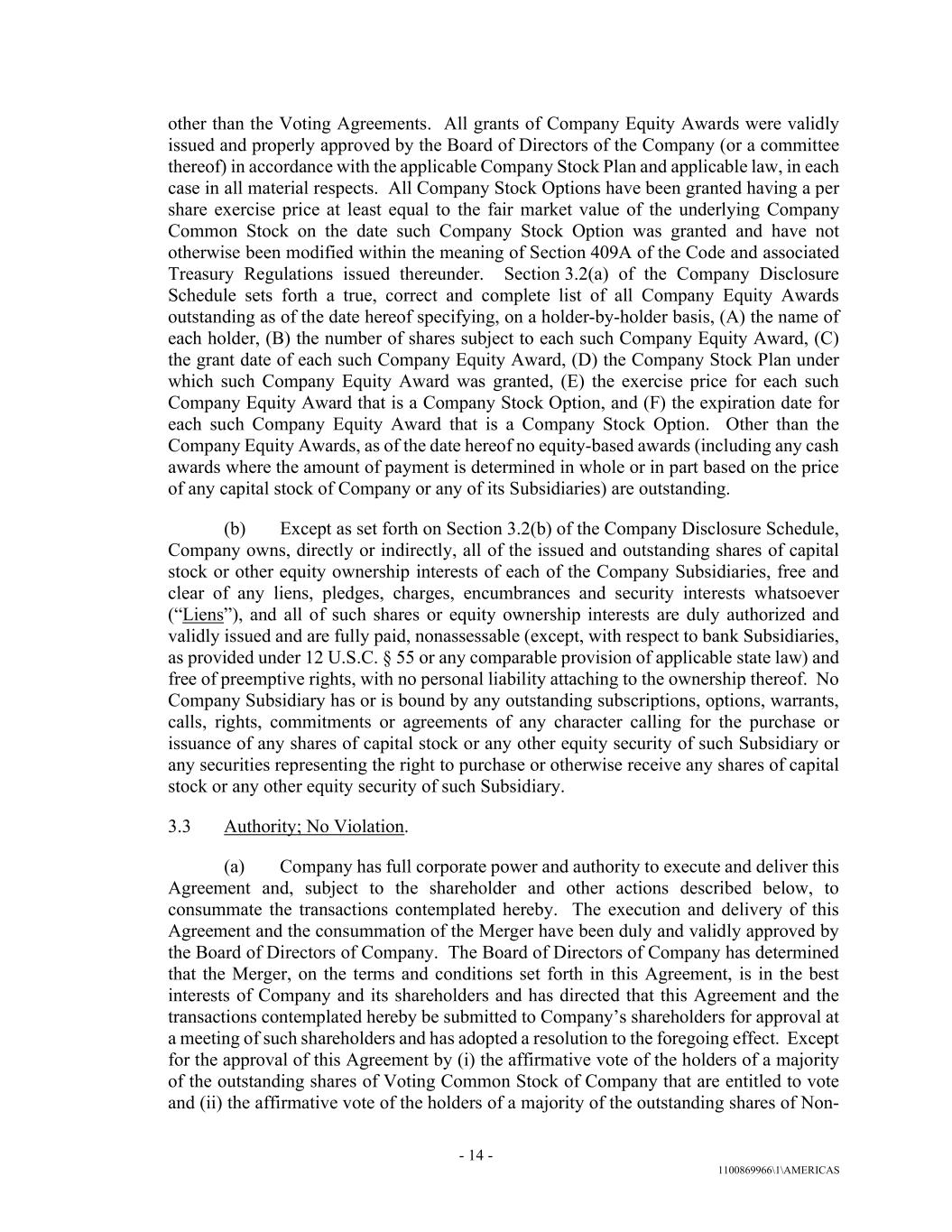 - 14 - 1100869966\1\AMERICAS other than the Voting Agreements. All grants of Company Equity Awards were validly issued and properly approved by the Board of Directors of the Company (or a committee thereof) in accordance with the applicable Company Stock Plan and applicable law, in each case in all material respects. All Company Stock Options have been granted having a per share exercise price at least equal to the fair market value of the underlying Company Common Stock on the date such Company Stock Option was granted and have not otherwise been modified within the meaning of Section 409A of the Code and associated Treasury Regulations issued thereunder. Section 3.2(a) of the Company Disclosure Schedule sets forth a true, correct and complete list of all Company Equity Awards outstanding as of the date hereof specifying, on a holder-by-holder basis, (A) the name of each holder, (B) the number of shares subject to each such Company Equity Award, (C) the grant date of each such Company Equity Award, (D) the Company Stock Plan under which such Company Equity Award was granted, (E) the exercise price for each such Company Equity Award that is a Company Stock Option, and (F) the expiration date for each such Company Equity Award that is a Company Stock Option. Other than the Company Equity Awards, as of the date hereof no equity-based awards (including any cash awards where the amount of payment is determined in whole or in part based on the price of any capital stock of Company or any of its Subsidiaries) are outstanding. (b) Except as set forth on Section 3.2(b) of the Company Disclosure Schedule, Company owns, directly or indirectly, all of the issued and outstanding shares of capital stock or other equity ownership interests of each of the Company Subsidiaries, free and clear of any liens, pledges, charges, encumbrances and security interests whatsoever (“Liens”), and all of such shares or equity ownership interests are duly authorized and validly issued and are fully paid, nonassessable (except, with respect to bank Subsidiaries, as provided under 12 U.S.C. § 55 or any comparable provision of applicable state law) and free of preemptive rights, with no personal liability attaching to the ownership thereof. No Company Subsidiary has or is bound by any outstanding subscriptions, options, warrants, calls, rights, commitments or agreements of any character calling for the purchase or issuance of any shares of capital stock or any other equity security of such Subsidiary or any securities representing the right to purchase or otherwise receive any shares of capital stock or any other equity security of such Subsidiary. 3.3 Authority; No Violation. (a) Company has full corporate power and authority to execute and deliver this Agreement and, subject to the shareholder and other actions described below, to consummate the transactions contemplated hereby. The execution and delivery of this Agreement and the consummation of the Merger have been duly and validly approved by the Board of Directors of Company. The Board of Directors of Company has determined that the Merger, on the terms and conditions set forth in this Agreement, is in the best interests of Company and its shareholders and has directed that this Agreement and the transactions contemplated hereby be submitted to Company’s shareholders for approval at a meeting of such shareholders and has adopted a resolution to the foregoing effect. Except for the approval of this Agreement by (i) the affirmative vote of the holders of a majority of the outstanding shares of Voting Common Stock of Company that are entitled to vote and (ii) the affirmative vote of the holders of a majority of the outstanding shares of Non-