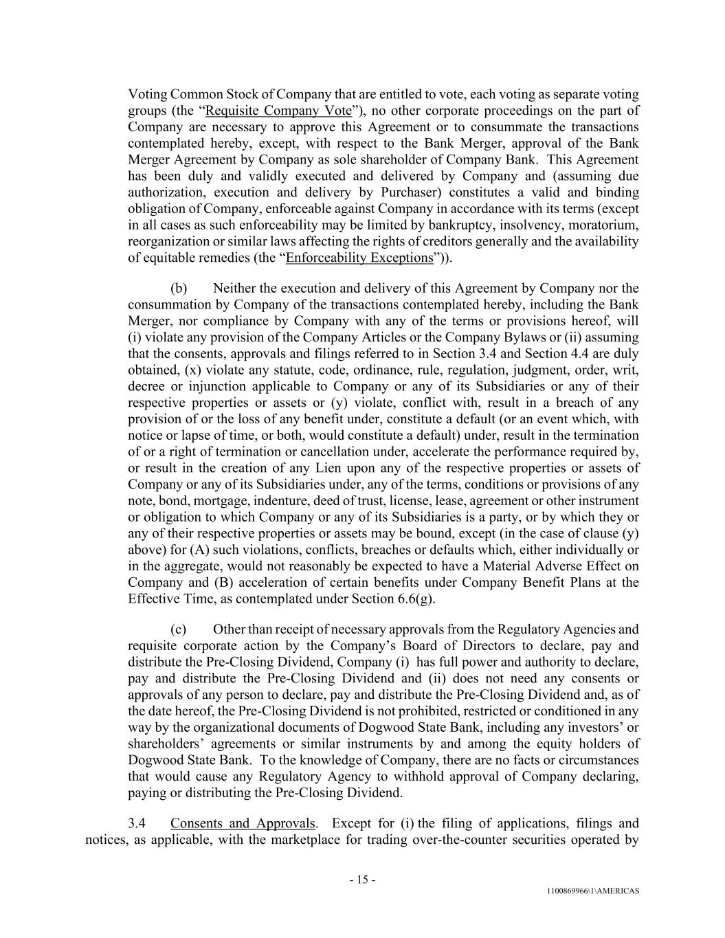 - 15 - 1100869966\1\AMERICAS Voting Common Stock of Company that are entitled to vote, each voting as separate voting groups (the “Requisite Company Vote”), no other corporate proceedings on the part of Company are necessary to approve this Agreement or to consummate the transactions contemplated hereby, except, with respect to the Bank Merger, approval of the Bank Merger Agreement by Company as sole shareholder of Company Bank. This Agreement has been duly and validly executed and delivered by Company and (assuming due authorization, execution and delivery by Purchaser) constitutes a valid and binding obligation of Company, enforceable against Company in accordance with its terms (except in all cases as such enforceability may be limited by bankruptcy, insolvency, moratorium, reorganization or similar laws affecting the rights of creditors generally and the availability of equitable remedies (the “Enforceability Exceptions”)). (b) Neither the execution and delivery of this Agreement by Company nor the consummation by Company of the transactions contemplated hereby, including the Bank Merger, nor compliance by Company with any of the terms or provisions hereof, will (i) violate any provision of the Company Articles or the Company Bylaws or (ii) assuming that the consents, approvals and filings referred to in Section 3.4 and Section 4.4 are duly obtained, (x) violate any statute, code, ordinance, rule, regulation, judgment, order, writ, decree or injunction applicable to Company or any of its Subsidiaries or any of their respective properties or assets or (y) violate, conflict with, result in a breach of any provision of or the loss of any benefit under, constitute a default (or an event which, with notice or lapse of time, or both, would constitute a default) under, result in the termination of or a right of termination or cancellation under, accelerate the performance required by, or result in the creation of any Lien upon any of the respective properties or assets of Company or any of its Subsidiaries under, any of the terms, conditions or provisions of any note, bond, mortgage, indenture, deed of trust, license, lease, agreement or other instrument or obligation to which Company or any of its Subsidiaries is a party, or by which they or any of their respective properties or assets may be bound, except (in the case of clause (y) above) for (A) such violations, conflicts, breaches or defaults which, either individually or in the aggregate, would not reasonably be expected to have a Material Adverse Effect on Company and (B) acceleration of certain benefits under Company Benefit Plans at the Effective Time, as contemplated under Section 6.6(g). (c) Other than receipt of necessary approvals from the Regulatory Agencies and requisite corporate action by the Company’s Board of Directors to declare, pay and distribute the Pre-Closing Dividend, Company (i) has full power and authority to declare, pay and distribute the Pre-Closing Dividend and (ii) does not need any consents or approvals of any person to declare, pay and distribute the Pre-Closing Dividend and, as of the date hereof, the Pre-Closing Dividend is not prohibited, restricted or conditioned in any way by the organizational documents of Dogwood State Bank, including any investors’ or shareholders’ agreements or similar instruments by and among the equity holders of Dogwood State Bank. To the knowledge of Company, there are no facts or circumstances that would cause any Regulatory Agency to withhold approval of Company declaring, paying or distributing the Pre-Closing Dividend. 3.4 Consents and Approvals. Except for (i) the filing of applications, filings and notices, as applicable, with the marketplace for trading over-the-counter securities operated by