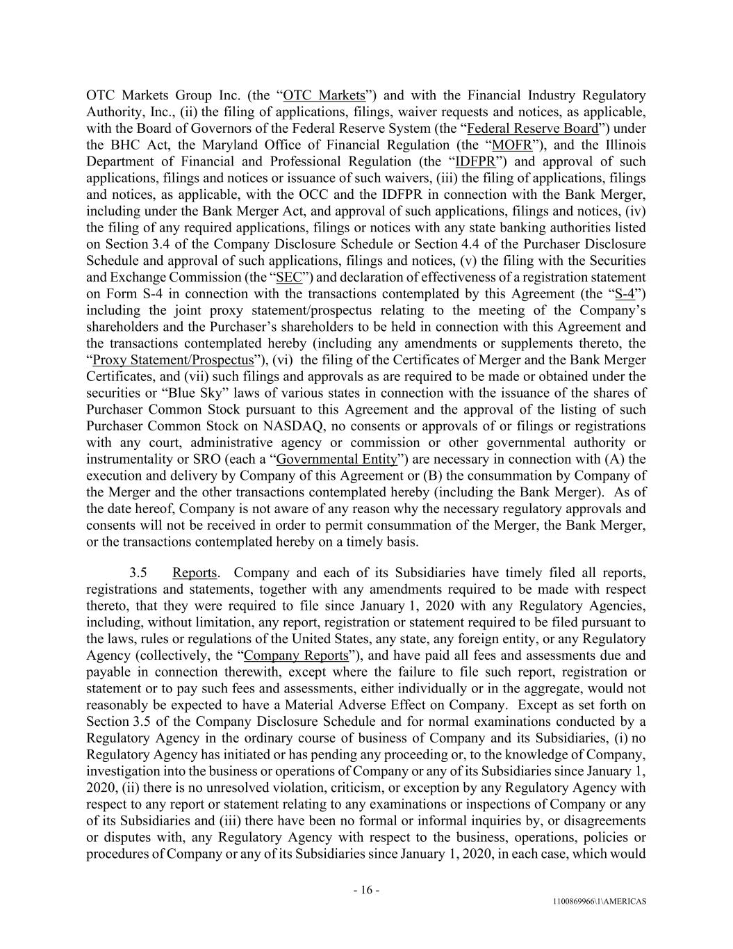 - 16 - 1100869966\1\AMERICAS OTC Markets Group Inc. (the “OTC Markets”) and with the Financial Industry Regulatory Authority, Inc., (ii) the filing of applications, filings, waiver requests and notices, as applicable, with the Board of Governors of the Federal Reserve System (the “Federal Reserve Board”) under the BHC Act, the Maryland Office of Financial Regulation (the “MOFR”), and the Illinois Department of Financial and Professional Regulation (the “IDFPR”) and approval of such applications, filings and notices or issuance of such waivers, (iii) the filing of applications, filings and notices, as applicable, with the OCC and the IDFPR in connection with the Bank Merger, including under the Bank Merger Act, and approval of such applications, filings and notices, (iv) the filing of any required applications, filings or notices with any state banking authorities listed on Section 3.4 of the Company Disclosure Schedule or Section 4.4 of the Purchaser Disclosure Schedule and approval of such applications, filings and notices, (v) the filing with the Securities and Exchange Commission (the “SEC”) and declaration of effectiveness of a registration statement on Form S-4 in connection with the transactions contemplated by this Agreement (the “S-4”) including the joint proxy statement/prospectus relating to the meeting of the Company’s shareholders and the Purchaser’s shareholders to be held in connection with this Agreement and the transactions contemplated hereby (including any amendments or supplements thereto, the “Proxy Statement/Prospectus”), (vi) the filing of the Certificates of Merger and the Bank Merger Certificates, and (vii) such filings and approvals as are required to be made or obtained under the securities or “Blue Sky” laws of various states in connection with the issuance of the shares of Purchaser Common Stock pursuant to this Agreement and the approval of the listing of such Purchaser Common Stock on NASDAQ, no consents or approvals of or filings or registrations with any court, administrative agency or commission or other governmental authority or instrumentality or SRO (each a “Governmental Entity”) are necessary in connection with (A) the execution and delivery by Company of this Agreement or (B) the consummation by Company of the Merger and the other transactions contemplated hereby (including the Bank Merger). As of the date hereof, Company is not aware of any reason why the necessary regulatory approvals and consents will not be received in order to permit consummation of the Merger, the Bank Merger, or the transactions contemplated hereby on a timely basis. 3.5 Reports. Company and each of its Subsidiaries have timely filed all reports, registrations and statements, together with any amendments required to be made with respect thereto, that they were required to file since January 1, 2020 with any Regulatory Agencies, including, without limitation, any report, registration or statement required to be filed pursuant to the laws, rules or regulations of the United States, any state, any foreign entity, or any Regulatory Agency (collectively, the “Company Reports”), and have paid all fees and assessments due and payable in connection therewith, except where the failure to file such report, registration or statement or to pay such fees and assessments, either individually or in the aggregate, would not reasonably be expected to have a Material Adverse Effect on Company. Except as set forth on Section 3.5 of the Company Disclosure Schedule and for normal examinations conducted by a Regulatory Agency in the ordinary course of business of Company and its Subsidiaries, (i) no Regulatory Agency has initiated or has pending any proceeding or, to the knowledge of Company, investigation into the business or operations of Company or any of its Subsidiaries since January 1, 2020, (ii) there is no unresolved violation, criticism, or exception by any Regulatory Agency with respect to any report or statement relating to any examinations or inspections of Company or any of its Subsidiaries and (iii) there have been no formal or informal inquiries by, or disagreements or disputes with, any Regulatory Agency with respect to the business, operations, policies or procedures of Company or any of its Subsidiaries since January 1, 2020, in each case, which would