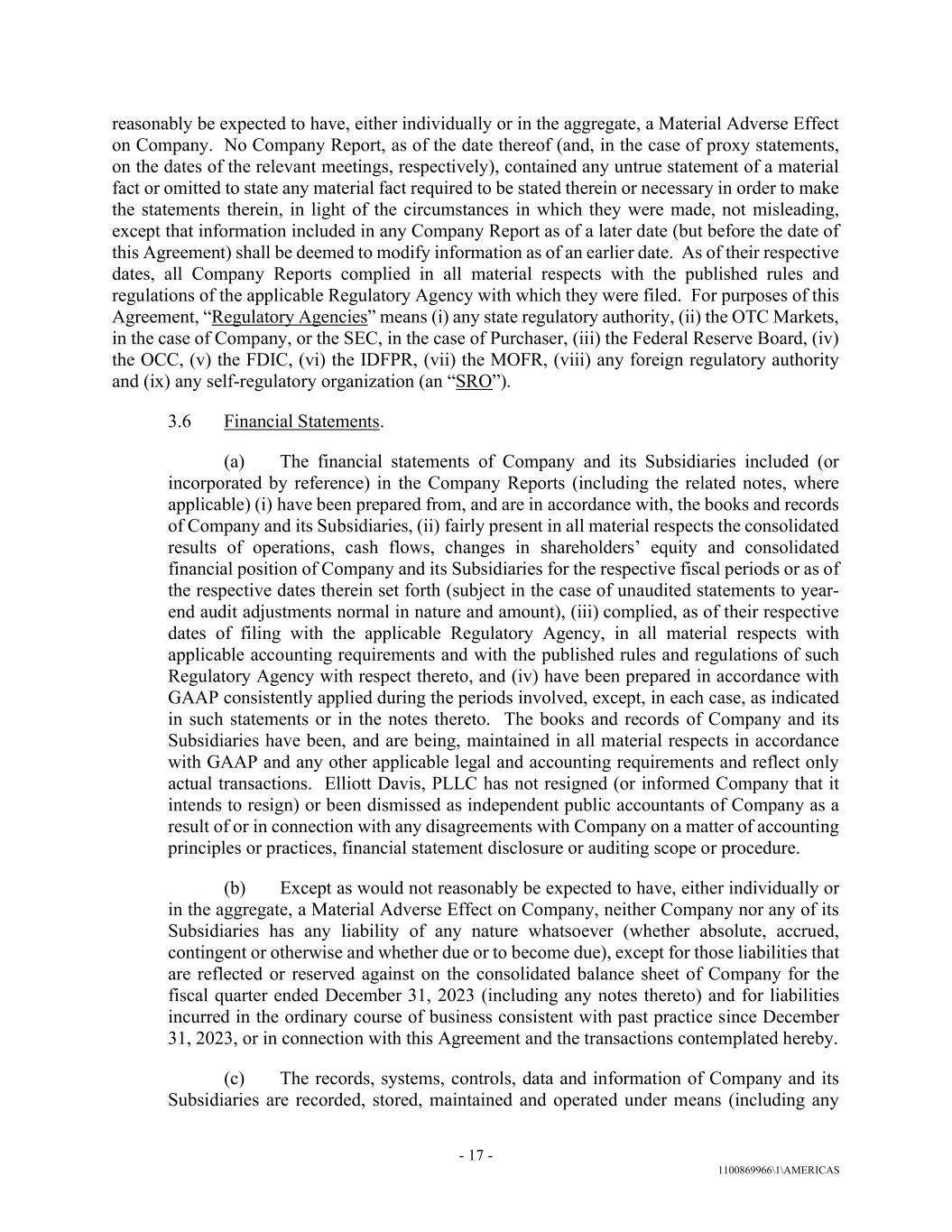 - 17 - 1100869966\1\AMERICAS reasonably be expected to have, either individually or in the aggregate, a Material Adverse Effect on Company. No Company Report, as of the date thereof (and, in the case of proxy statements, on the dates of the relevant meetings, respectively), contained any untrue statement of a material fact or omitted to state any material fact required to be stated therein or necessary in order to make the statements therein, in light of the circumstances in which they were made, not misleading, except that information included in any Company Report as of a later date (but before the date of this Agreement) shall be deemed to modify information as of an earlier date. As of their respective dates, all Company Reports complied in all material respects with the published rules and regulations of the applicable Regulatory Agency with which they were filed. For purposes of this Agreement, “Regulatory Agencies” means (i) any state regulatory authority, (ii) the OTC Markets, in the case of Company, or the SEC, in the case of Purchaser, (iii) the Federal Reserve Board, (iv) the OCC, (v) the FDIC, (vi) the IDFPR, (vii) the MOFR, (viii) any foreign regulatory authority and (ix) any self-regulatory organization (an “SRO”). 3.6 Financial Statements. (a) The financial statements of Company and its Subsidiaries included (or incorporated by reference) in the Company Reports (including the related notes, where applicable) (i) have been prepared from, and are in accordance with, the books and records of Company and its Subsidiaries, (ii) fairly present in all material respects the consolidated results of operations, cash flows, changes in shareholders’ equity and consolidated financial position of Company and its Subsidiaries for the respective fiscal periods or as of the respective dates therein set forth (subject in the case of unaudited statements to year- end audit adjustments normal in nature and amount), (iii) complied, as of their respective dates of filing with the applicable Regulatory Agency, in all material respects with applicable accounting requirements and with the published rules and regulations of such Regulatory Agency with respect thereto, and (iv) have been prepared in accordance with GAAP consistently applied during the periods involved, except, in each case, as indicated in such statements or in the notes thereto. The books and records of Company and its Subsidiaries have been, and are being, maintained in all material respects in accordance with GAAP and any other applicable legal and accounting requirements and reflect only actual transactions. Elliott Davis, PLLC has not resigned (or informed Company that it intends to resign) or been dismissed as independent public accountants of Company as a result of or in connection with any disagreements with Company on a matter of accounting principles or practices, financial statement disclosure or auditing scope or procedure. (b) Except as would not reasonably be expected to have, either individually or in the aggregate, a Material Adverse Effect on Company, neither Company nor any of its Subsidiaries has any liability of any nature whatsoever (whether absolute, accrued, contingent or otherwise and whether due or to become due), except for those liabilities that are reflected or reserved against on the consolidated balance sheet of Company for the fiscal quarter ended December 31, 2023 (including any notes thereto) and for liabilities incurred in the ordinary course of business consistent with past practice since December 31, 2023, or in connection with this Agreement and the transactions contemplated hereby. (c) The records, systems, controls, data and information of Company and its Subsidiaries are recorded, stored, maintained and operated under means (including any