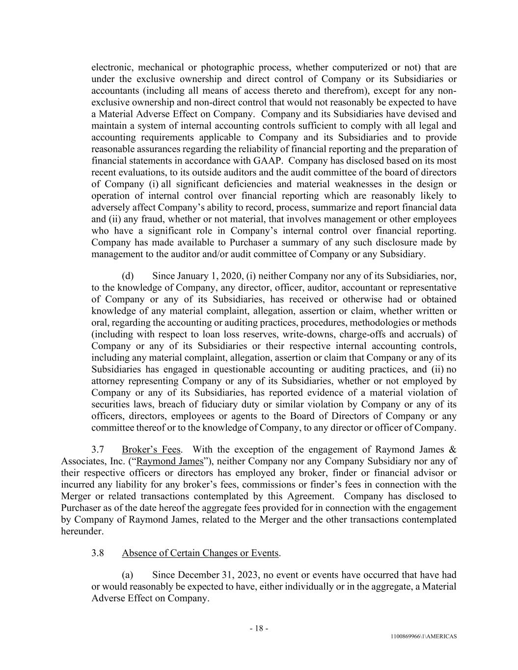 - 18 - 1100869966\1\AMERICAS electronic, mechanical or photographic process, whether computerized or not) that are under the exclusive ownership and direct control of Company or its Subsidiaries or accountants (including all means of access thereto and therefrom), except for any non- exclusive ownership and non-direct control that would not reasonably be expected to have a Material Adverse Effect on Company. Company and its Subsidiaries have devised and maintain a system of internal accounting controls sufficient to comply with all legal and accounting requirements applicable to Company and its Subsidiaries and to provide reasonable assurances regarding the reliability of financial reporting and the preparation of financial statements in accordance with GAAP. Company has disclosed based on its most recent evaluations, to its outside auditors and the audit committee of the board of directors of Company (i) all significant deficiencies and material weaknesses in the design or operation of internal control over financial reporting which are reasonably likely to adversely affect Company’s ability to record, process, summarize and report financial data and (ii) any fraud, whether or not material, that involves management or other employees who have a significant role in Company’s internal control over financial reporting. Company has made available to Purchaser a summary of any such disclosure made by management to the auditor and/or audit committee of Company or any Subsidiary. (d) Since January 1, 2020, (i) neither Company nor any of its Subsidiaries, nor, to the knowledge of Company, any director, officer, auditor, accountant or representative of Company or any of its Subsidiaries, has received or otherwise had or obtained knowledge of any material complaint, allegation, assertion or claim, whether written or oral, regarding the accounting or auditing practices, procedures, methodologies or methods (including with respect to loan loss reserves, write-downs, charge-offs and accruals) of Company or any of its Subsidiaries or their respective internal accounting controls, including any material complaint, allegation, assertion or claim that Company or any of its Subsidiaries has engaged in questionable accounting or auditing practices, and (ii) no attorney representing Company or any of its Subsidiaries, whether or not employed by Company or any of its Subsidiaries, has reported evidence of a material violation of securities laws, breach of fiduciary duty or similar violation by Company or any of its officers, directors, employees or agents to the Board of Directors of Company or any committee thereof or to the knowledge of Company, to any director or officer of Company. 3.7 Broker’s Fees. With the exception of the engagement of Raymond James & Associates, Inc. (“Raymond James”), neither Company nor any Company Subsidiary nor any of their respective officers or directors has employed any broker, finder or financial advisor or incurred any liability for any broker’s fees, commissions or finder’s fees in connection with the Merger or related transactions contemplated by this Agreement. Company has disclosed to Purchaser as of the date hereof the aggregate fees provided for in connection with the engagement by Company of Raymond James, related to the Merger and the other transactions contemplated hereunder. 3.8 Absence of Certain Changes or Events. (a) Since December 31, 2023, no event or events have occurred that have had or would reasonably be expected to have, either individually or in the aggregate, a Material Adverse Effect on Company.