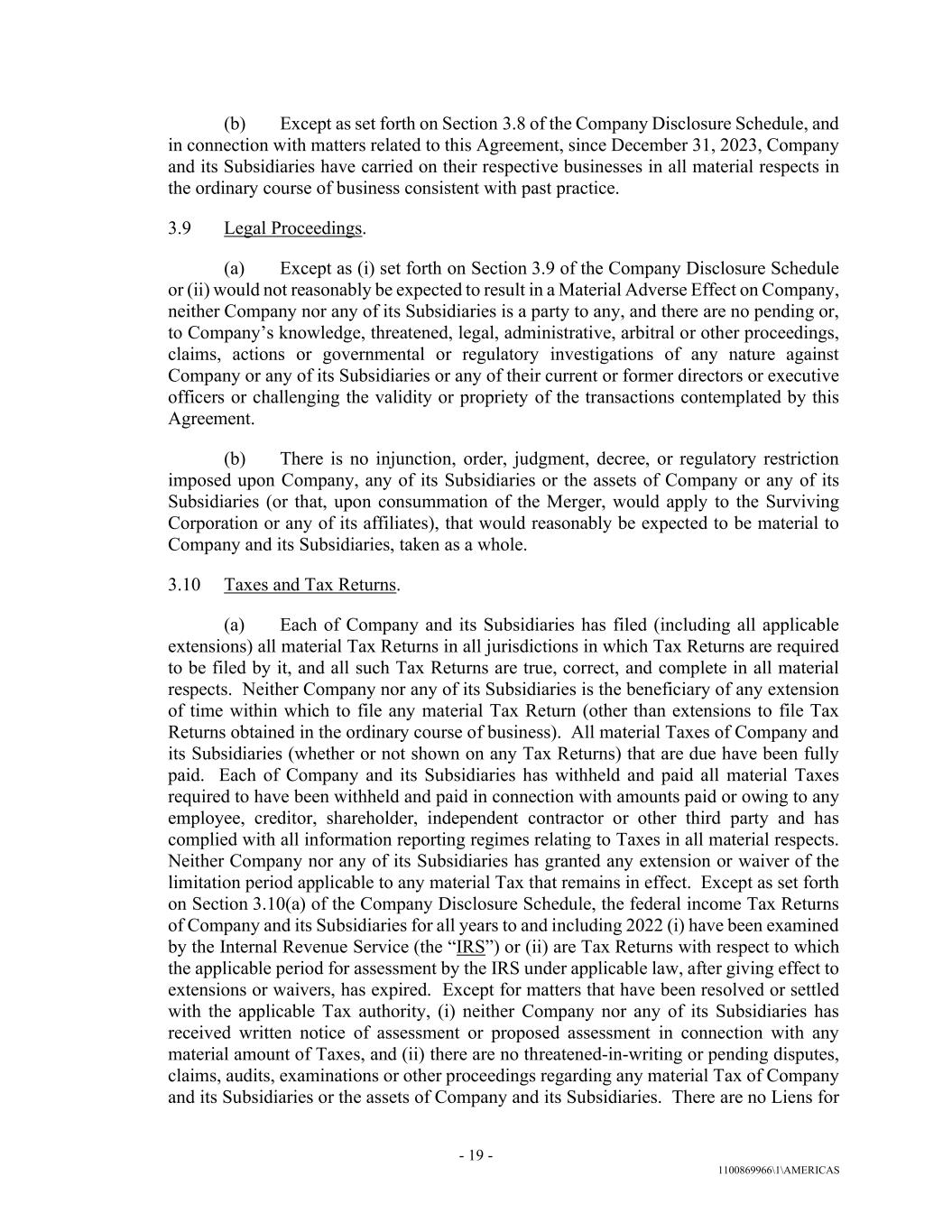 - 19 - 1100869966\1\AMERICAS (b) Except as set forth on Section 3.8 of the Company Disclosure Schedule, and in connection with matters related to this Agreement, since December 31, 2023, Company and its Subsidiaries have carried on their respective businesses in all material respects in the ordinary course of business consistent with past practice. 3.9 Legal Proceedings. (a) Except as (i) set forth on Section 3.9 of the Company Disclosure Schedule or (ii) would not reasonably be expected to result in a Material Adverse Effect on Company, neither Company nor any of its Subsidiaries is a party to any, and there are no pending or, to Company’s knowledge, threatened, legal, administrative, arbitral or other proceedings, claims, actions or governmental or regulatory investigations of any nature against Company or any of its Subsidiaries or any of their current or former directors or executive officers or challenging the validity or propriety of the transactions contemplated by this Agreement. (b) There is no injunction, order, judgment, decree, or regulatory restriction imposed upon Company, any of its Subsidiaries or the assets of Company or any of its Subsidiaries (or that, upon consummation of the Merger, would apply to the Surviving Corporation or any of its affiliates), that would reasonably be expected to be material to Company and its Subsidiaries, taken as a whole. 3.10 Taxes and Tax Returns. (a) Each of Company and its Subsidiaries has filed (including all applicable extensions) all material Tax Returns in all jurisdictions in which Tax Returns are required to be filed by it, and all such Tax Returns are true, correct, and complete in all material respects. Neither Company nor any of its Subsidiaries is the beneficiary of any extension of time within which to file any material Tax Return (other than extensions to file Tax Returns obtained in the ordinary course of business). All material Taxes of Company and its Subsidiaries (whether or not shown on any Tax Returns) that are due have been fully paid. Each of Company and its Subsidiaries has withheld and paid all material Taxes required to have been withheld and paid in connection with amounts paid or owing to any employee, creditor, shareholder, independent contractor or other third party and has complied with all information reporting regimes relating to Taxes in all material respects. Neither Company nor any of its Subsidiaries has granted any extension or waiver of the limitation period applicable to any material Tax that remains in effect. Except as set forth on Section 3.10(a) of the Company Disclosure Schedule, the federal income Tax Returns of Company and its Subsidiaries for all years to and including 2022 (i) have been examined by the Internal Revenue Service (the “IRS”) or (ii) are Tax Returns with respect to which the applicable period for assessment by the IRS under applicable law, after giving effect to extensions or waivers, has expired. Except for matters that have been resolved or settled with the applicable Tax authority, (i) neither Company nor any of its Subsidiaries has received written notice of assessment or proposed assessment in connection with any material amount of Taxes, and (ii) there are no threatened-in-writing or pending disputes, claims, audits, examinations or other proceedings regarding any material Tax of Company and its Subsidiaries or the assets of Company and its Subsidiaries. There are no Liens for
