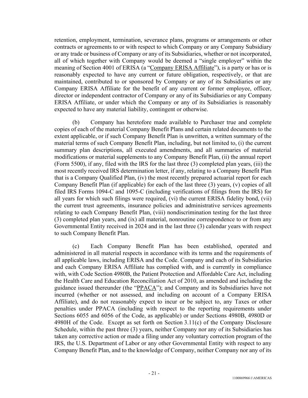 - 21 - 1100869966\1\AMERICAS retention, employment, termination, severance plans, programs or arrangements or other contracts or agreements to or with respect to which Company or any Company Subsidiary or any trade or business of Company or any of its Subsidiaries, whether or not incorporated, all of which together with Company would be deemed a “single employer” within the meaning of Section 4001 of ERISA (a “Company ERISA Affiliate”), is a party or has or is reasonably expected to have any current or future obligation, respectively, or that are maintained, contributed to or sponsored by Company or any of its Subsidiaries or any Company ERISA Affiliate for the benefit of any current or former employee, officer, director or independent contractor of Company or any of its Subsidiaries or any Company ERISA Affiliate, or under which the Company or any of its Subsidiaries is reasonably expected to have any material liability, contingent or otherwise. (b) Company has heretofore made available to Purchaser true and complete copies of each of the material Company Benefit Plans and certain related documents to the extent applicable, or if such Company Benefit Plan is unwritten, a written summary of the material terms of such Company Benefit Plan, including, but not limited to, (i) the current summary plan descriptions, all executed amendments, and all summaries of material modifications or material supplements to any Company Benefit Plan, (ii) the annual report (Form 5500), if any, filed with the IRS for the last three (3) completed plan years, (iii) the most recently received IRS determination letter, if any, relating to a Company Benefit Plan that is a Company Qualified Plan, (iv) the most recently prepared actuarial report for each Company Benefit Plan (if applicable) for each of the last three (3) years, (v) copies of all filed IRS Forms 1094-C and 1095-C (including verifications of filings from the IRS) for all years for which such filings were required, (vi) the current ERISA fidelity bond, (vii) the current trust agreements, insurance policies and administrative services agreements relating to each Company Benefit Plan, (viii) nondiscrimination testing for the last three (3) completed plan years, and (ix) all material, nonroutine correspondence to or from any Governmental Entity received in 2024 and in the last three (3) calendar years with respect to such Company Benefit Plan. (c) Each Company Benefit Plan has been established, operated and administered in all material respects in accordance with its terms and the requirements of all applicable laws, including ERISA and the Code. Company and each of its Subsidiaries and each Company ERISA Affiliate has complied with, and is currently in compliance with, with Code Section 4980B, the Patient Protection and Affordable Care Act, including the Health Care and Education Reconciliation Act of 2010, as amended and including the guidance issued thereunder (the “PPACA”); and Company and its Subsidiaries have not incurred (whether or not assessed, and including on account of a Company ERISA Affiliate), and do not reasonably expect to incur or be subject to, any Taxes or other penalties under PPACA (including with respect to the reporting requirements under Sections 6055 and 6056 of the Code, as applicable) or under Sections 4980B, 4980D or 4980H of the Code. Except as set forth on Section 3.11(c) of the Company Disclosure Schedule, within the past three (3) years, neither Company nor any of its Subsidiaries has taken any corrective action or made a filing under any voluntary correction program of the IRS, the U.S. Department of Labor or any other Governmental Entity with respect to any Company Benefit Plan, and to the knowledge of Company, neither Company nor any of its