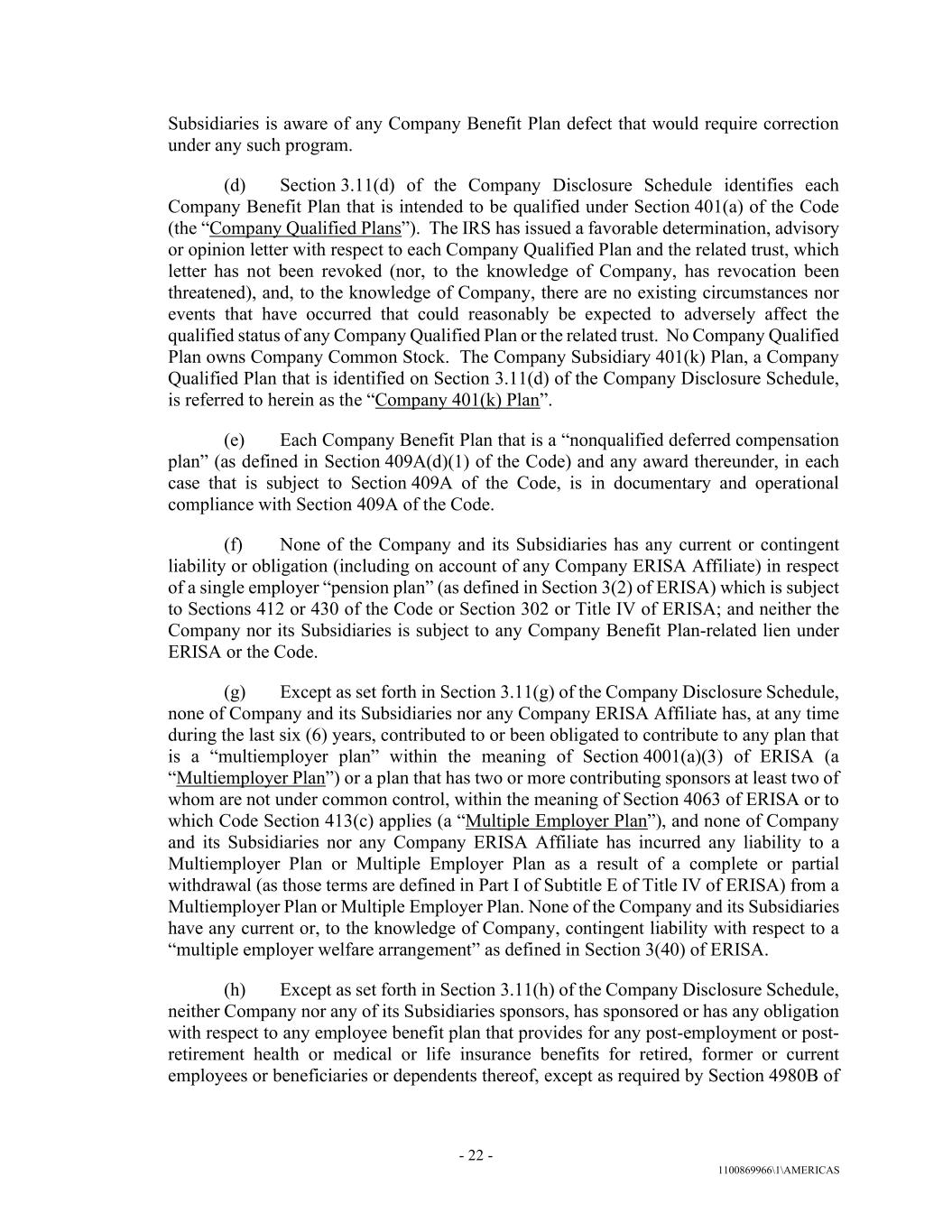 - 22 - 1100869966\1\AMERICAS Subsidiaries is aware of any Company Benefit Plan defect that would require correction under any such program. (d) Section 3.11(d) of the Company Disclosure Schedule identifies each Company Benefit Plan that is intended to be qualified under Section 401(a) of the Code (the “Company Qualified Plans”). The IRS has issued a favorable determination, advisory or opinion letter with respect to each Company Qualified Plan and the related trust, which letter has not been revoked (nor, to the knowledge of Company, has revocation been threatened), and, to the knowledge of Company, there are no existing circumstances nor events that have occurred that could reasonably be expected to adversely affect the qualified status of any Company Qualified Plan or the related trust. No Company Qualified Plan owns Company Common Stock. The Company Subsidiary 401(k) Plan, a Company Qualified Plan that is identified on Section 3.11(d) of the Company Disclosure Schedule, is referred to herein as the “Company 401(k) Plan”. (e) Each Company Benefit Plan that is a “nonqualified deferred compensation plan” (as defined in Section 409A(d)(1) of the Code) and any award thereunder, in each case that is subject to Section 409A of the Code, is in documentary and operational compliance with Section 409A of the Code. (f) None of the Company and its Subsidiaries has any current or contingent liability or obligation (including on account of any Company ERISA Affiliate) in respect of a single employer “pension plan” (as defined in Section 3(2) of ERISA) which is subject to Sections 412 or 430 of the Code or Section 302 or Title IV of ERISA; and neither the Company nor its Subsidiaries is subject to any Company Benefit Plan-related lien under ERISA or the Code. (g) Except as set forth in Section 3.11(g) of the Company Disclosure Schedule, none of Company and its Subsidiaries nor any Company ERISA Affiliate has, at any time during the last six (6) years, contributed to or been obligated to contribute to any plan that is a “multiemployer plan” within the meaning of Section 4001(a)(3) of ERISA (a “Multiemployer Plan”) or a plan that has two or more contributing sponsors at least two of whom are not under common control, within the meaning of Section 4063 of ERISA or to which Code Section 413(c) applies (a “Multiple Employer Plan”), and none of Company and its Subsidiaries nor any Company ERISA Affiliate has incurred any liability to a Multiemployer Plan or Multiple Employer Plan as a result of a complete or partial withdrawal (as those terms are defined in Part I of Subtitle E of Title IV of ERISA) from a Multiemployer Plan or Multiple Employer Plan. None of the Company and its Subsidiaries have any current or, to the knowledge of Company, contingent liability with respect to a “multiple employer welfare arrangement” as defined in Section 3(40) of ERISA. (h) Except as set forth in Section 3.11(h) of the Company Disclosure Schedule, neither Company nor any of its Subsidiaries sponsors, has sponsored or has any obligation with respect to any employee benefit plan that provides for any post-employment or post- retirement health or medical or life insurance benefits for retired, former or current employees or beneficiaries or dependents thereof, except as required by Section 4980B of