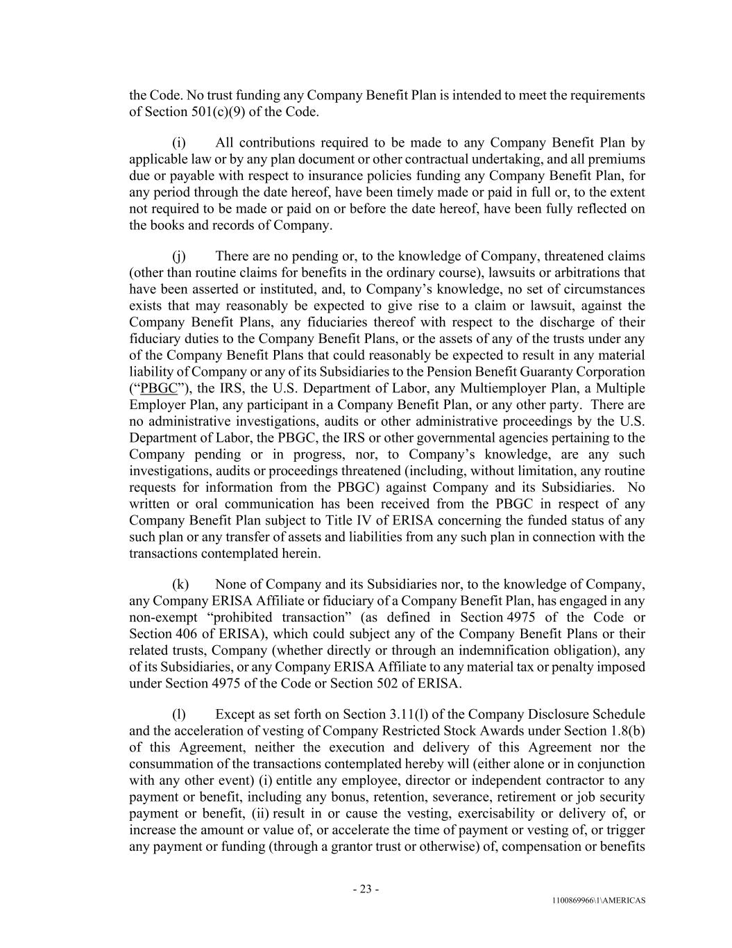 - 23 - 1100869966\1\AMERICAS the Code. No trust funding any Company Benefit Plan is intended to meet the requirements of Section 501(c)(9) of the Code. (i) All contributions required to be made to any Company Benefit Plan by applicable law or by any plan document or other contractual undertaking, and all premiums due or payable with respect to insurance policies funding any Company Benefit Plan, for any period through the date hereof, have been timely made or paid in full or, to the extent not required to be made or paid on or before the date hereof, have been fully reflected on the books and records of Company. (j) There are no pending or, to the knowledge of Company, threatened claims (other than routine claims for benefits in the ordinary course), lawsuits or arbitrations that have been asserted or instituted, and, to Company’s knowledge, no set of circumstances exists that may reasonably be expected to give rise to a claim or lawsuit, against the Company Benefit Plans, any fiduciaries thereof with respect to the discharge of their fiduciary duties to the Company Benefit Plans, or the assets of any of the trusts under any of the Company Benefit Plans that could reasonably be expected to result in any material liability of Company or any of its Subsidiaries to the Pension Benefit Guaranty Corporation (“PBGC”), the IRS, the U.S. Department of Labor, any Multiemployer Plan, a Multiple Employer Plan, any participant in a Company Benefit Plan, or any other party. There are no administrative investigations, audits or other administrative proceedings by the U.S. Department of Labor, the PBGC, the IRS or other governmental agencies pertaining to the Company pending or in progress, nor, to Company’s knowledge, are any such investigations, audits or proceedings threatened (including, without limitation, any routine requests for information from the PBGC) against Company and its Subsidiaries. No written or oral communication has been received from the PBGC in respect of any Company Benefit Plan subject to Title IV of ERISA concerning the funded status of any such plan or any transfer of assets and liabilities from any such plan in connection with the transactions contemplated herein. (k) None of Company and its Subsidiaries nor, to the knowledge of Company, any Company ERISA Affiliate or fiduciary of a Company Benefit Plan, has engaged in any non-exempt “prohibited transaction” (as defined in Section 4975 of the Code or Section 406 of ERISA), which could subject any of the Company Benefit Plans or their related trusts, Company (whether directly or through an indemnification obligation), any of its Subsidiaries, or any Company ERISA Affiliate to any material tax or penalty imposed under Section 4975 of the Code or Section 502 of ERISA. (l) Except as set forth on Section 3.11(l) of the Company Disclosure Schedule and the acceleration of vesting of Company Restricted Stock Awards under Section 1.8(b) of this Agreement, neither the execution and delivery of this Agreement nor the consummation of the transactions contemplated hereby will (either alone or in conjunction with any other event) (i) entitle any employee, director or independent contractor to any payment or benefit, including any bonus, retention, severance, retirement or job security payment or benefit, (ii) result in or cause the vesting, exercisability or delivery of, or increase the amount or value of, or accelerate the time of payment or vesting of, or trigger any payment or funding (through a grantor trust or otherwise) of, compensation or benefits