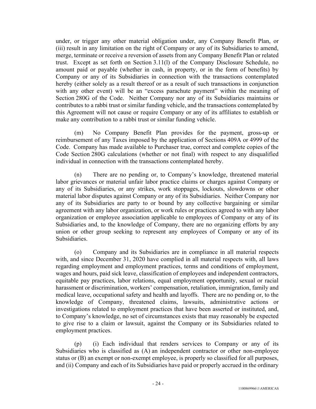 - 24 - 1100869966\1\AMERICAS under, or trigger any other material obligation under, any Company Benefit Plan, or (iii) result in any limitation on the right of Company or any of its Subsidiaries to amend, merge, terminate or receive a reversion of assets from any Company Benefit Plan or related trust. Except as set forth on Section 3.11(l) of the Company Disclosure Schedule, no amount paid or payable (whether in cash, in property, or in the form of benefits) by Company or any of its Subsidiaries in connection with the transactions contemplated hereby (either solely as a result thereof or as a result of such transactions in conjunction with any other event) will be an “excess parachute payment” within the meaning of Section 280G of the Code. Neither Company nor any of its Subsidiaries maintains or contributes to a rabbi trust or similar funding vehicle, and the transactions contemplated by this Agreement will not cause or require Company or any of its affiliates to establish or make any contribution to a rabbi trust or similar funding vehicle. (m) No Company Benefit Plan provides for the payment, gross-up or reimbursement of any Taxes imposed by the application of Sections 409A or 4999 of the Code. Company has made available to Purchaser true, correct and complete copies of the Code Section 280G calculations (whether or not final) with respect to any disqualified individual in connection with the transactions contemplated hereby. (n) There are no pending or, to Company’s knowledge, threatened material labor grievances or material unfair labor practice claims or charges against Company or any of its Subsidiaries, or any strikes, work stoppages, lockouts, slowdowns or other material labor disputes against Company or any of its Subsidiaries. Neither Company nor any of its Subsidiaries are party to or bound by any collective bargaining or similar agreement with any labor organization, or work rules or practices agreed to with any labor organization or employee association applicable to employees of Company or any of its Subsidiaries and, to the knowledge of Company, there are no organizing efforts by any union or other group seeking to represent any employees of Company or any of its Subsidiaries. (o) Company and its Subsidiaries are in compliance in all material respects with, and since December 31, 2020 have complied in all material respects with, all laws regarding employment and employment practices, terms and conditions of employment, wages and hours, paid sick leave, classification of employees and independent contractors, equitable pay practices, labor relations, equal employment opportunity, sexual or racial harassment or discrimination, workers’ compensation, retaliation, immigration, family and medical leave, occupational safety and health and layoffs. There are no pending or, to the knowledge of Company, threatened claims, lawsuits, administrative actions or investigations related to employment practices that have been asserted or instituted, and, to Company’s knowledge, no set of circumstances exists that may reasonably be expected to give rise to a claim or lawsuit, against the Company or its Subsidiaries related to employment practices. (p) (i) Each individual that renders services to Company or any of its Subsidiaries who is classified as (A) an independent contractor or other non-employee status or (B) an exempt or non-exempt employee, is properly so classified for all purposes, and (ii) Company and each of its Subsidiaries have paid or properly accrued in the ordinary