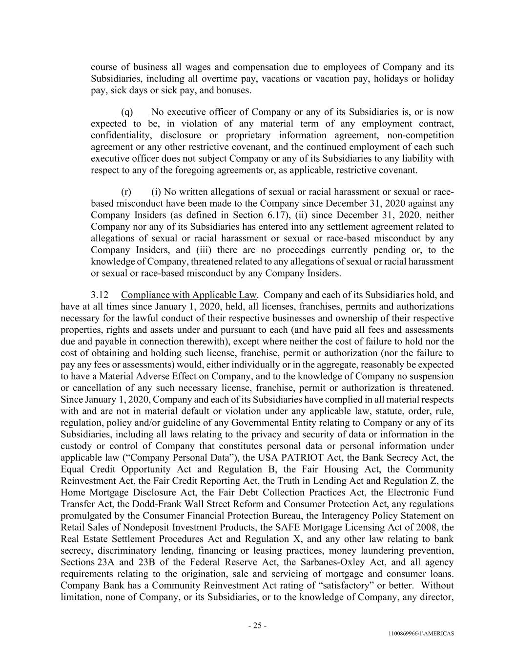 - 25 - 1100869966\1\AMERICAS course of business all wages and compensation due to employees of Company and its Subsidiaries, including all overtime pay, vacations or vacation pay, holidays or holiday pay, sick days or sick pay, and bonuses. (q) No executive officer of Company or any of its Subsidiaries is, or is now expected to be, in violation of any material term of any employment contract, confidentiality, disclosure or proprietary information agreement, non-competition agreement or any other restrictive covenant, and the continued employment of each such executive officer does not subject Company or any of its Subsidiaries to any liability with respect to any of the foregoing agreements or, as applicable, restrictive covenant. (r) (i) No written allegations of sexual or racial harassment or sexual or race- based misconduct have been made to the Company since December 31, 2020 against any Company Insiders (as defined in Section 6.17), (ii) since December 31, 2020, neither Company nor any of its Subsidiaries has entered into any settlement agreement related to allegations of sexual or racial harassment or sexual or race-based misconduct by any Company Insiders, and (iii) there are no proceedings currently pending or, to the knowledge of Company, threatened related to any allegations of sexual or racial harassment or sexual or race-based misconduct by any Company Insiders. 3.12 Compliance with Applicable Law. Company and each of its Subsidiaries hold, and have at all times since January 1, 2020, held, all licenses, franchises, permits and authorizations necessary for the lawful conduct of their respective businesses and ownership of their respective properties, rights and assets under and pursuant to each (and have paid all fees and assessments due and payable in connection therewith), except where neither the cost of failure to hold nor the cost of obtaining and holding such license, franchise, permit or authorization (nor the failure to pay any fees or assessments) would, either individually or in the aggregate, reasonably be expected to have a Material Adverse Effect on Company, and to the knowledge of Company no suspension or cancellation of any such necessary license, franchise, permit or authorization is threatened. Since January 1, 2020, Company and each of its Subsidiaries have complied in all material respects with and are not in material default or violation under any applicable law, statute, order, rule, regulation, policy and/or guideline of any Governmental Entity relating to Company or any of its Subsidiaries, including all laws relating to the privacy and security of data or information in the custody or control of Company that constitutes personal data or personal information under applicable law (“Company Personal Data”), the USA PATRIOT Act, the Bank Secrecy Act, the Equal Credit Opportunity Act and Regulation B, the Fair Housing Act, the Community Reinvestment Act, the Fair Credit Reporting Act, the Truth in Lending Act and Regulation Z, the Home Mortgage Disclosure Act, the Fair Debt Collection Practices Act, the Electronic Fund Transfer Act, the Dodd-Frank Wall Street Reform and Consumer Protection Act, any regulations promulgated by the Consumer Financial Protection Bureau, the Interagency Policy Statement on Retail Sales of Nondeposit Investment Products, the SAFE Mortgage Licensing Act of 2008, the Real Estate Settlement Procedures Act and Regulation X, and any other law relating to bank secrecy, discriminatory lending, financing or leasing practices, money laundering prevention, Sections 23A and 23B of the Federal Reserve Act, the Sarbanes-Oxley Act, and all agency requirements relating to the origination, sale and servicing of mortgage and consumer loans. Company Bank has a Community Reinvestment Act rating of “satisfactory” or better. Without limitation, none of Company, or its Subsidiaries, or to the knowledge of Company, any director,