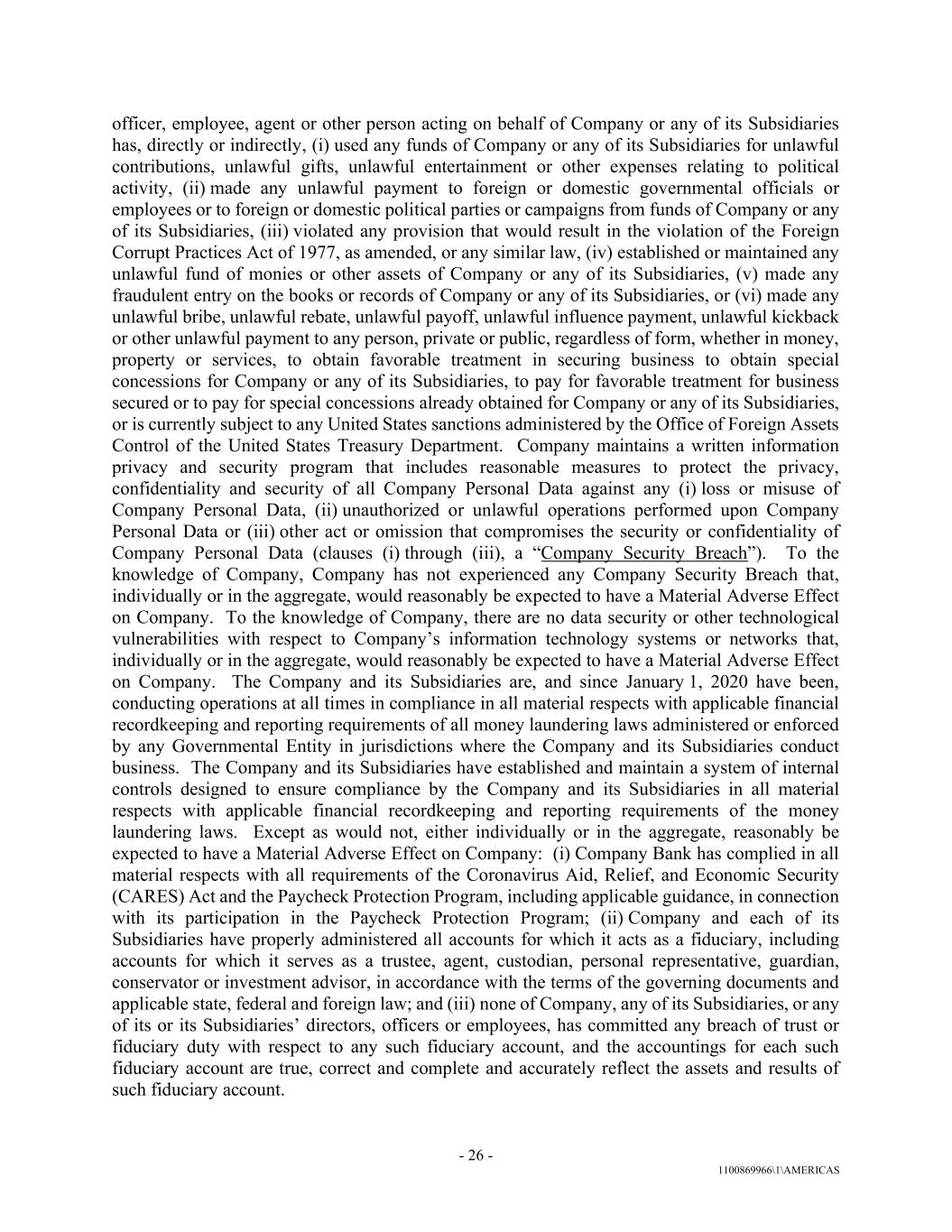 - 26 - 1100869966\1\AMERICAS officer, employee, agent or other person acting on behalf of Company or any of its Subsidiaries has, directly or indirectly, (i) used any funds of Company or any of its Subsidiaries for unlawful contributions, unlawful gifts, unlawful entertainment or other expenses relating to political activity, (ii) made any unlawful payment to foreign or domestic governmental officials or employees or to foreign or domestic political parties or campaigns from funds of Company or any of its Subsidiaries, (iii) violated any provision that would result in the violation of the Foreign Corrupt Practices Act of 1977, as amended, or any similar law, (iv) established or maintained any unlawful fund of monies or other assets of Company or any of its Subsidiaries, (v) made any fraudulent entry on the books or records of Company or any of its Subsidiaries, or (vi) made any unlawful bribe, unlawful rebate, unlawful payoff, unlawful influence payment, unlawful kickback or other unlawful payment to any person, private or public, regardless of form, whether in money, property or services, to obtain favorable treatment in securing business to obtain special concessions for Company or any of its Subsidiaries, to pay for favorable treatment for business secured or to pay for special concessions already obtained for Company or any of its Subsidiaries, or is currently subject to any United States sanctions administered by the Office of Foreign Assets Control of the United States Treasury Department. Company maintains a written information privacy and security program that includes reasonable measures to protect the privacy, confidentiality and security of all Company Personal Data against any (i) loss or misuse of Company Personal Data, (ii) unauthorized or unlawful operations performed upon Company Personal Data or (iii) other act or omission that compromises the security or confidentiality of Company Personal Data (clauses (i) through (iii), a “Company Security Breach”). To the knowledge of Company, Company has not experienced any Company Security Breach that, individually or in the aggregate, would reasonably be expected to have a Material Adverse Effect on Company. To the knowledge of Company, there are no data security or other technological vulnerabilities with respect to Company’s information technology systems or networks that, individually or in the aggregate, would reasonably be expected to have a Material Adverse Effect on Company. The Company and its Subsidiaries are, and since January 1, 2020 have been, conducting operations at all times in compliance in all material respects with applicable financial recordkeeping and reporting requirements of all money laundering laws administered or enforced by any Governmental Entity in jurisdictions where the Company and its Subsidiaries conduct business. The Company and its Subsidiaries have established and maintain a system of internal controls designed to ensure compliance by the Company and its Subsidiaries in all material respects with applicable financial recordkeeping and reporting requirements of the money laundering laws. Except as would not, either individually or in the aggregate, reasonably be expected to have a Material Adverse Effect on Company: (i) Company Bank has complied in all material respects with all requirements of the Coronavirus Aid, Relief, and Economic Security (CARES) Act and the Paycheck Protection Program, including applicable guidance, in connection with its participation in the Paycheck Protection Program; (ii) Company and each of its Subsidiaries have properly administered all accounts for which it acts as a fiduciary, including accounts for which it serves as a trustee, agent, custodian, personal representative, guardian, conservator or investment advisor, in accordance with the terms of the governing documents and applicable state, federal and foreign law; and (iii) none of Company, any of its Subsidiaries, or any of its or its Subsidiaries’ directors, officers or employees, has committed any breach of trust or fiduciary duty with respect to any such fiduciary account, and the accountings for each such fiduciary account are true, correct and complete and accurately reflect the assets and results of such fiduciary account.