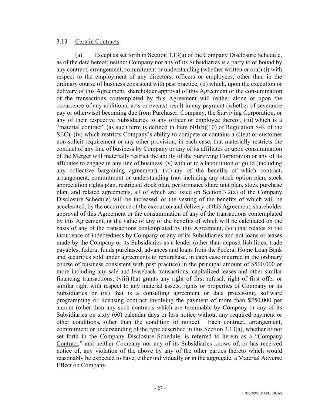 - 27 - 1100869966\1\AMERICAS 3.13 Certain Contracts. (a) Except as set forth in Section 3.13(a) of the Company Disclosure Schedule, as of the date hereof, neither Company nor any of its Subsidiaries is a party to or bound by any contract, arrangement, commitment or understanding (whether written or oral) (i) with respect to the employment of any directors, officers or employees, other than in the ordinary course of business consistent with past practice, (ii) which, upon the execution or delivery of this Agreement, shareholder approval of this Agreement or the consummation of the transactions contemplated by this Agreement will (either alone or upon the occurrence of any additional acts or events) result in any payment (whether of severance pay or otherwise) becoming due from Purchaser, Company, the Surviving Corporation, or any of their respective Subsidiaries to any officer or employee thereof, (iii) which is a “material contract” (as such term is defined in Item 601(b)(10) of Regulation S-K of the SEC), (iv) which restricts Company’s ability to compete or contains a client or customer non-solicit requirement or any other provision, in each case, that materially restricts the conduct of any line of business by Company or any of its affiliates or upon consummation of the Merger will materially restrict the ability of the Surviving Corporation or any of its affiliates to engage in any line of business, (v) with or to a labor union or guild (including any collective bargaining agreement), (vi) any of the benefits of which contract, arrangement, commitment or understanding (not including any stock option plan, stock appreciation rights plan, restricted stock plan, performance share unit plan, stock purchase plan, and related agreements, all of which are listed on Section 3.2(a) of the Company Disclosure Schedule) will be increased, or the vesting of the benefits of which will be accelerated, by the occurrence of the execution and delivery of this Agreement, shareholder approval of this Agreement or the consummation of any of the transactions contemplated by this Agreement, or the value of any of the benefits of which will be calculated on the basis of any of the transactions contemplated by this Agreement, (vii) that relates to the incurrence of indebtedness by Company or any of its Subsidiaries and not loans or leases made by the Company or its Subsidiaries as a lender (other than deposit liabilities, trade payables, federal funds purchased, advances and loans from the Federal Home Loan Bank and securities sold under agreements to repurchase, in each case incurred in the ordinary course of business consistent with past practice) in the principal amount of $500,000 or more including any sale and leaseback transactions, capitalized leases and other similar financing transactions, (viii) that grants any right of first refusal, right of first offer or similar right with respect to any material assets, rights or properties of Company or its Subsidiaries or (ix) that is a consulting agreement or data processing, software programming or licensing contract involving the payment of more than $250,000 per annum (other than any such contracts which are terminable by Company or any of its Subsidiaries on sixty (60) calendar days or less notice without any required payment or other conditions, other than the condition of notice). Each contract, arrangement, commitment or understanding of the type described in this Section 3.13(a), whether or not set forth in the Company Disclosure Schedule, is referred to herein as a “Company Contract,” and neither Company nor any of its Subsidiaries knows of, or has received notice of, any violation of the above by any of the other parties thereto which would reasonably be expected to have, either individually or in the aggregate, a Material Adverse Effect on Company.