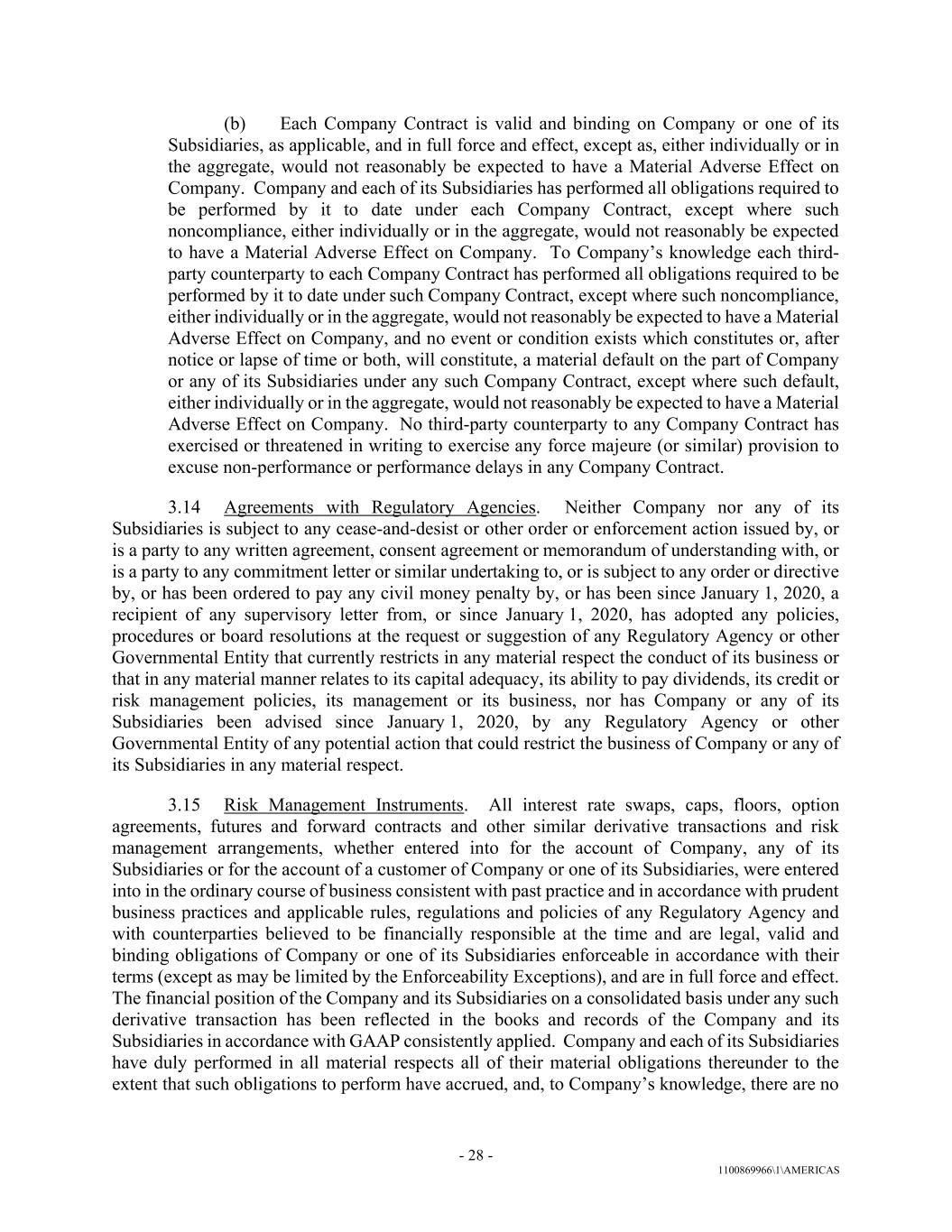- 28 - 1100869966\1\AMERICAS (b) Each Company Contract is valid and binding on Company or one of its Subsidiaries, as applicable, and in full force and effect, except as, either individually or in the aggregate, would not reasonably be expected to have a Material Adverse Effect on Company. Company and each of its Subsidiaries has performed all obligations required to be performed by it to date under each Company Contract, except where such noncompliance, either individually or in the aggregate, would not reasonably be expected to have a Material Adverse Effect on Company. To Company’s knowledge each third- party counterparty to each Company Contract has performed all obligations required to be performed by it to date under such Company Contract, except where such noncompliance, either individually or in the aggregate, would not reasonably be expected to have a Material Adverse Effect on Company, and no event or condition exists which constitutes or, after notice or lapse of time or both, will constitute, a material default on the part of Company or any of its Subsidiaries under any such Company Contract, except where such default, either individually or in the aggregate, would not reasonably be expected to have a Material Adverse Effect on Company. No third-party counterparty to any Company Contract has exercised or threatened in writing to exercise any force majeure (or similar) provision to excuse non-performance or performance delays in any Company Contract. 3.14 Agreements with Regulatory Agencies. Neither Company nor any of its Subsidiaries is subject to any cease-and-desist or other order or enforcement action issued by, or is a party to any written agreement, consent agreement or memorandum of understanding with, or is a party to any commitment letter or similar undertaking to, or is subject to any order or directive by, or has been ordered to pay any civil money penalty by, or has been since January 1, 2020, a recipient of any supervisory letter from, or since January 1, 2020, has adopted any policies, procedures or board resolutions at the request or suggestion of any Regulatory Agency or other Governmental Entity that currently restricts in any material respect the conduct of its business or that in any material manner relates to its capital adequacy, its ability to pay dividends, its credit or risk management policies, its management or its business, nor has Company or any of its Subsidiaries been advised since January 1, 2020, by any Regulatory Agency or other Governmental Entity of any potential action that could restrict the business of Company or any of its Subsidiaries in any material respect. 3.15 Risk Management Instruments. All interest rate swaps, caps, floors, option agreements, futures and forward contracts and other similar derivative transactions and risk management arrangements, whether entered into for the account of Company, any of its Subsidiaries or for the account of a customer of Company or one of its Subsidiaries, were entered into in the ordinary course of business consistent with past practice and in accordance with prudent business practices and applicable rules, regulations and policies of any Regulatory Agency and with counterparties believed to be financially responsible at the time and are legal, valid and binding obligations of Company or one of its Subsidiaries enforceable in accordance with their terms (except as may be limited by the Enforceability Exceptions), and are in full force and effect. The financial position of the Company and its Subsidiaries on a consolidated basis under any such derivative transaction has been reflected in the books and records of the Company and its Subsidiaries in accordance with GAAP consistently applied. Company and each of its Subsidiaries have duly performed in all material respects all of their material obligations thereunder to the extent that such obligations to perform have accrued, and, to Company’s knowledge, there are no