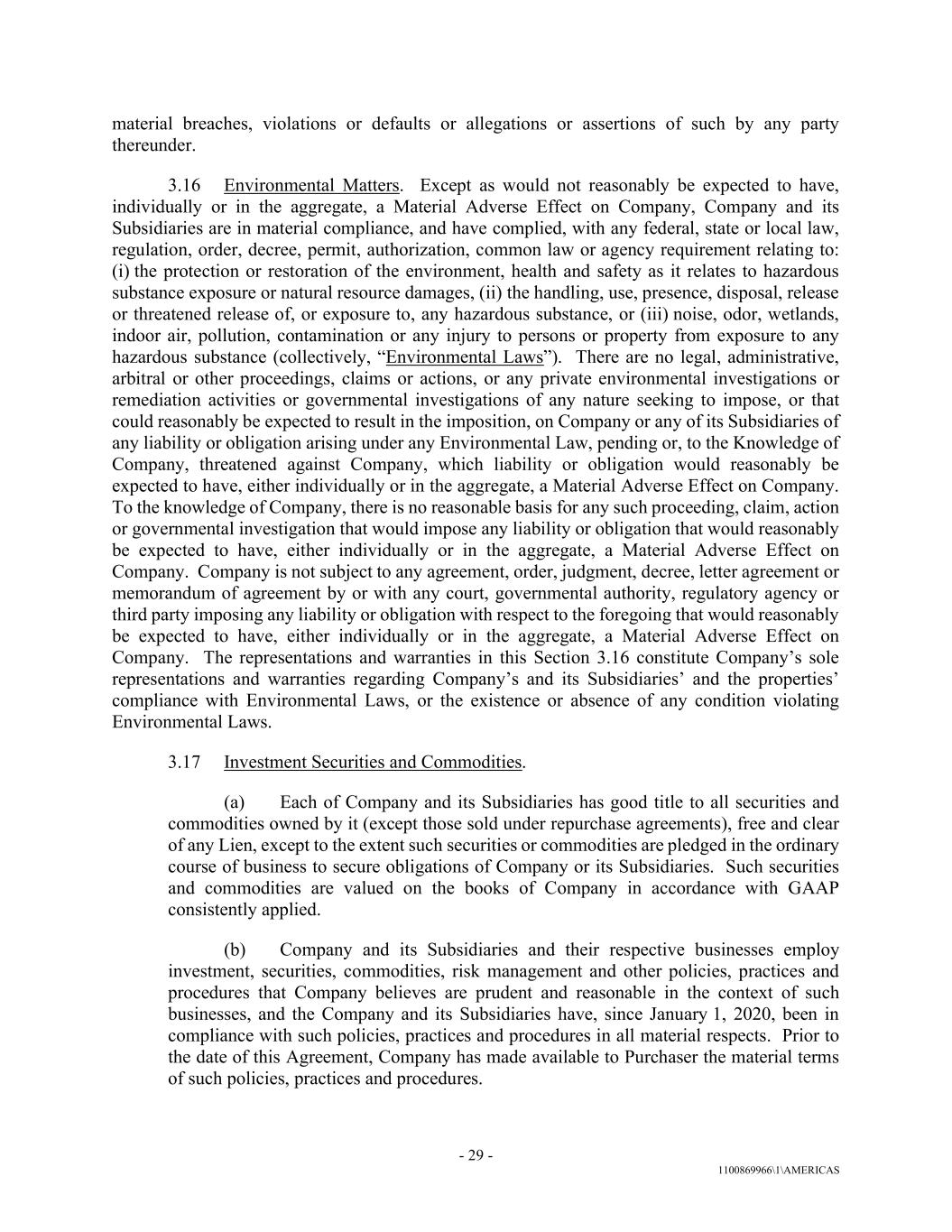 - 29 - 1100869966\1\AMERICAS material breaches, violations or defaults or allegations or assertions of such by any party thereunder. 3.16 Environmental Matters. Except as would not reasonably be expected to have, individually or in the aggregate, a Material Adverse Effect on Company, Company and its Subsidiaries are in material compliance, and have complied, with any federal, state or local law, regulation, order, decree, permit, authorization, common law or agency requirement relating to: (i) the protection or restoration of the environment, health and safety as it relates to hazardous substance exposure or natural resource damages, (ii) the handling, use, presence, disposal, release or threatened release of, or exposure to, any hazardous substance, or (iii) noise, odor, wetlands, indoor air, pollution, contamination or any injury to persons or property from exposure to any hazardous substance (collectively, “Environmental Laws”). There are no legal, administrative, arbitral or other proceedings, claims or actions, or any private environmental investigations or remediation activities or governmental investigations of any nature seeking to impose, or that could reasonably be expected to result in the imposition, on Company or any of its Subsidiaries of any liability or obligation arising under any Environmental Law, pending or, to the Knowledge of Company, threatened against Company, which liability or obligation would reasonably be expected to have, either individually or in the aggregate, a Material Adverse Effect on Company. To the knowledge of Company, there is no reasonable basis for any such proceeding, claim, action or governmental investigation that would impose any liability or obligation that would reasonably be expected to have, either individually or in the aggregate, a Material Adverse Effect on Company. Company is not subject to any agreement, order, judgment, decree, letter agreement or memorandum of agreement by or with any court, governmental authority, regulatory agency or third party imposing any liability or obligation with respect to the foregoing that would reasonably be expected to have, either individually or in the aggregate, a Material Adverse Effect on Company. The representations and warranties in this Section 3.16 constitute Company’s sole representations and warranties regarding Company’s and its Subsidiaries’ and the properties’ compliance with Environmental Laws, or the existence or absence of any condition violating Environmental Laws. 3.17 Investment Securities and Commodities. (a) Each of Company and its Subsidiaries has good title to all securities and commodities owned by it (except those sold under repurchase agreements), free and clear of any Lien, except to the extent such securities or commodities are pledged in the ordinary course of business to secure obligations of Company or its Subsidiaries. Such securities and commodities are valued on the books of Company in accordance with GAAP consistently applied. (b) Company and its Subsidiaries and their respective businesses employ investment, securities, commodities, risk management and other policies, practices and procedures that Company believes are prudent and reasonable in the context of such businesses, and the Company and its Subsidiaries have, since January 1, 2020, been in compliance with such policies, practices and procedures in all material respects. Prior to the date of this Agreement, Company has made available to Purchaser the material terms of such policies, practices and procedures.