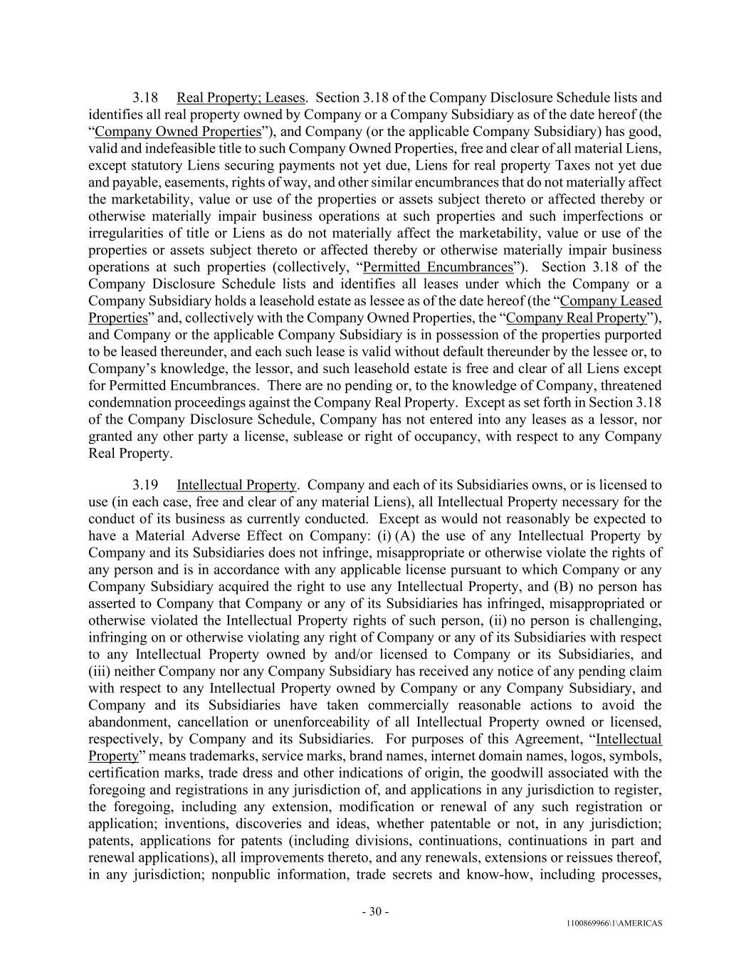 - 30 - 1100869966\1\AMERICAS 3.18 Real Property; Leases. Section 3.18 of the Company Disclosure Schedule lists and identifies all real property owned by Company or a Company Subsidiary as of the date hereof (the “Company Owned Properties”), and Company (or the applicable Company Subsidiary) has good, valid and indefeasible title to such Company Owned Properties, free and clear of all material Liens, except statutory Liens securing payments not yet due, Liens for real property Taxes not yet due and payable, easements, rights of way, and other similar encumbrances that do not materially affect the marketability, value or use of the properties or assets subject thereto or affected thereby or otherwise materially impair business operations at such properties and such imperfections or irregularities of title or Liens as do not materially affect the marketability, value or use of the properties or assets subject thereto or affected thereby or otherwise materially impair business operations at such properties (collectively, “Permitted Encumbrances”). Section 3.18 of the Company Disclosure Schedule lists and identifies all leases under which the Company or a Company Subsidiary holds a leasehold estate as lessee as of the date hereof (the “Company Leased Properties” and, collectively with the Company Owned Properties, the “Company Real Property”), and Company or the applicable Company Subsidiary is in possession of the properties purported to be leased thereunder, and each such lease is valid without default thereunder by the lessee or, to Company’s knowledge, the lessor, and such leasehold estate is free and clear of all Liens except for Permitted Encumbrances. There are no pending or, to the knowledge of Company, threatened condemnation proceedings against the Company Real Property. Except as set forth in Section 3.18 of the Company Disclosure Schedule, Company has not entered into any leases as a lessor, nor granted any other party a license, sublease or right of occupancy, with respect to any Company Real Property. 3.19 Intellectual Property. Company and each of its Subsidiaries owns, or is licensed to use (in each case, free and clear of any material Liens), all Intellectual Property necessary for the conduct of its business as currently conducted. Except as would not reasonably be expected to have a Material Adverse Effect on Company: (i) (A) the use of any Intellectual Property by Company and its Subsidiaries does not infringe, misappropriate or otherwise violate the rights of any person and is in accordance with any applicable license pursuant to which Company or any Company Subsidiary acquired the right to use any Intellectual Property, and (B) no person has asserted to Company that Company or any of its Subsidiaries has infringed, misappropriated or otherwise violated the Intellectual Property rights of such person, (ii) no person is challenging, infringing on or otherwise violating any right of Company or any of its Subsidiaries with respect to any Intellectual Property owned by and/or licensed to Company or its Subsidiaries, and (iii) neither Company nor any Company Subsidiary has received any notice of any pending claim with respect to any Intellectual Property owned by Company or any Company Subsidiary, and Company and its Subsidiaries have taken commercially reasonable actions to avoid the abandonment, cancellation or unenforceability of all Intellectual Property owned or licensed, respectively, by Company and its Subsidiaries. For purposes of this Agreement, “Intellectual Property” means trademarks, service marks, brand names, internet domain names, logos, symbols, certification marks, trade dress and other indications of origin, the goodwill associated with the foregoing and registrations in any jurisdiction of, and applications in any jurisdiction to register, the foregoing, including any extension, modification or renewal of any such registration or application; inventions, discoveries and ideas, whether patentable or not, in any jurisdiction; patents, applications for patents (including divisions, continuations, continuations in part and renewal applications), all improvements thereto, and any renewals, extensions or reissues thereof, in any jurisdiction; nonpublic information, trade secrets and know-how, including processes,
