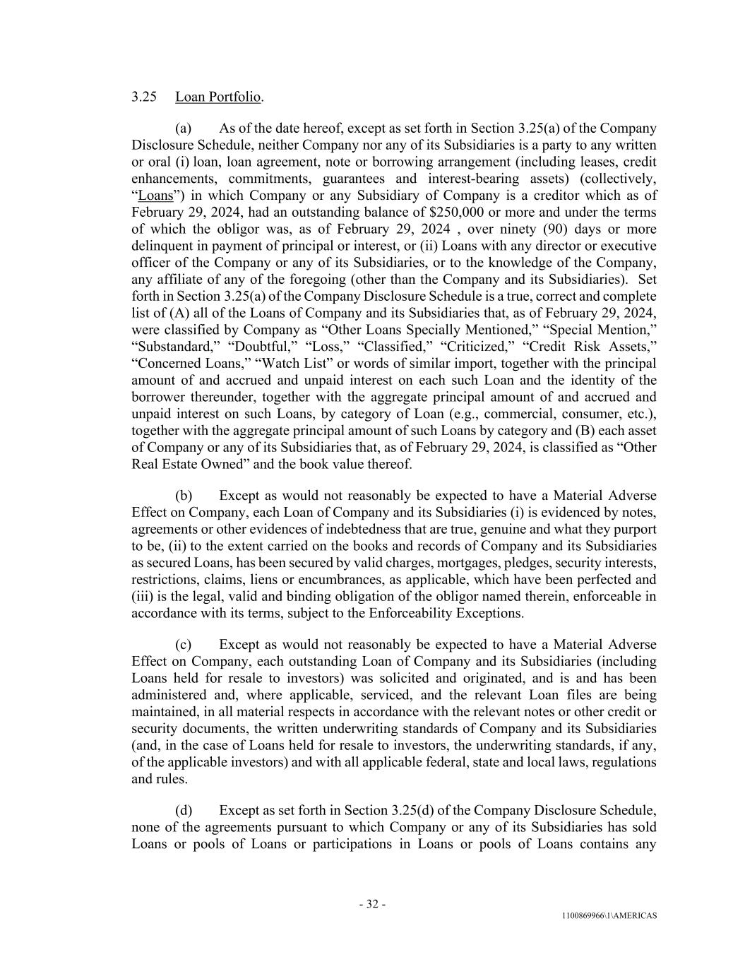 - 32 - 1100869966\1\AMERICAS 3.25 Loan Portfolio. (a) As of the date hereof, except as set forth in Section 3.25(a) of the Company Disclosure Schedule, neither Company nor any of its Subsidiaries is a party to any written or oral (i) loan, loan agreement, note or borrowing arrangement (including leases, credit enhancements, commitments, guarantees and interest-bearing assets) (collectively, “Loans”) in which Company or any Subsidiary of Company is a creditor which as of February 29, 2024, had an outstanding balance of $250,000 or more and under the terms of which the obligor was, as of February 29, 2024 , over ninety (90) days or more delinquent in payment of principal or interest, or (ii) Loans with any director or executive officer of the Company or any of its Subsidiaries, or to the knowledge of the Company, any affiliate of any of the foregoing (other than the Company and its Subsidiaries). Set forth in Section 3.25(a) of the Company Disclosure Schedule is a true, correct and complete list of (A) all of the Loans of Company and its Subsidiaries that, as of February 29, 2024, were classified by Company as “Other Loans Specially Mentioned,” “Special Mention,” “Substandard,” “Doubtful,” “Loss,” “Classified,” “Criticized,” “Credit Risk Assets,” “Concerned Loans,” “Watch List” or words of similar import, together with the principal amount of and accrued and unpaid interest on each such Loan and the identity of the borrower thereunder, together with the aggregate principal amount of and accrued and unpaid interest on such Loans, by category of Loan (e.g., commercial, consumer, etc.), together with the aggregate principal amount of such Loans by category and (B) each asset of Company or any of its Subsidiaries that, as of February 29, 2024, is classified as “Other Real Estate Owned” and the book value thereof. (b) Except as would not reasonably be expected to have a Material Adverse Effect on Company, each Loan of Company and its Subsidiaries (i) is evidenced by notes, agreements or other evidences of indebtedness that are true, genuine and what they purport to be, (ii) to the extent carried on the books and records of Company and its Subsidiaries as secured Loans, has been secured by valid charges, mortgages, pledges, security interests, restrictions, claims, liens or encumbrances, as applicable, which have been perfected and (iii) is the legal, valid and binding obligation of the obligor named therein, enforceable in accordance with its terms, subject to the Enforceability Exceptions. (c) Except as would not reasonably be expected to have a Material Adverse Effect on Company, each outstanding Loan of Company and its Subsidiaries (including Loans held for resale to investors) was solicited and originated, and is and has been administered and, where applicable, serviced, and the relevant Loan files are being maintained, in all material respects in accordance with the relevant notes or other credit or security documents, the written underwriting standards of Company and its Subsidiaries (and, in the case of Loans held for resale to investors, the underwriting standards, if any, of the applicable investors) and with all applicable federal, state and local laws, regulations and rules. (d) Except as set forth in Section 3.25(d) of the Company Disclosure Schedule, none of the agreements pursuant to which Company or any of its Subsidiaries has sold Loans or pools of Loans or participations in Loans or pools of Loans contains any