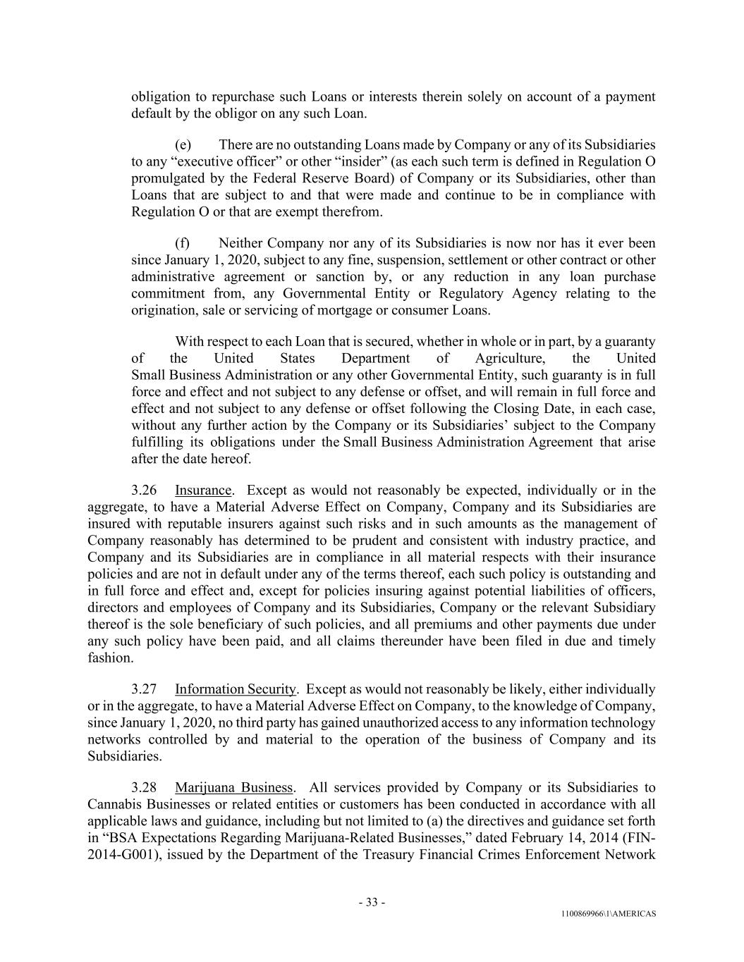 - 33 - 1100869966\1\AMERICAS obligation to repurchase such Loans or interests therein solely on account of a payment default by the obligor on any such Loan. (e) There are no outstanding Loans made by Company or any of its Subsidiaries to any “executive officer” or other “insider” (as each such term is defined in Regulation O promulgated by the Federal Reserve Board) of Company or its Subsidiaries, other than Loans that are subject to and that were made and continue to be in compliance with Regulation O or that are exempt therefrom. (f) Neither Company nor any of its Subsidiaries is now nor has it ever been since January 1, 2020, subject to any fine, suspension, settlement or other contract or other administrative agreement or sanction by, or any reduction in any loan purchase commitment from, any Governmental Entity or Regulatory Agency relating to the origination, sale or servicing of mortgage or consumer Loans. With respect to each Loan that is secured, whether in whole or in part, by a guaranty of the United States Department of Agriculture, the United Small Business Administration or any other Governmental Entity, such guaranty is in full force and effect and not subject to any defense or offset, and will remain in full force and effect and not subject to any defense or offset following the Closing Date, in each case, without any further action by the Company or its Subsidiaries’ subject to the Company fulfilling its obligations under the Small Business Administration Agreement that arise after the date hereof. 3.26 Insurance. Except as would not reasonably be expected, individually or in the aggregate, to have a Material Adverse Effect on Company, Company and its Subsidiaries are insured with reputable insurers against such risks and in such amounts as the management of Company reasonably has determined to be prudent and consistent with industry practice, and Company and its Subsidiaries are in compliance in all material respects with their insurance policies and are not in default under any of the terms thereof, each such policy is outstanding and in full force and effect and, except for policies insuring against potential liabilities of officers, directors and employees of Company and its Subsidiaries, Company or the relevant Subsidiary thereof is the sole beneficiary of such policies, and all premiums and other payments due under any such policy have been paid, and all claims thereunder have been filed in due and timely fashion. 3.27 Information Security. Except as would not reasonably be likely, either individually or in the aggregate, to have a Material Adverse Effect on Company, to the knowledge of Company, since January 1, 2020, no third party has gained unauthorized access to any information technology networks controlled by and material to the operation of the business of Company and its Subsidiaries. 3.28 Marijuana Business. All services provided by Company or its Subsidiaries to Cannabis Businesses or related entities or customers has been conducted in accordance with all applicable laws and guidance, including but not limited to (a) the directives and guidance set forth in “BSA Expectations Regarding Marijuana-Related Businesses,” dated February 14, 2014 (FIN- 2014-G001), issued by the Department of the Treasury Financial Crimes Enforcement Network