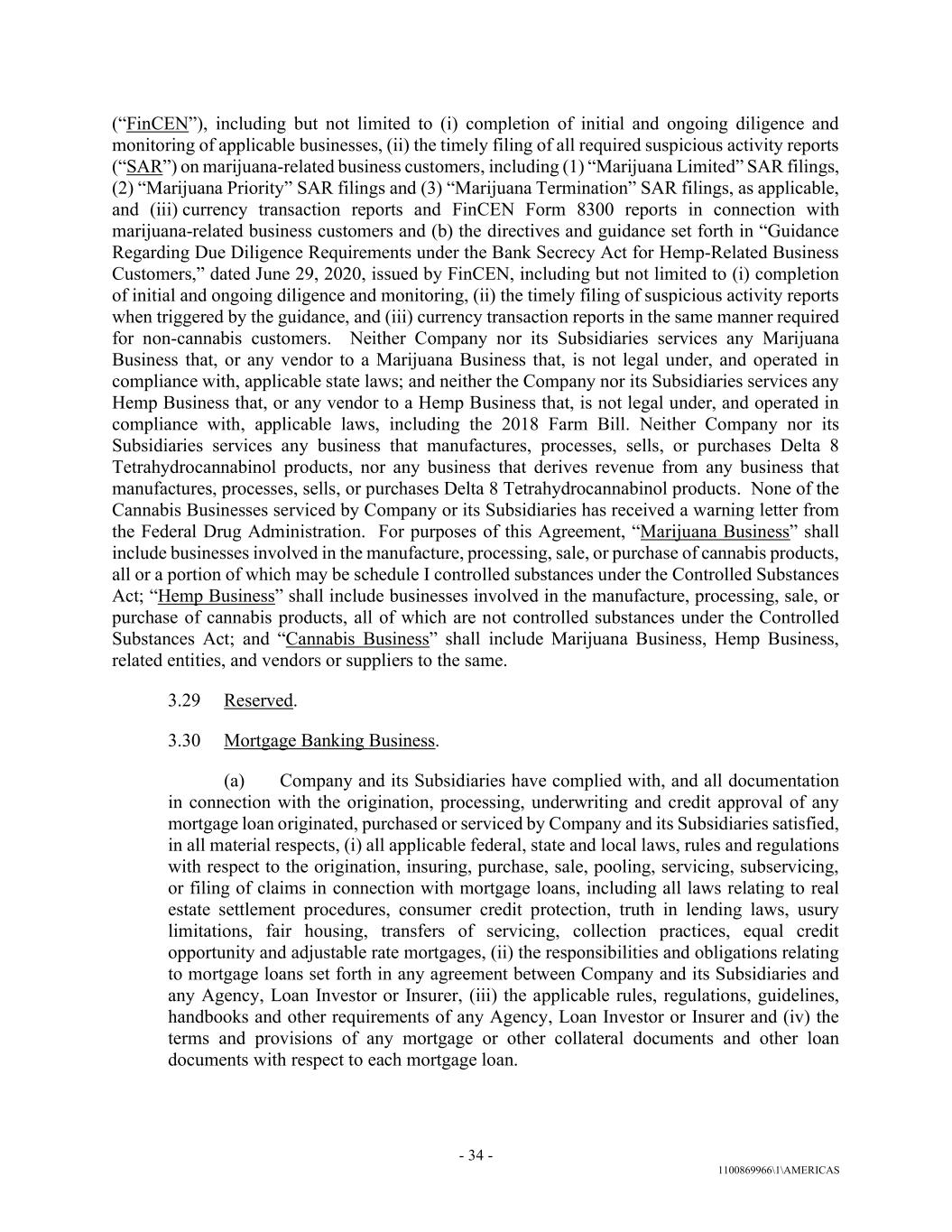 - 34 - 1100869966\1\AMERICAS (“FinCEN”), including but not limited to (i) completion of initial and ongoing diligence and monitoring of applicable businesses, (ii) the timely filing of all required suspicious activity reports (“SAR”) on marijuana-related business customers, including (1) “Marijuana Limited” SAR filings, (2) “Marijuana Priority” SAR filings and (3) “Marijuana Termination” SAR filings, as applicable, and (iii) currency transaction reports and FinCEN Form 8300 reports in connection with marijuana-related business customers and (b) the directives and guidance set forth in “Guidance Regarding Due Diligence Requirements under the Bank Secrecy Act for Hemp-Related Business Customers,” dated June 29, 2020, issued by FinCEN, including but not limited to (i) completion of initial and ongoing diligence and monitoring, (ii) the timely filing of suspicious activity reports when triggered by the guidance, and (iii) currency transaction reports in the same manner required for non-cannabis customers. Neither Company nor its Subsidiaries services any Marijuana Business that, or any vendor to a Marijuana Business that, is not legal under, and operated in compliance with, applicable state laws; and neither the Company nor its Subsidiaries services any Hemp Business that, or any vendor to a Hemp Business that, is not legal under, and operated in compliance with, applicable laws, including the 2018 Farm Bill. Neither Company nor its Subsidiaries services any business that manufactures, processes, sells, or purchases Delta 8 Tetrahydrocannabinol products, nor any business that derives revenue from any business that manufactures, processes, sells, or purchases Delta 8 Tetrahydrocannabinol products. None of the Cannabis Businesses serviced by Company or its Subsidiaries has received a warning letter from the Federal Drug Administration. For purposes of this Agreement, “Marijuana Business” shall include businesses involved in the manufacture, processing, sale, or purchase of cannabis products, all or a portion of which may be schedule I controlled substances under the Controlled Substances Act; “Hemp Business” shall include businesses involved in the manufacture, processing, sale, or purchase of cannabis products, all of which are not controlled substances under the Controlled Substances Act; and “Cannabis Business” shall include Marijuana Business, Hemp Business, related entities, and vendors or suppliers to the same. 3.29 Reserved. 3.30 Mortgage Banking Business. (a) Company and its Subsidiaries have complied with, and all documentation in connection with the origination, processing, underwriting and credit approval of any mortgage loan originated, purchased or serviced by Company and its Subsidiaries satisfied, in all material respects, (i) all applicable federal, state and local laws, rules and regulations with respect to the origination, insuring, purchase, sale, pooling, servicing, subservicing, or filing of claims in connection with mortgage loans, including all laws relating to real estate settlement procedures, consumer credit protection, truth in lending laws, usury limitations, fair housing, transfers of servicing, collection practices, equal credit opportunity and adjustable rate mortgages, (ii) the responsibilities and obligations relating to mortgage loans set forth in any agreement between Company and its Subsidiaries and any Agency, Loan Investor or Insurer, (iii) the applicable rules, regulations, guidelines, handbooks and other requirements of any Agency, Loan Investor or Insurer and (iv) the terms and provisions of any mortgage or other collateral documents and other loan documents with respect to each mortgage loan.