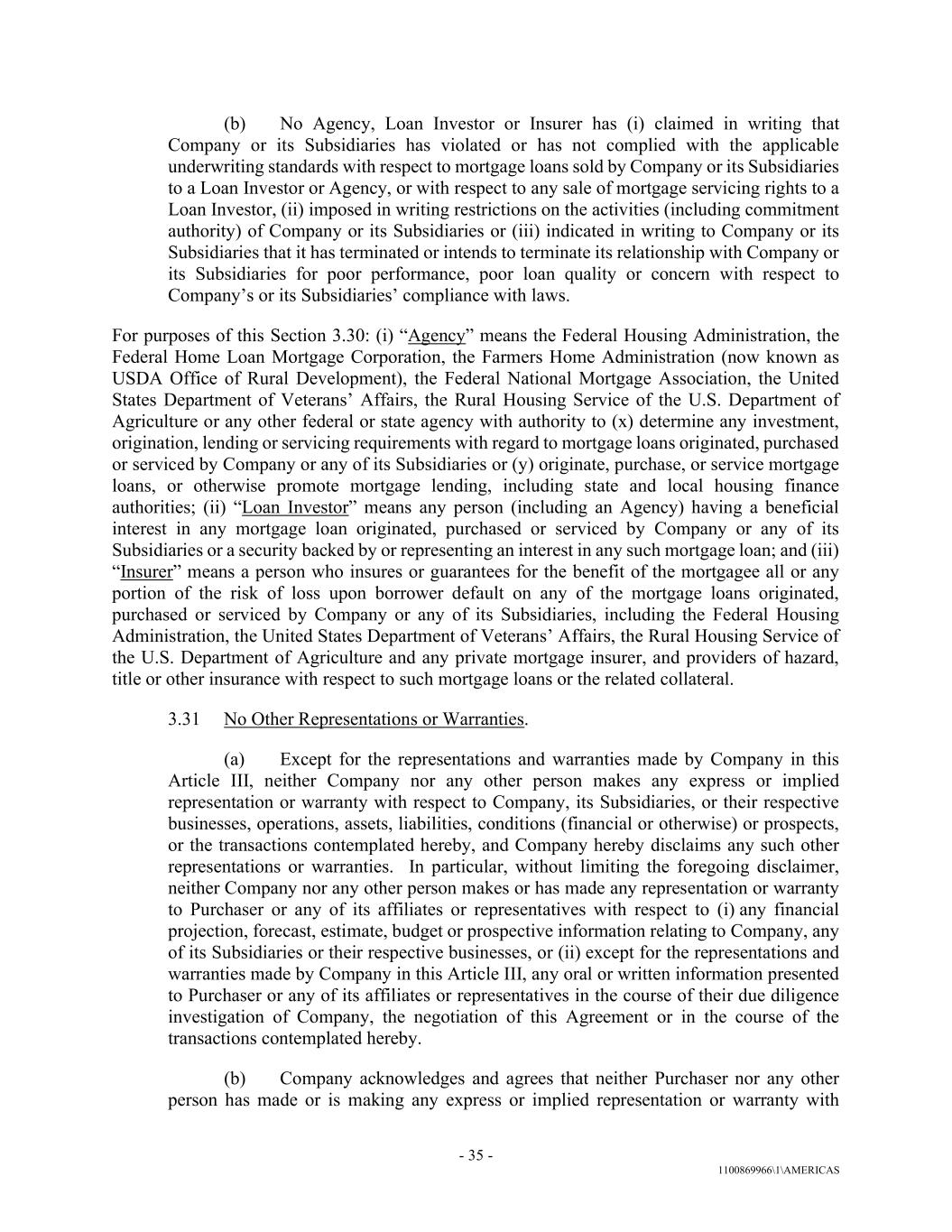 - 35 - 1100869966\1\AMERICAS (b) No Agency, Loan Investor or Insurer has (i) claimed in writing that Company or its Subsidiaries has violated or has not complied with the applicable underwriting standards with respect to mortgage loans sold by Company or its Subsidiaries to a Loan Investor or Agency, or with respect to any sale of mortgage servicing rights to a Loan Investor, (ii) imposed in writing restrictions on the activities (including commitment authority) of Company or its Subsidiaries or (iii) indicated in writing to Company or its Subsidiaries that it has terminated or intends to terminate its relationship with Company or its Subsidiaries for poor performance, poor loan quality or concern with respect to Company’s or its Subsidiaries’ compliance with laws. For purposes of this Section 3.30: (i) “Agency” means the Federal Housing Administration, the Federal Home Loan Mortgage Corporation, the Farmers Home Administration (now known as USDA Office of Rural Development), the Federal National Mortgage Association, the United States Department of Veterans’ Affairs, the Rural Housing Service of the U.S. Department of Agriculture or any other federal or state agency with authority to (x) determine any investment, origination, lending or servicing requirements with regard to mortgage loans originated, purchased or serviced by Company or any of its Subsidiaries or (y) originate, purchase, or service mortgage loans, or otherwise promote mortgage lending, including state and local housing finance authorities; (ii) “Loan Investor” means any person (including an Agency) having a beneficial interest in any mortgage loan originated, purchased or serviced by Company or any of its Subsidiaries or a security backed by or representing an interest in any such mortgage loan; and (iii) “Insurer” means a person who insures or guarantees for the benefit of the mortgagee all or any portion of the risk of loss upon borrower default on any of the mortgage loans originated, purchased or serviced by Company or any of its Subsidiaries, including the Federal Housing Administration, the United States Department of Veterans’ Affairs, the Rural Housing Service of the U.S. Department of Agriculture and any private mortgage insurer, and providers of hazard, title or other insurance with respect to such mortgage loans or the related collateral. 3.31 No Other Representations or Warranties. (a) Except for the representations and warranties made by Company in this Article III, neither Company nor any other person makes any express or implied representation or warranty with respect to Company, its Subsidiaries, or their respective businesses, operations, assets, liabilities, conditions (financial or otherwise) or prospects, or the transactions contemplated hereby, and Company hereby disclaims any such other representations or warranties. In particular, without limiting the foregoing disclaimer, neither Company nor any other person makes or has made any representation or warranty to Purchaser or any of its affiliates or representatives with respect to (i) any financial projection, forecast, estimate, budget or prospective information relating to Company, any of its Subsidiaries or their respective businesses, or (ii) except for the representations and warranties made by Company in this Article III, any oral or written information presented to Purchaser or any of its affiliates or representatives in the course of their due diligence investigation of Company, the negotiation of this Agreement or in the course of the transactions contemplated hereby. (b) Company acknowledges and agrees that neither Purchaser nor any other person has made or is making any express or implied representation or warranty with