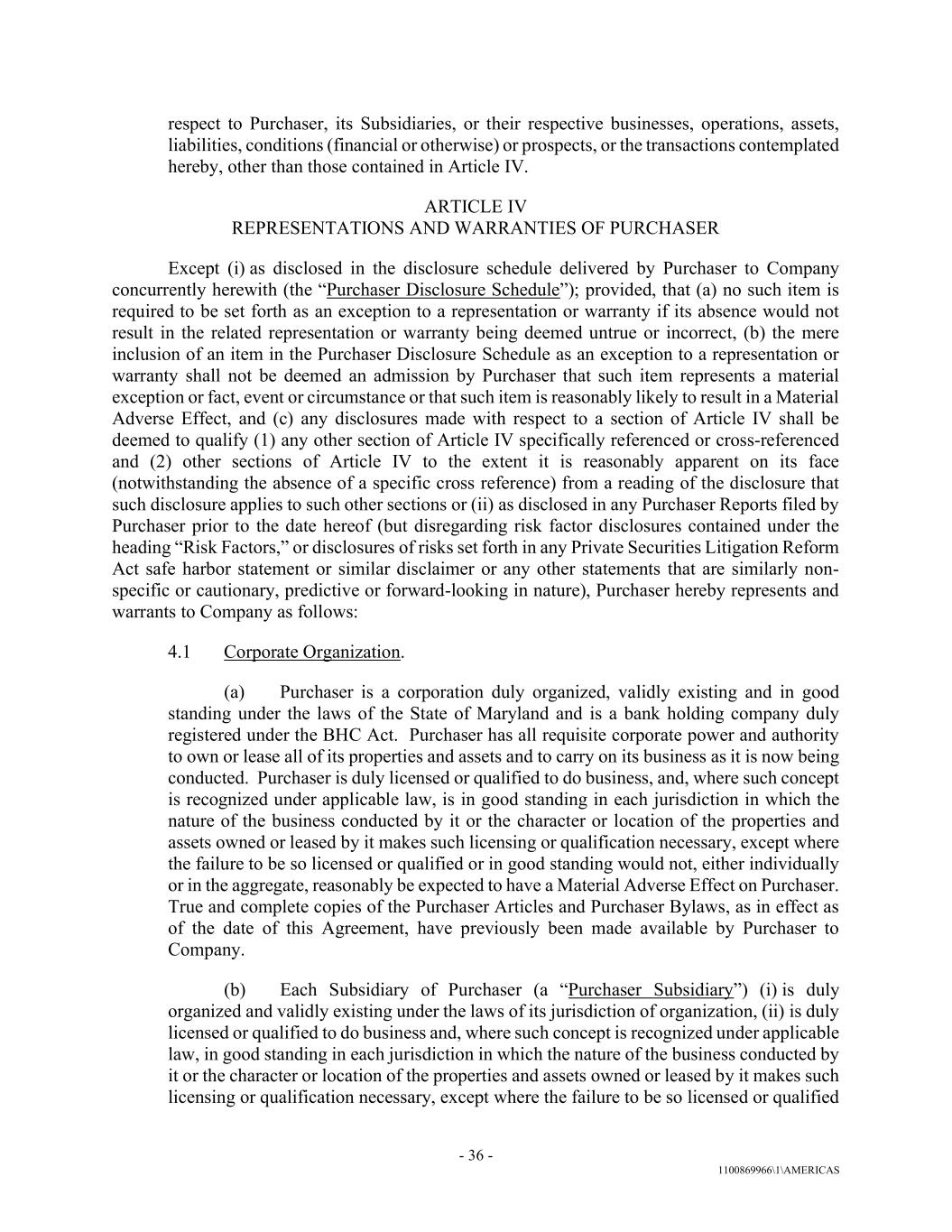 - 36 - 1100869966\1\AMERICAS respect to Purchaser, its Subsidiaries, or their respective businesses, operations, assets, liabilities, conditions (financial or otherwise) or prospects, or the transactions contemplated hereby, other than those contained in Article IV. ARTICLE IV REPRESENTATIONS AND WARRANTIES OF PURCHASER Except (i) as disclosed in the disclosure schedule delivered by Purchaser to Company concurrently herewith (the “Purchaser Disclosure Schedule”); provided, that (a) no such item is required to be set forth as an exception to a representation or warranty if its absence would not result in the related representation or warranty being deemed untrue or incorrect, (b) the mere inclusion of an item in the Purchaser Disclosure Schedule as an exception to a representation or warranty shall not be deemed an admission by Purchaser that such item represents a material exception or fact, event or circumstance or that such item is reasonably likely to result in a Material Adverse Effect, and (c) any disclosures made with respect to a section of Article IV shall be deemed to qualify (1) any other section of Article IV specifically referenced or cross-referenced and (2) other sections of Article IV to the extent it is reasonably apparent on its face (notwithstanding the absence of a specific cross reference) from a reading of the disclosure that such disclosure applies to such other sections or (ii) as disclosed in any Purchaser Reports filed by Purchaser prior to the date hereof (but disregarding risk factor disclosures contained under the heading “Risk Factors,” or disclosures of risks set forth in any Private Securities Litigation Reform Act safe harbor statement or similar disclaimer or any other statements that are similarly non- specific or cautionary, predictive or forward-looking in nature), Purchaser hereby represents and warrants to Company as follows: 4.1 Corporate Organization. (a) Purchaser is a corporation duly organized, validly existing and in good standing under the laws of the State of Maryland and is a bank holding company duly registered under the BHC Act. Purchaser has all requisite corporate power and authority to own or lease all of its properties and assets and to carry on its business as it is now being conducted. Purchaser is duly licensed or qualified to do business, and, where such concept is recognized under applicable law, is in good standing in each jurisdiction in which the nature of the business conducted by it or the character or location of the properties and assets owned or leased by it makes such licensing or qualification necessary, except where the failure to be so licensed or qualified or in good standing would not, either individually or in the aggregate, reasonably be expected to have a Material Adverse Effect on Purchaser. True and complete copies of the Purchaser Articles and Purchaser Bylaws, as in effect as of the date of this Agreement, have previously been made available by Purchaser to Company. (b) Each Subsidiary of Purchaser (a “Purchaser Subsidiary”) (i) is duly organized and validly existing under the laws of its jurisdiction of organization, (ii) is duly licensed or qualified to do business and, where such concept is recognized under applicable law, in good standing in each jurisdiction in which the nature of the business conducted by it or the character or location of the properties and assets owned or leased by it makes such licensing or qualification necessary, except where the failure to be so licensed or qualified
