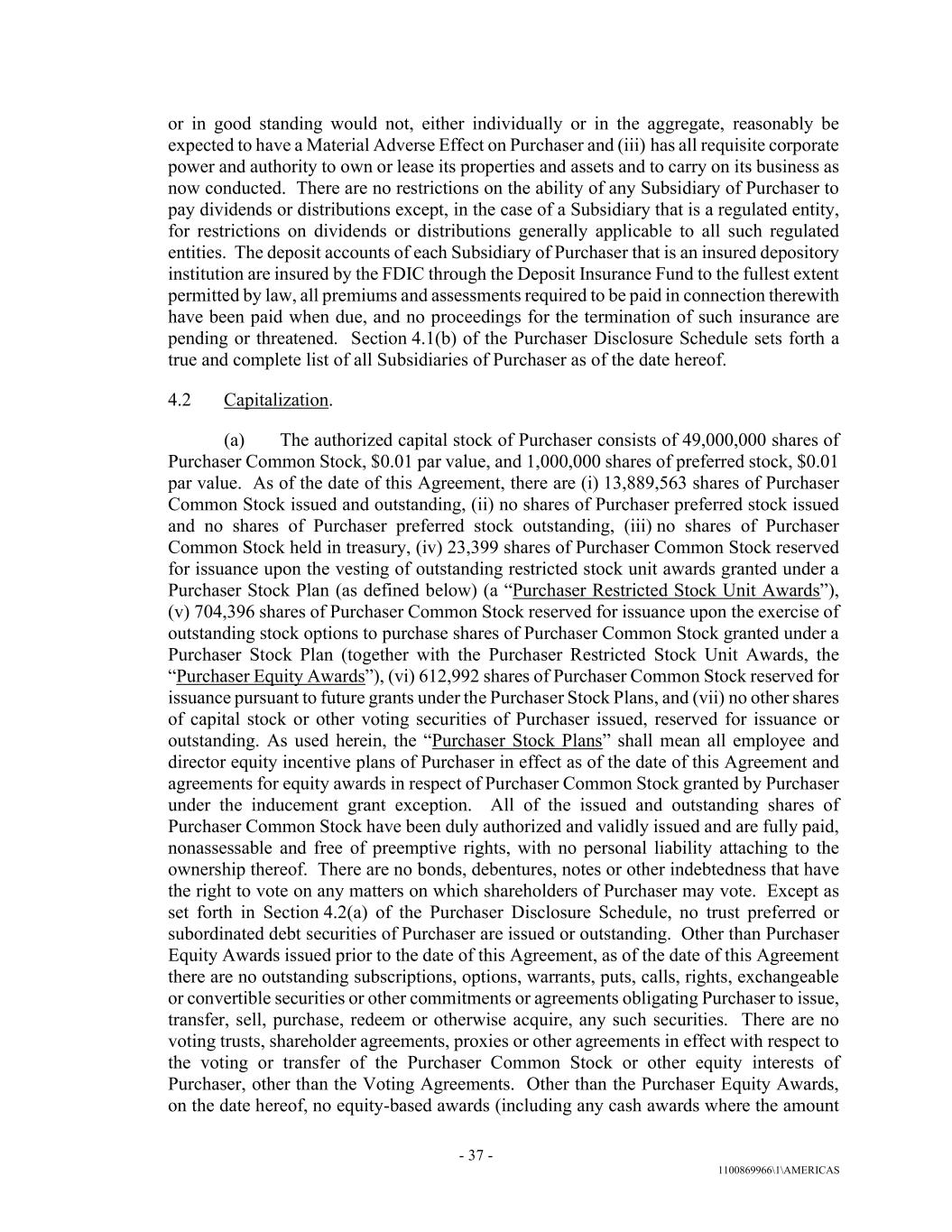 - 37 - 1100869966\1\AMERICAS or in good standing would not, either individually or in the aggregate, reasonably be expected to have a Material Adverse Effect on Purchaser and (iii) has all requisite corporate power and authority to own or lease its properties and assets and to carry on its business as now conducted. There are no restrictions on the ability of any Subsidiary of Purchaser to pay dividends or distributions except, in the case of a Subsidiary that is a regulated entity, for restrictions on dividends or distributions generally applicable to all such regulated entities. The deposit accounts of each Subsidiary of Purchaser that is an insured depository institution are insured by the FDIC through the Deposit Insurance Fund to the fullest extent permitted by law, all premiums and assessments required to be paid in connection therewith have been paid when due, and no proceedings for the termination of such insurance are pending or threatened. Section 4.1(b) of the Purchaser Disclosure Schedule sets forth a true and complete list of all Subsidiaries of Purchaser as of the date hereof. 4.2 Capitalization. (a) The authorized capital stock of Purchaser consists of 49,000,000 shares of Purchaser Common Stock, $0.01 par value, and 1,000,000 shares of preferred stock, $0.01 par value. As of the date of this Agreement, there are (i) 13,889,563 shares of Purchaser Common Stock issued and outstanding, (ii) no shares of Purchaser preferred stock issued and no shares of Purchaser preferred stock outstanding, (iii) no shares of Purchaser Common Stock held in treasury, (iv) 23,399 shares of Purchaser Common Stock reserved for issuance upon the vesting of outstanding restricted stock unit awards granted under a Purchaser Stock Plan (as defined below) (a “Purchaser Restricted Stock Unit Awards”), (v) 704,396 shares of Purchaser Common Stock reserved for issuance upon the exercise of outstanding stock options to purchase shares of Purchaser Common Stock granted under a Purchaser Stock Plan (together with the Purchaser Restricted Stock Unit Awards, the “Purchaser Equity Awards”), (vi) 612,992 shares of Purchaser Common Stock reserved for issuance pursuant to future grants under the Purchaser Stock Plans, and (vii) no other shares of capital stock or other voting securities of Purchaser issued, reserved for issuance or outstanding. As used herein, the “Purchaser Stock Plans” shall mean all employee and director equity incentive plans of Purchaser in effect as of the date of this Agreement and agreements for equity awards in respect of Purchaser Common Stock granted by Purchaser under the inducement grant exception. All of the issued and outstanding shares of Purchaser Common Stock have been duly authorized and validly issued and are fully paid, nonassessable and free of preemptive rights, with no personal liability attaching to the ownership thereof. There are no bonds, debentures, notes or other indebtedness that have the right to vote on any matters on which shareholders of Purchaser may vote. Except as set forth in Section 4.2(a) of the Purchaser Disclosure Schedule, no trust preferred or subordinated debt securities of Purchaser are issued or outstanding. Other than Purchaser Equity Awards issued prior to the date of this Agreement, as of the date of this Agreement there are no outstanding subscriptions, options, warrants, puts, calls, rights, exchangeable or convertible securities or other commitments or agreements obligating Purchaser to issue, transfer, sell, purchase, redeem or otherwise acquire, any such securities. There are no voting trusts, shareholder agreements, proxies or other agreements in effect with respect to the voting or transfer of the Purchaser Common Stock or other equity interests of Purchaser, other than the Voting Agreements. Other than the Purchaser Equity Awards, on the date hereof, no equity-based awards (including any cash awards where the amount
